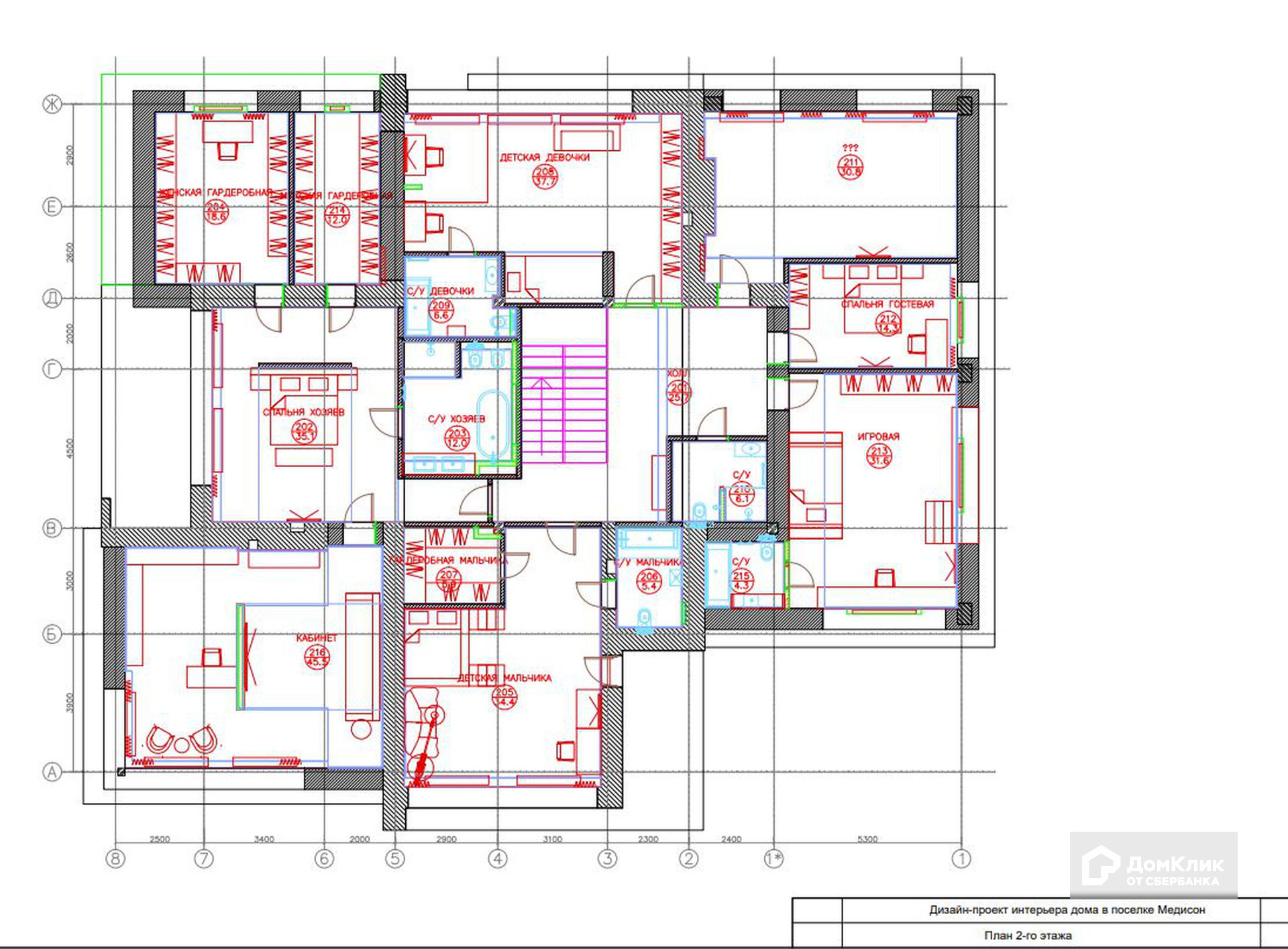 2-ой уровень: 2 детские комнаты, игровая, кабинет, 3 спальни, женская и мужская гардеробная, 3 ванные комнаты