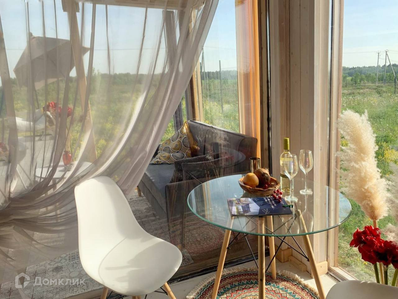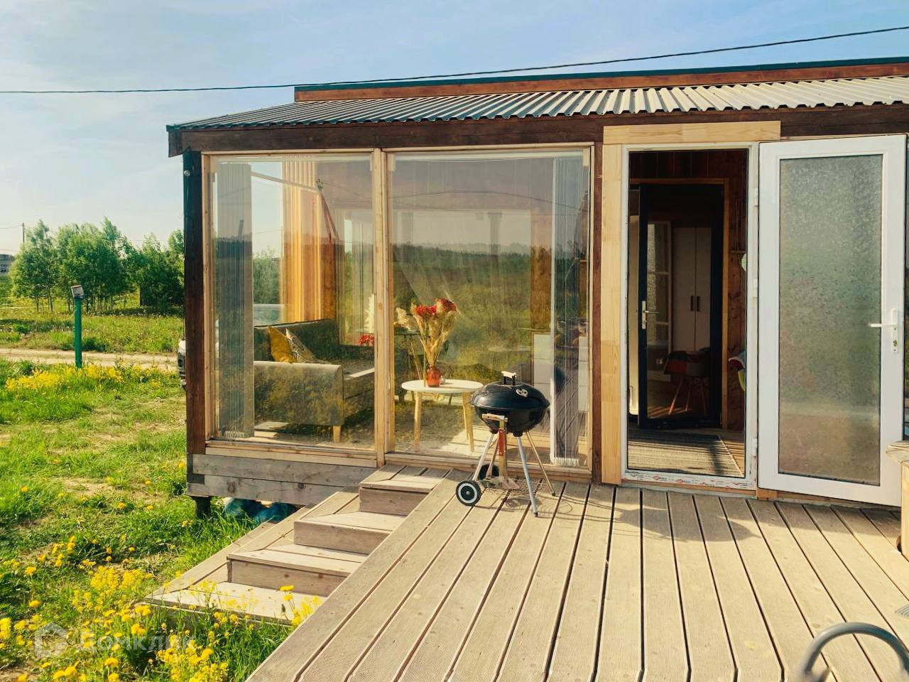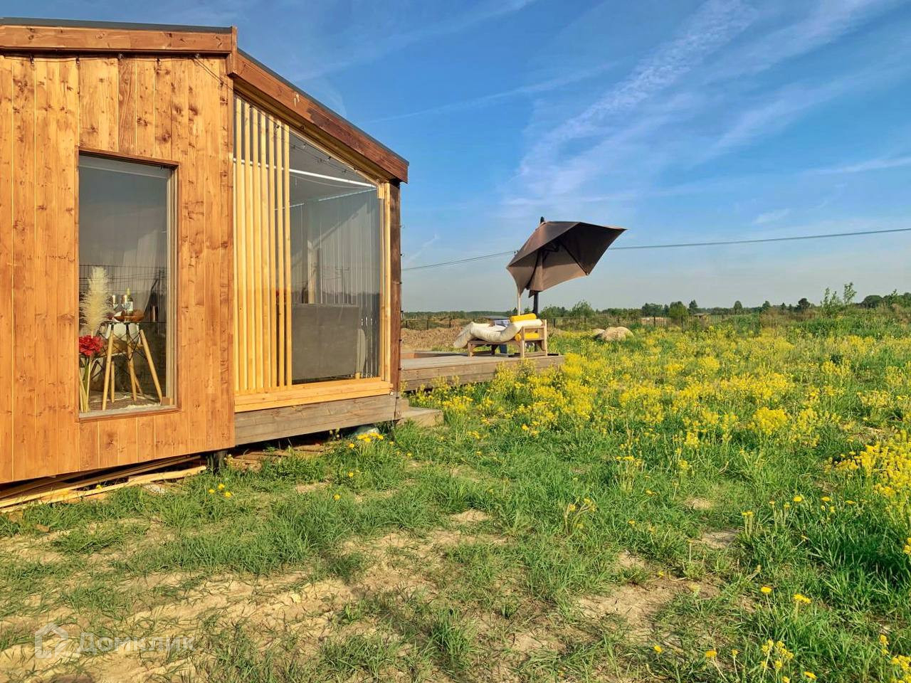 Для круглогодичного проживания-Каркасный, Утеплен, выполнено панорамное остекление-открывается шикарный вид на поле с лошадками и лес.