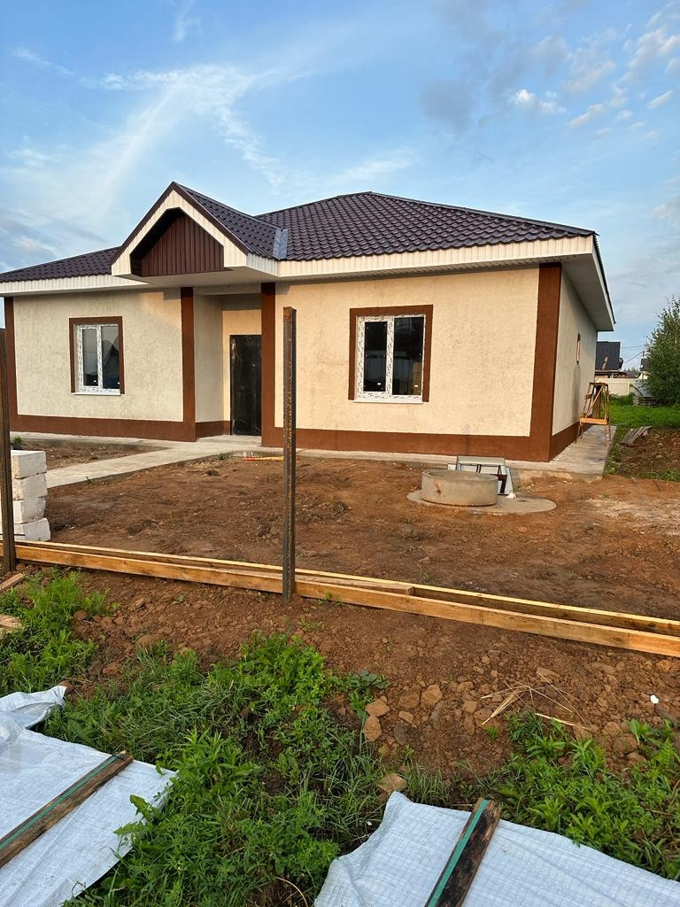 Пол монолитная плита, в доме сделанна разводка элекричества, отопления, установлены радиаторы, водяной тёплый пол, стоит газовый котёл, а так же сделана штукатурка, откосы подоконники. Вода скважина, электричество, газ, септик выгребная яма(на 3 колеца по 1,5м диаметр).