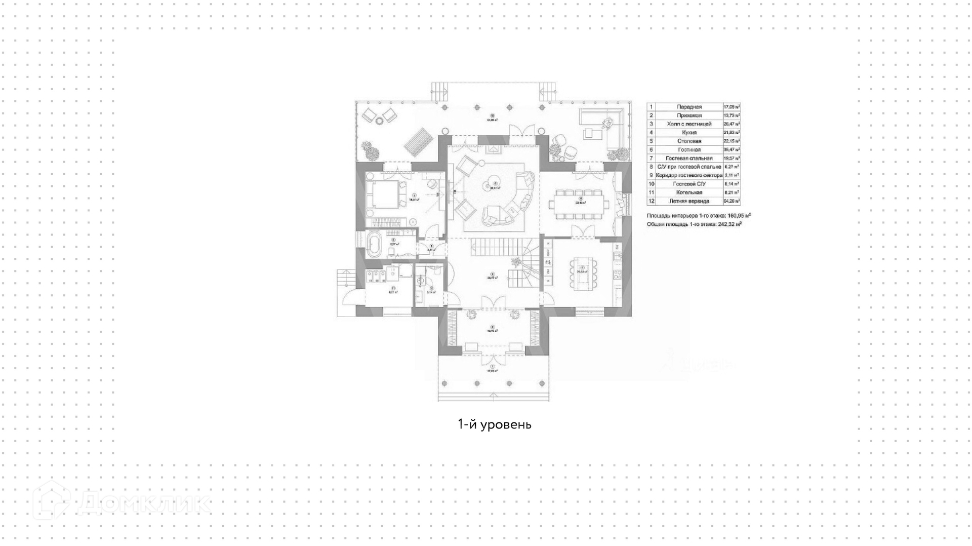 1-й уровень: прихожая, гардеробная, гостевой санузел, холл, гостиная, кухня, столовая, терраса, спальня с ванной комнатой.