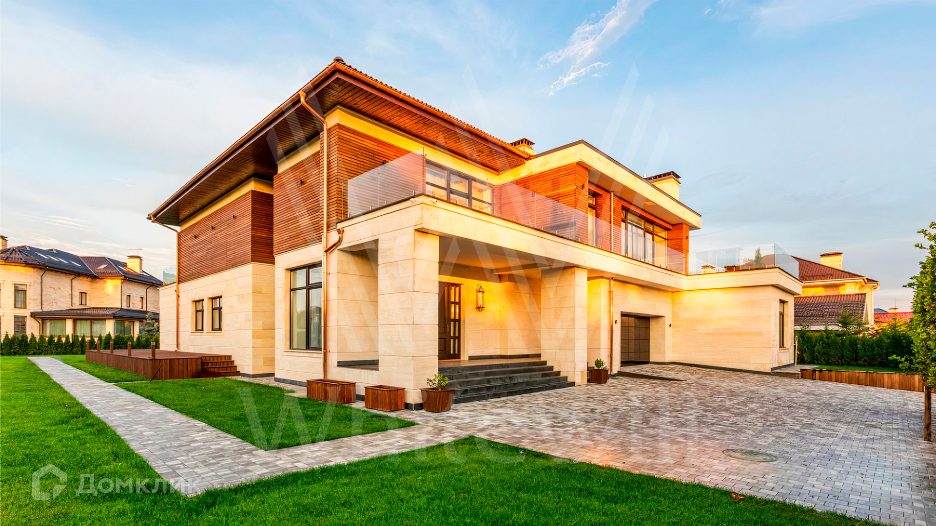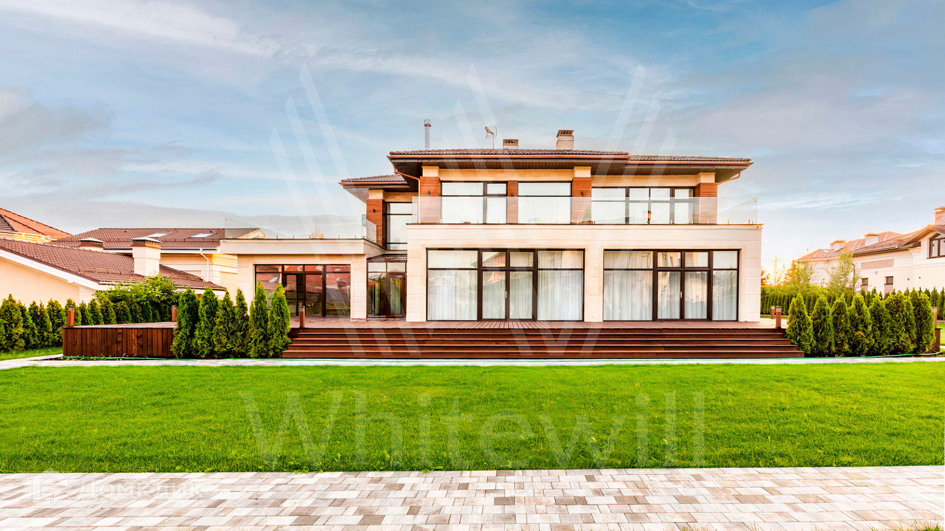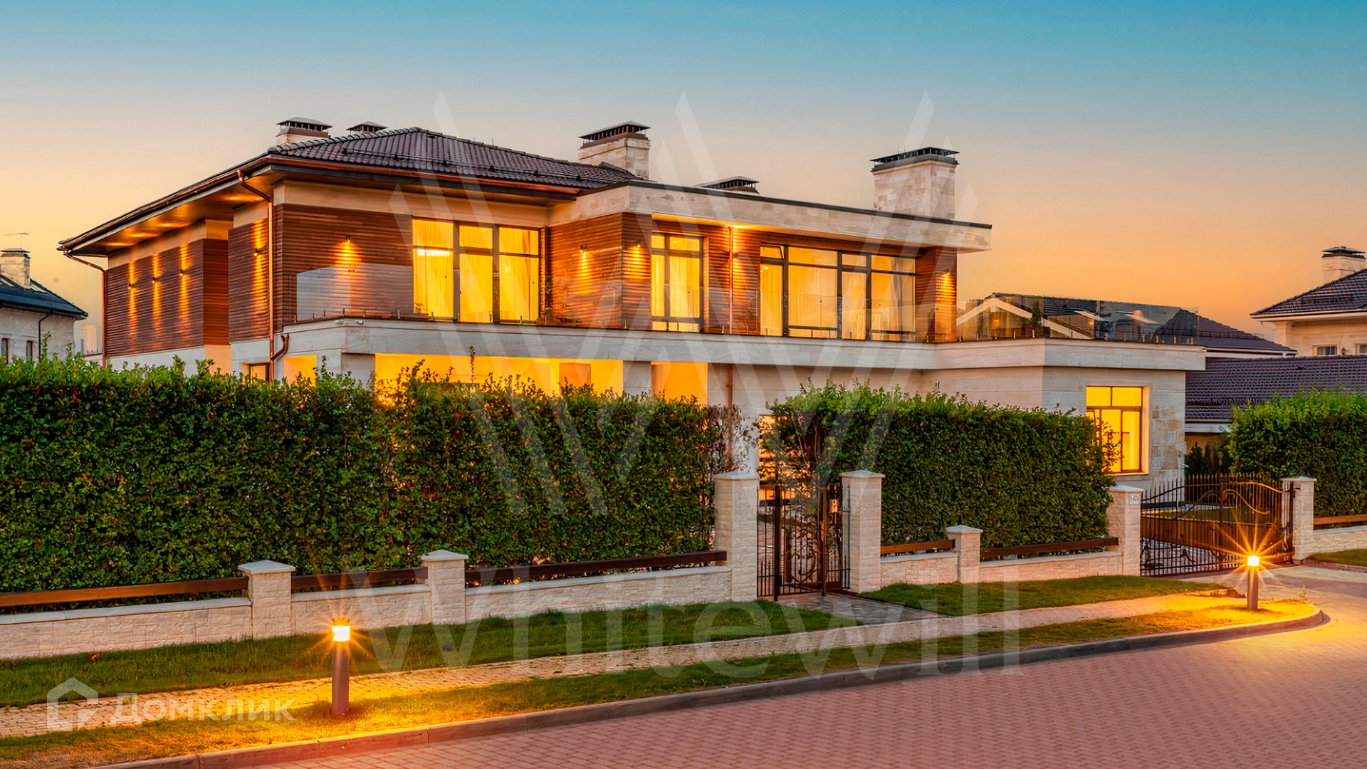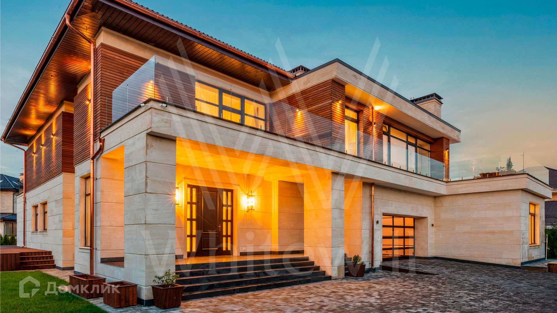 ID 9 883. Millennium Park. Загородный дом в современном стиле площадью 961 м² расположен на полевом участке 23,5 сотки. Фасад бежево-коричневого цвета облицован деревом и натуральным камнем. Интерьер оформлен в молочных оттенках с добавлением черно-коричневых цветовых акцентов. В особняке спланировали 5 спален с ванными комнатами, просторную гостиную с камином, кухню-столовую, бассейн и сауну, блок для персонала с отдельным входом, террасу. Есть гараж на 2 машины. На участке выполнен ландшафтный дизайн, высажены хвойные деревья и кустарники, вымощены дорожки.