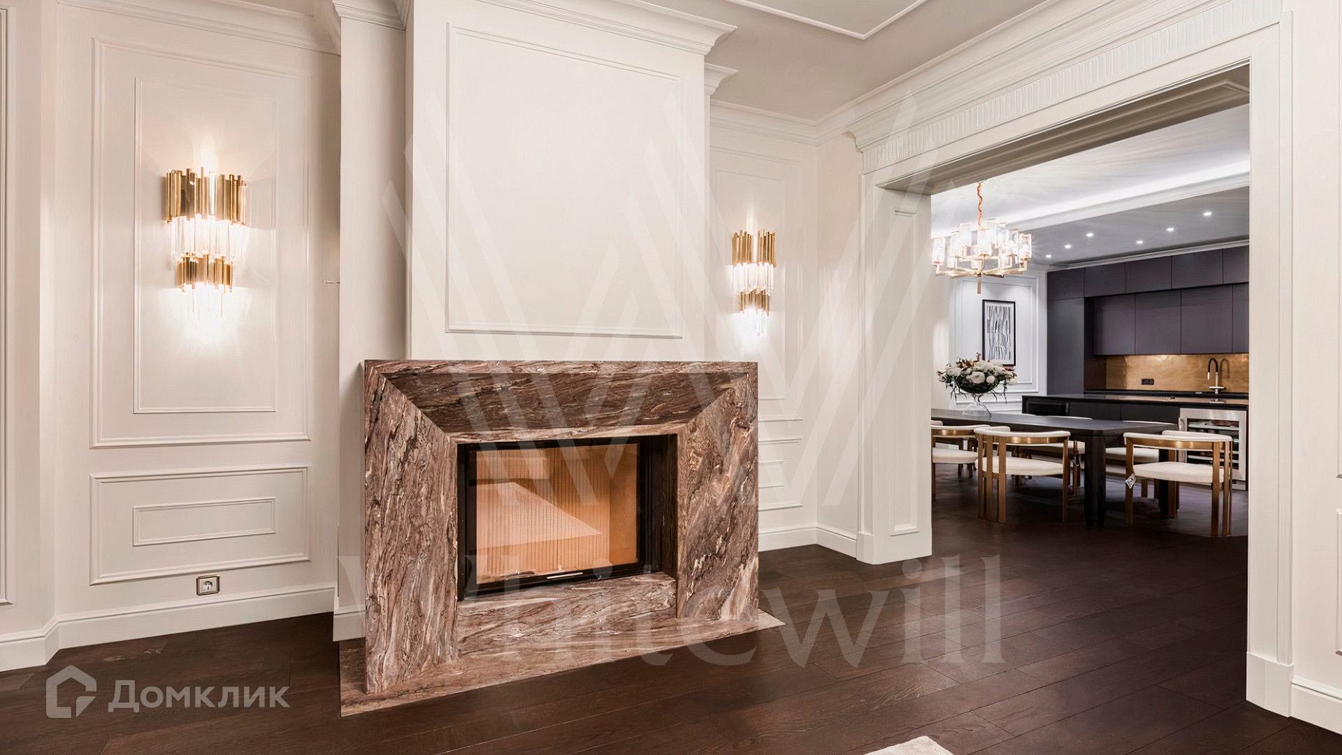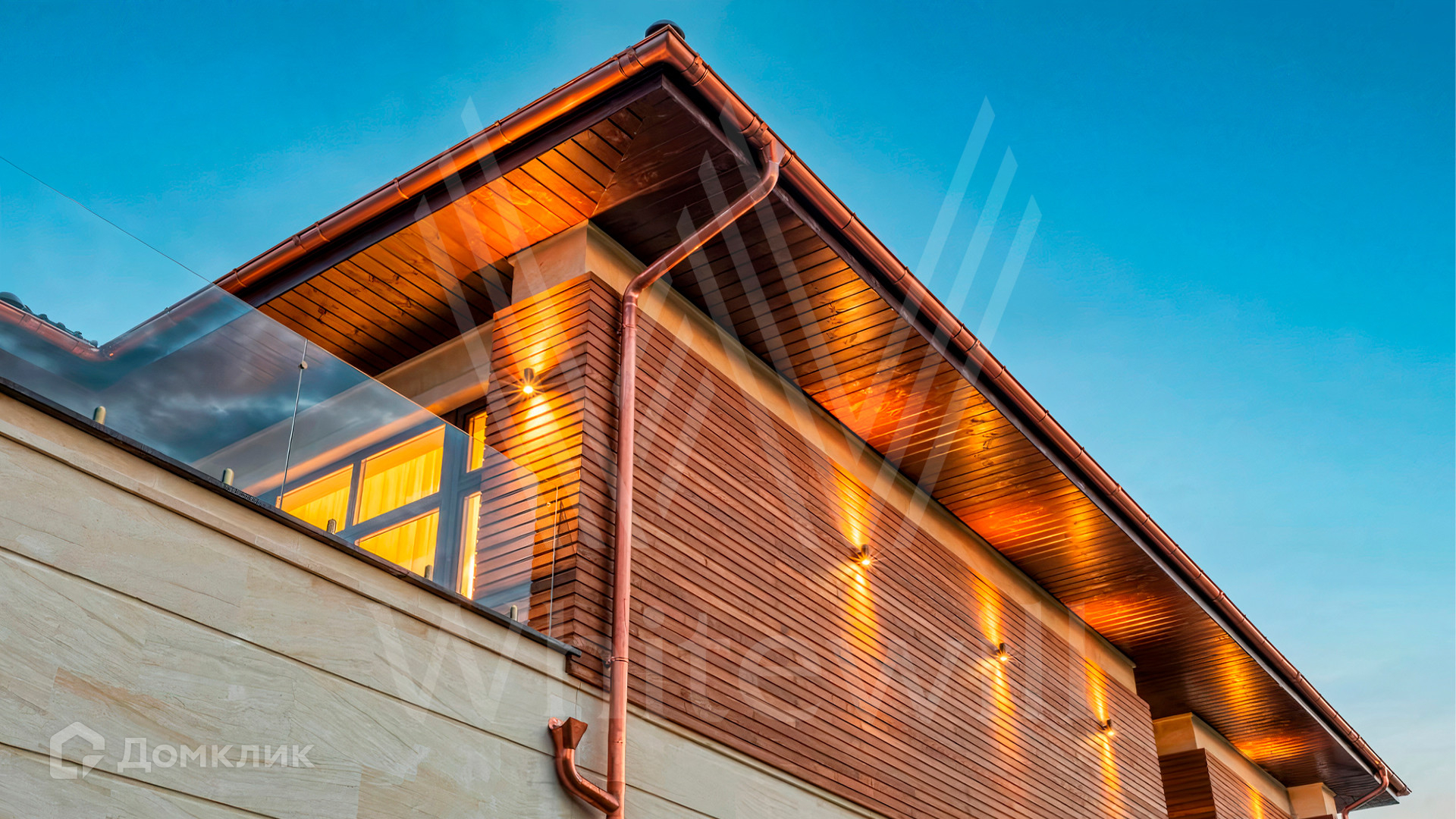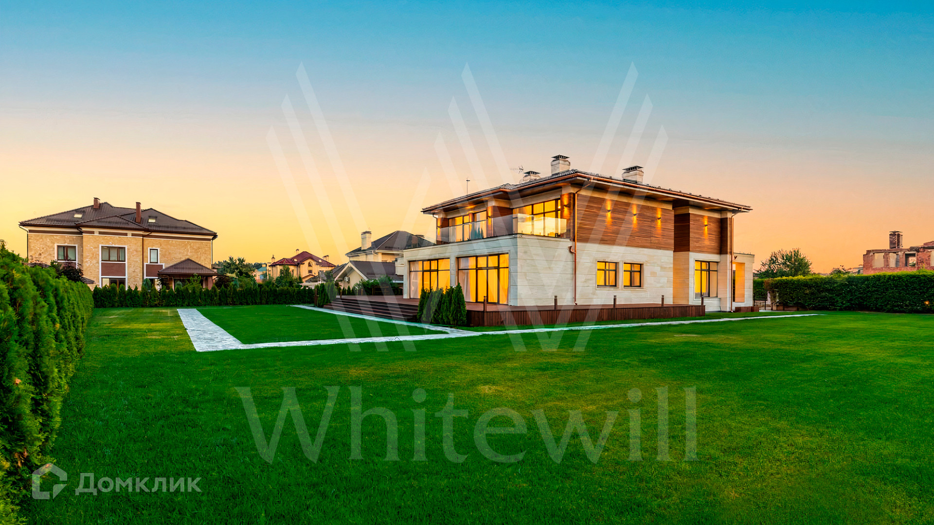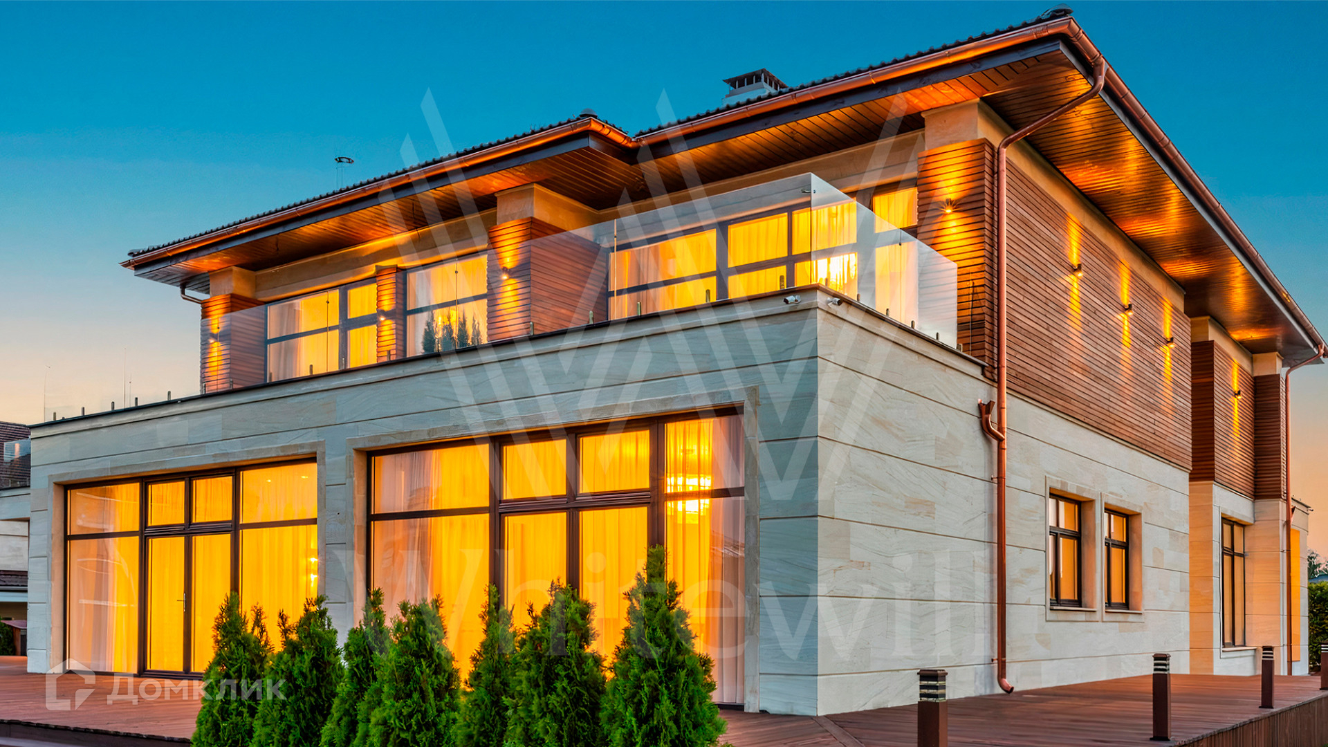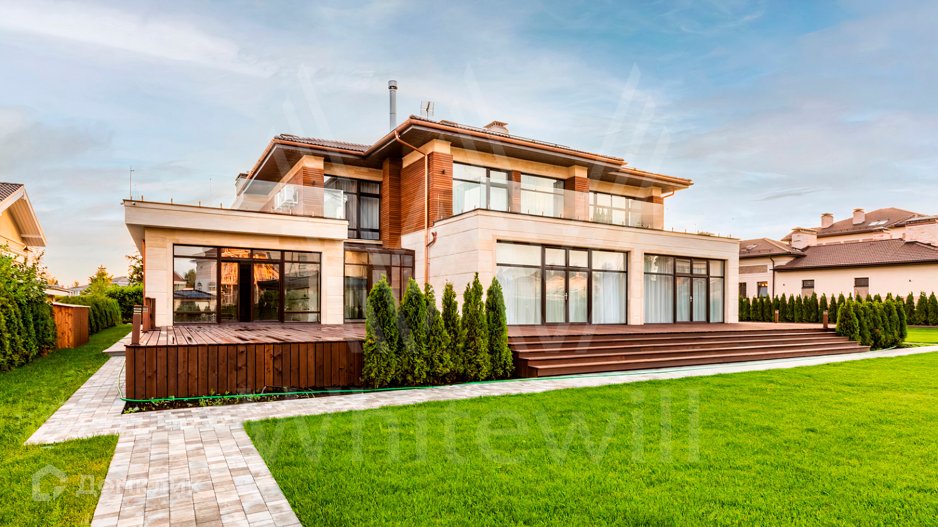 ID 9 883. Millennium Park. Загородный дом в современном стиле площадью 961 м² расположен на полевом участке 23,5 сотки. Фасад бежево-коричневого цвета облицован деревом и натуральным камнем. Интерьер оформлен в молочных оттенках с добавлением черно-коричневых цветовых акцентов. В особняке спланировали 5 спален с ванными комнатами, просторную гостиную с камином, кухню-столовую, бассейн и сауну, блок для персонала с отдельным входом, террасу. Есть гараж на 2 машины. На участке выполнен ландшафтный дизайн, высажены хвойные деревья и кустарники, вымощены дорожки.