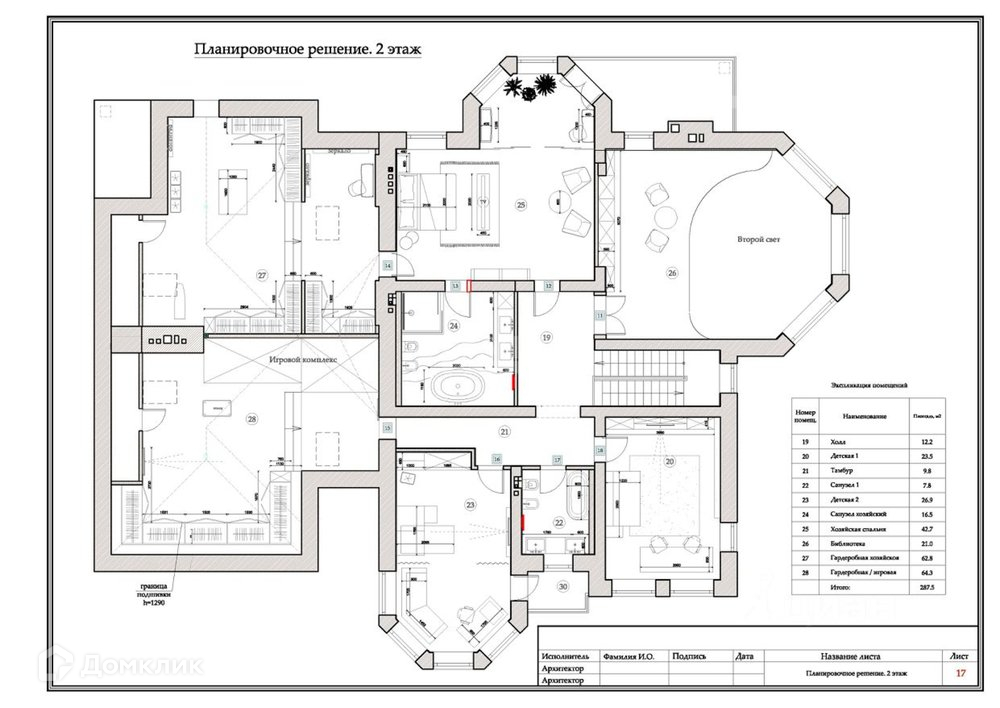 2 этаж - спальня с балконом, гардеробной и SPA зоной, 2 детских спальни с с/у и балконом, игровая комната, библиотека.