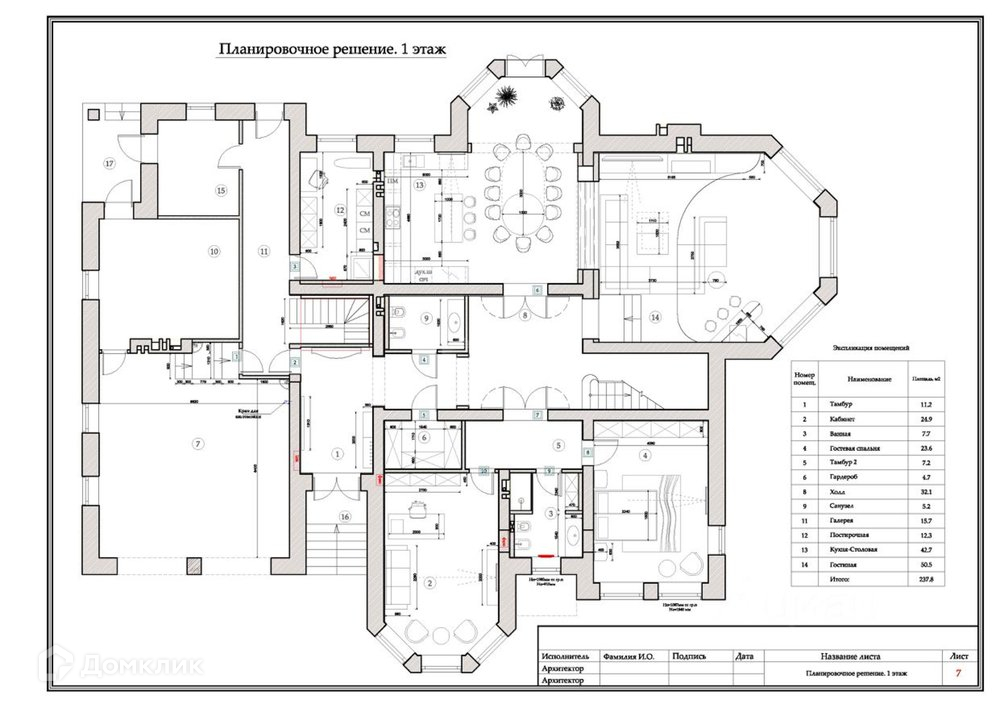 1 этаж - гостиная, кухня - столовая, спальня, кабинет, 2 с/у, постирочная, мастерская и веранда, гараж на 2 м/м.