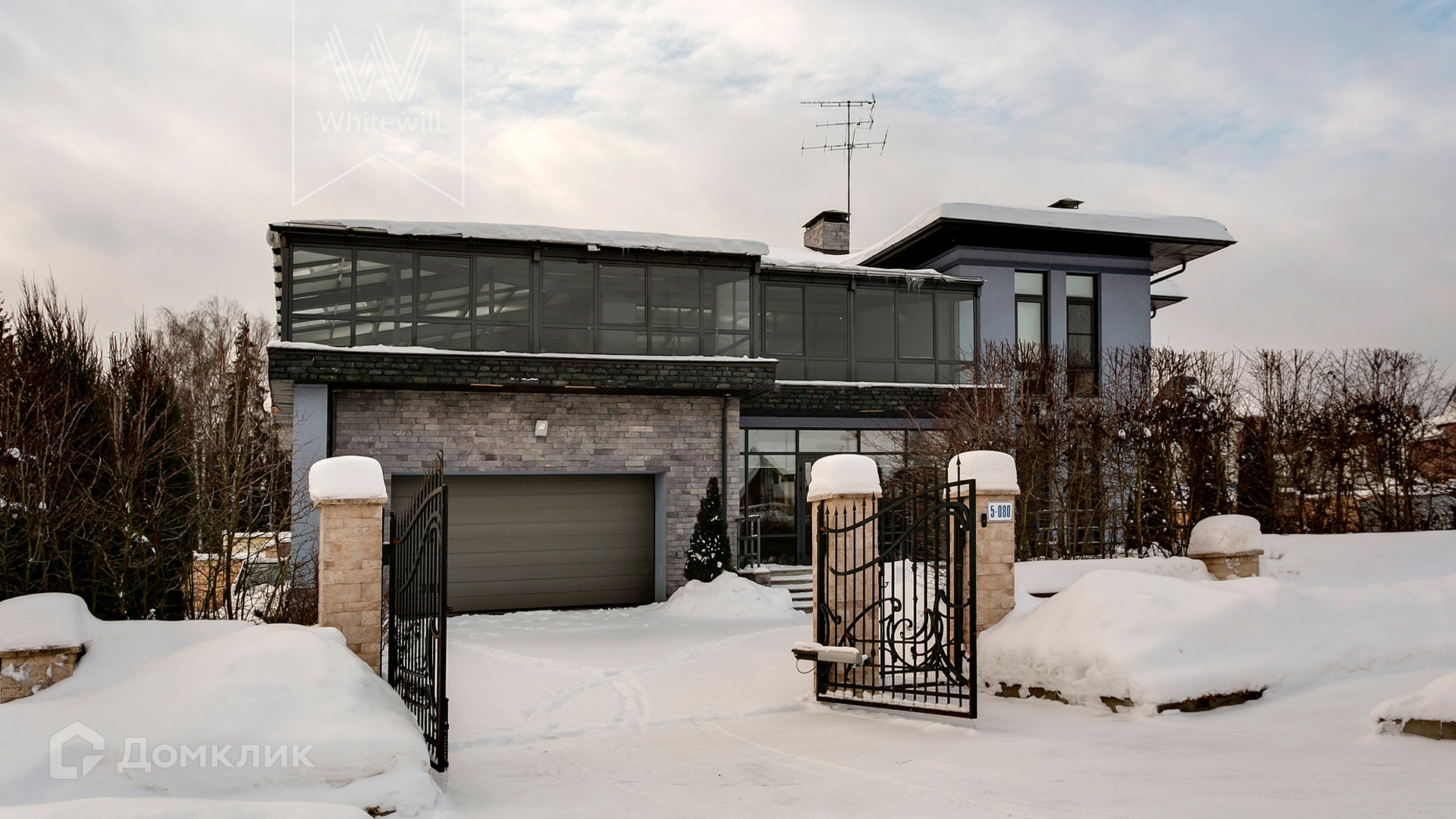 ID 9 928. Millennium Park. Загородный дом в стиле «фьюжн» площадью 560 м² расположен на полевом участке 21 сотка. Фасад облицован серой штукатуркой, клинкерным кирпичом, установлено панорамное остекление. Интерьер оформлен в светлых холодных оттенках. В особняке спланировали 5 спален, просторную кухню-гостиную с камином, спортзал и гараж. На участке выполнен ландшафтный дизайн, высажены хвойные деревья.