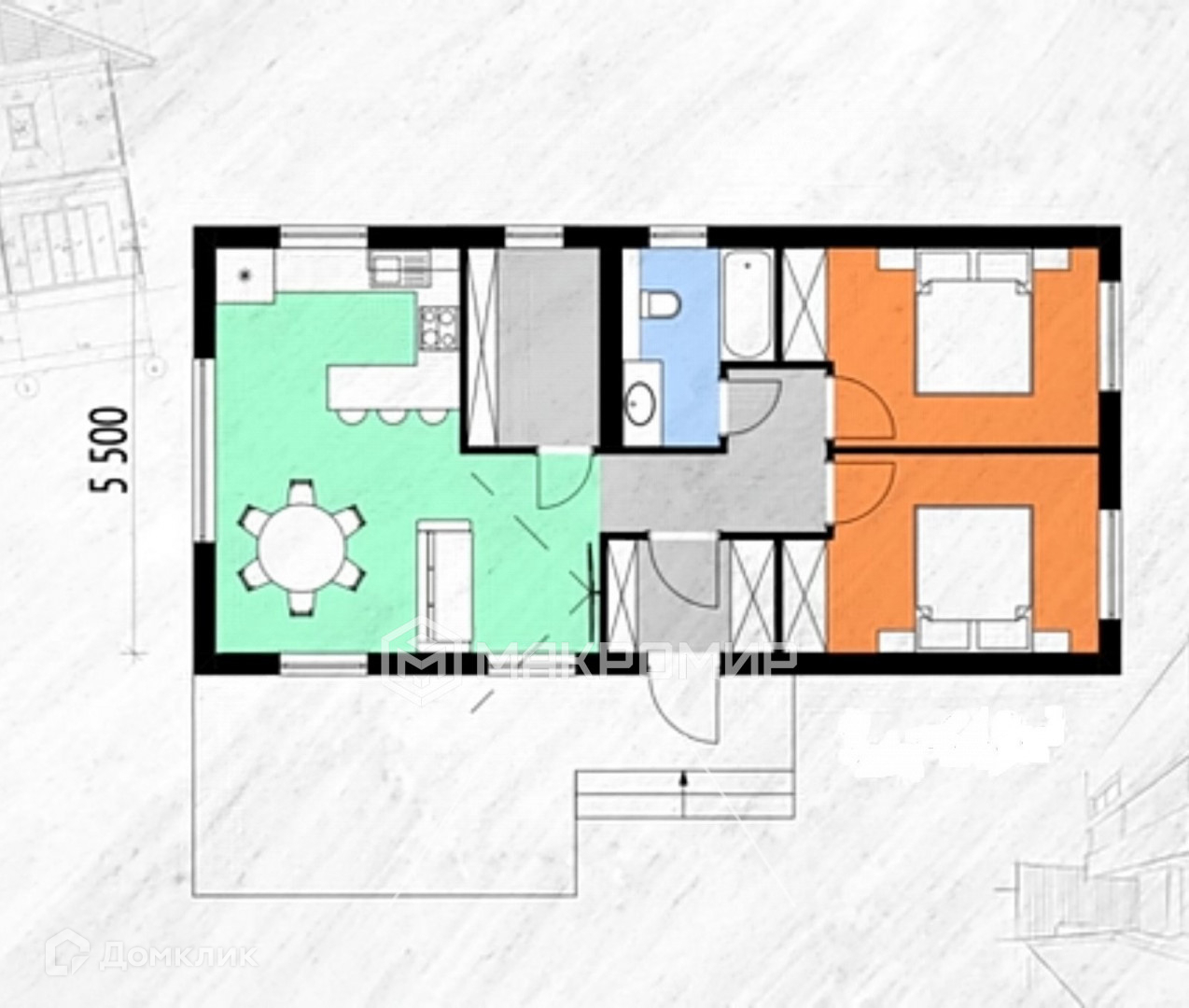 Две изолированные спальни по 11 и 12 м2. и кухня -гостиная.