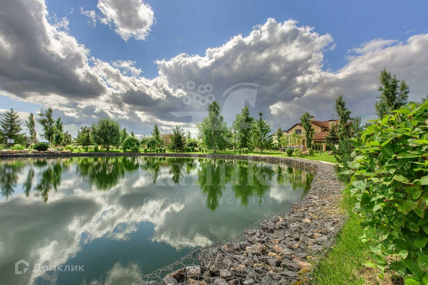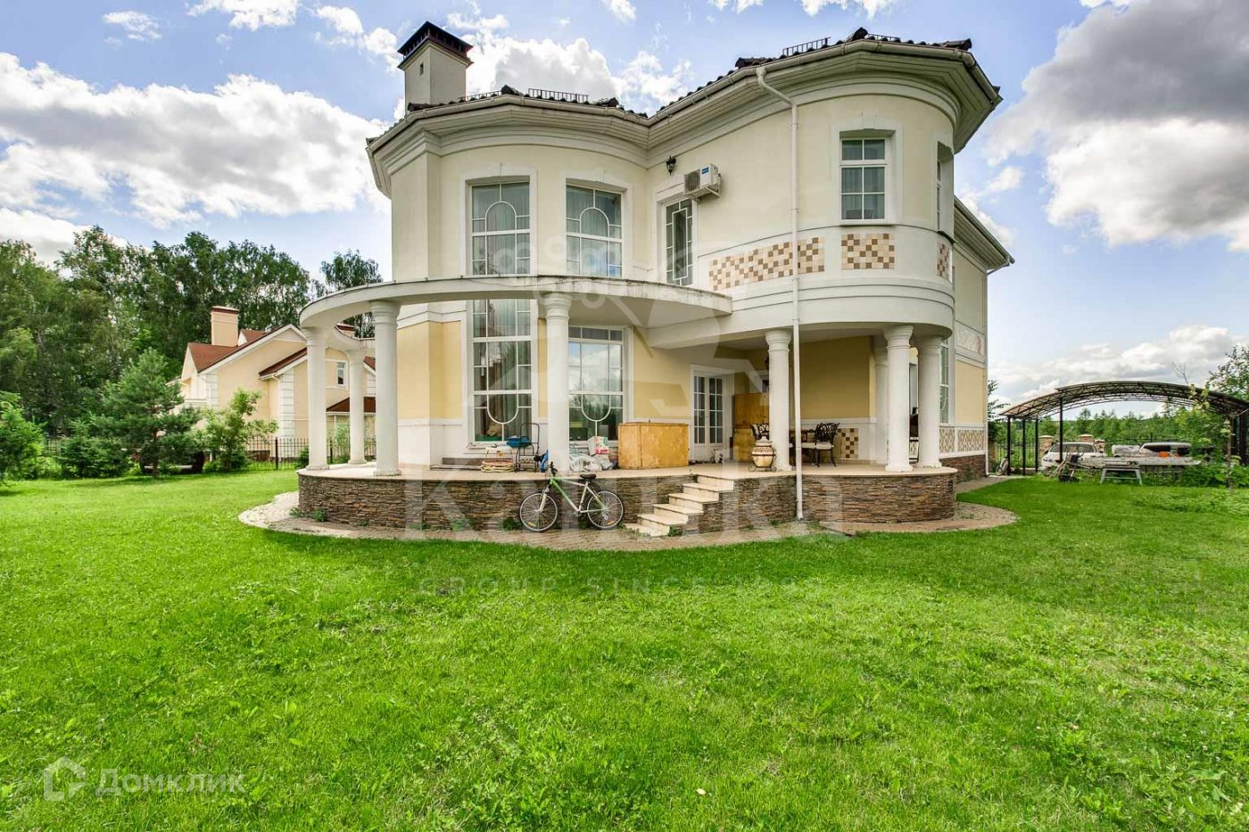 Участок с парковым ландшафтным дизайном: высажены декоративные и садовые деревья, проложены дорожки.  На территории расположен навес на 2 м/м.