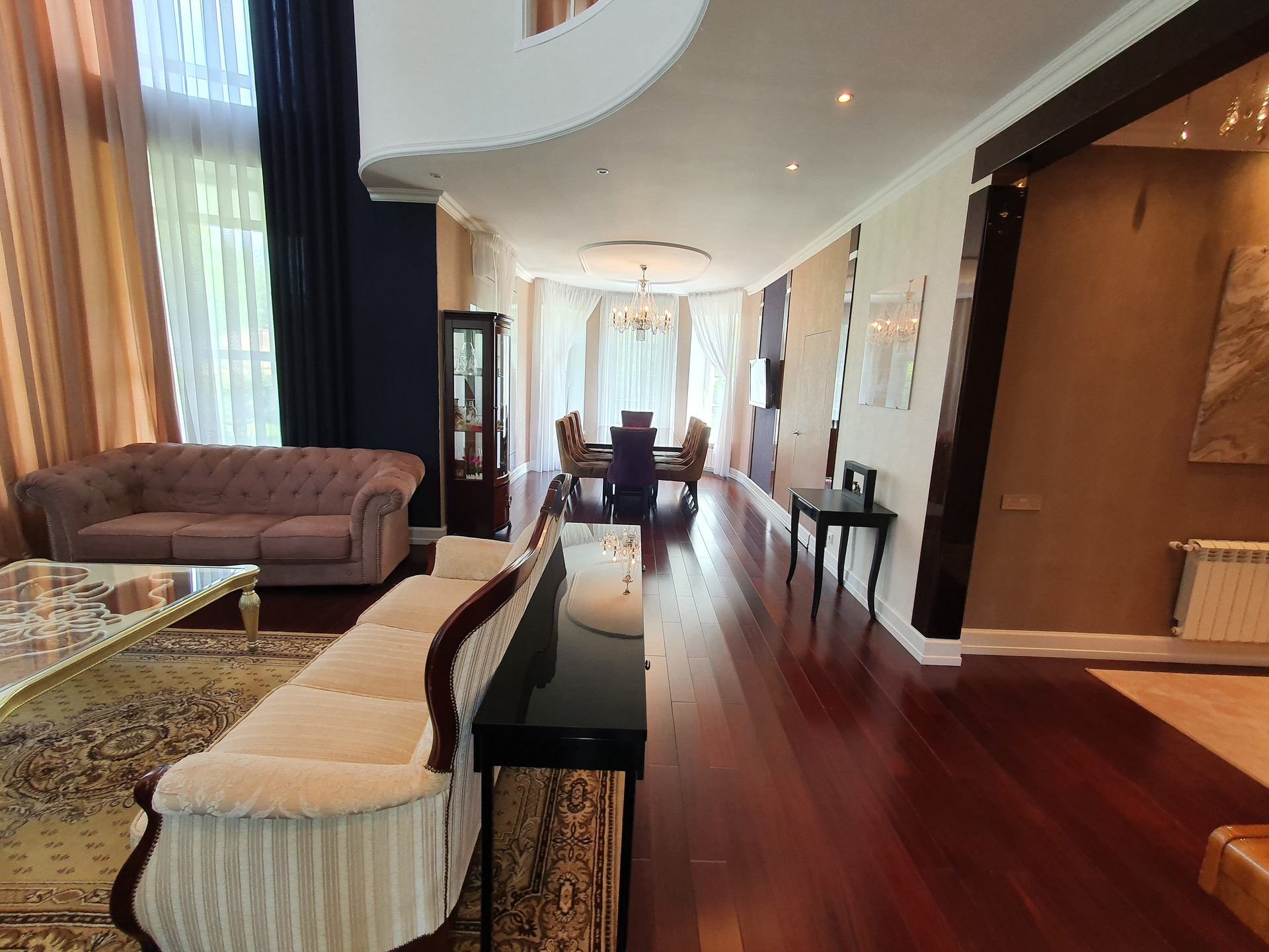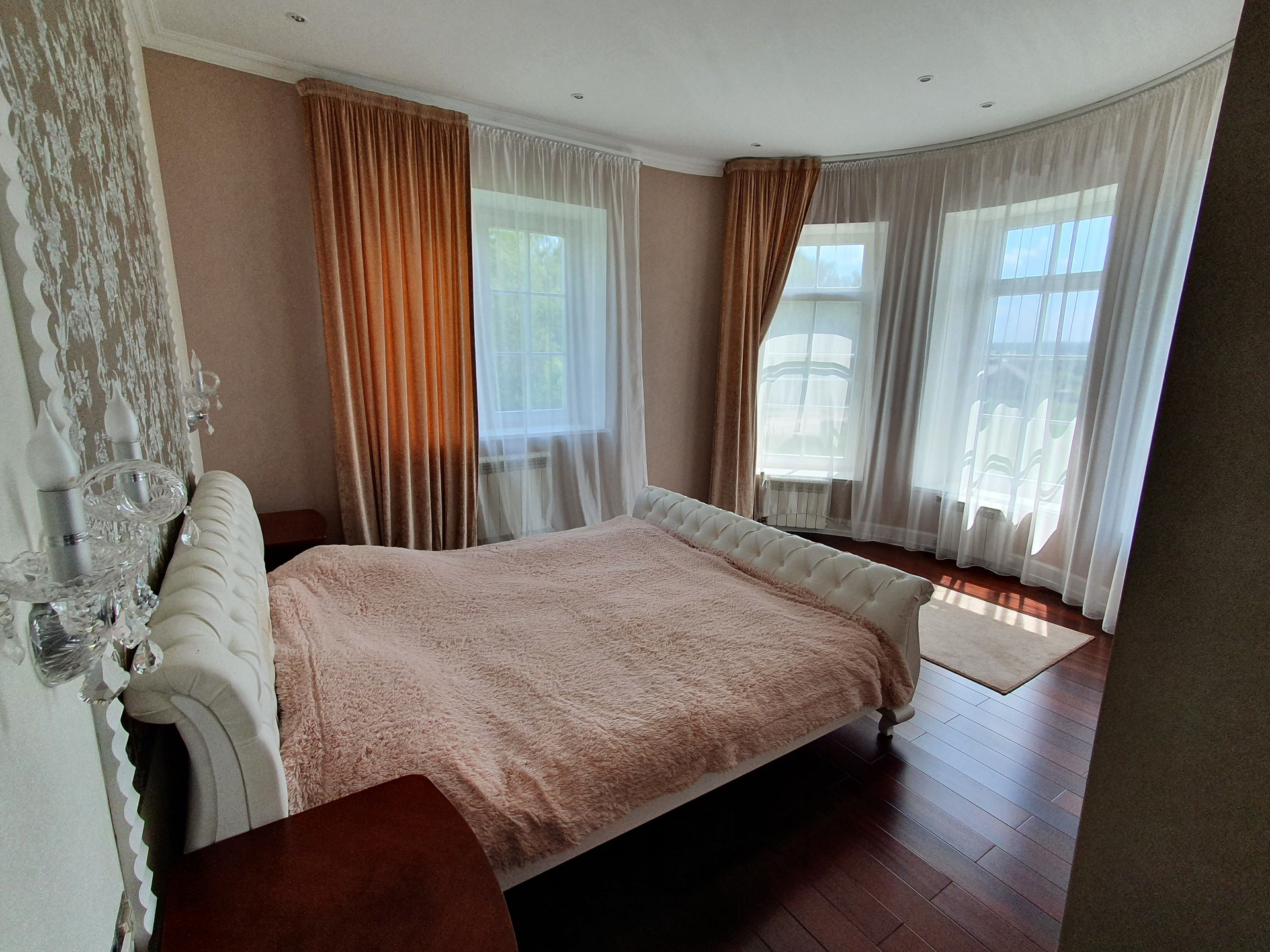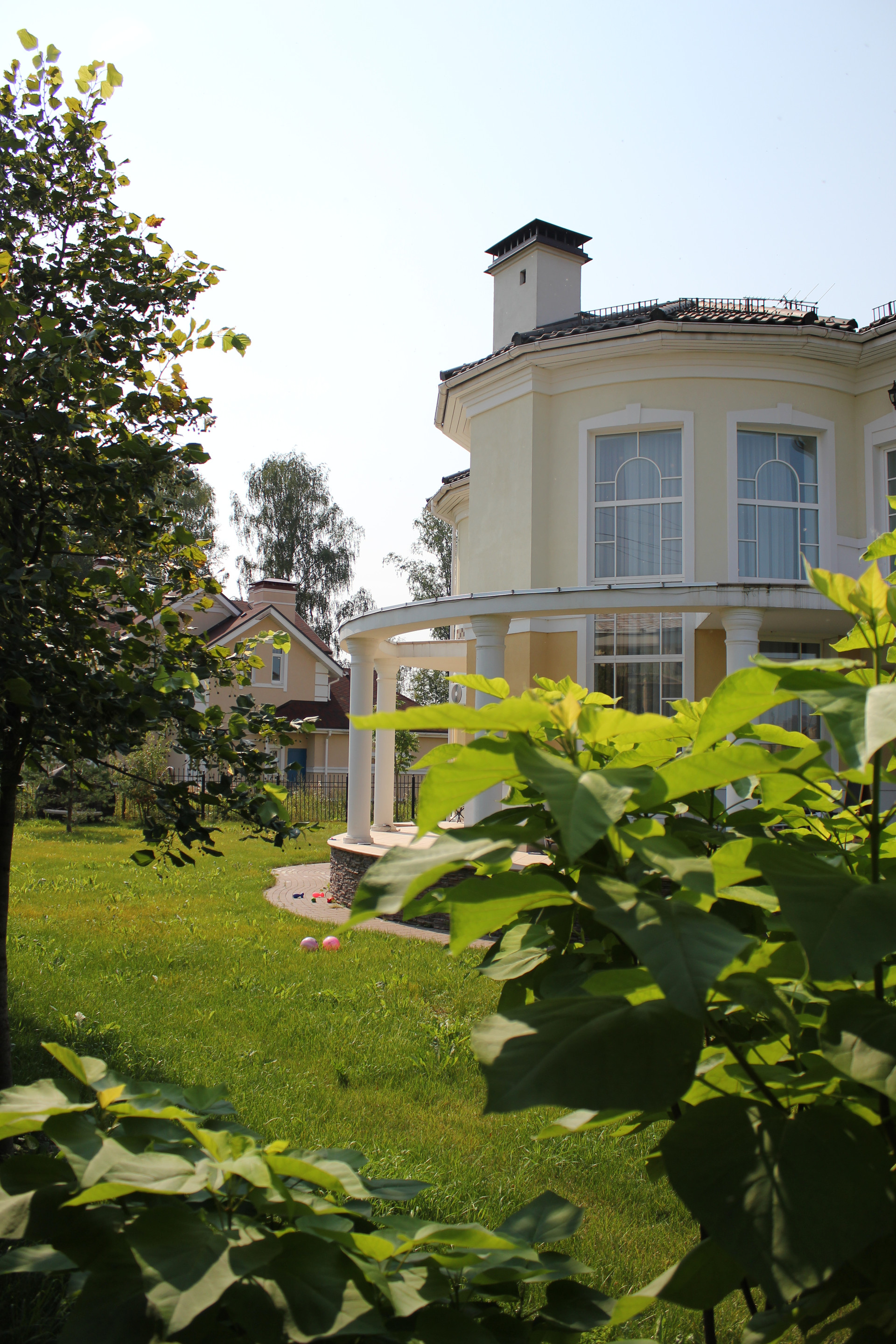 Дом с колоннами, с полукруглыми стенами и огромной площадью остекления. На первом этаже - "общая зона", холл со вторым светом, гостиная со вторым светом и огромным действующим камином, отделанным мрамором, столовая, кухня, сауна, кабинет, санузел, гардеробная, а также, внешняя терраса. Второй этаж - "частная" зона, разделена на три независимых спальных территории, каждая из которых имеет свою отдельную ванную, свою отдельную гардеробную и балкон.