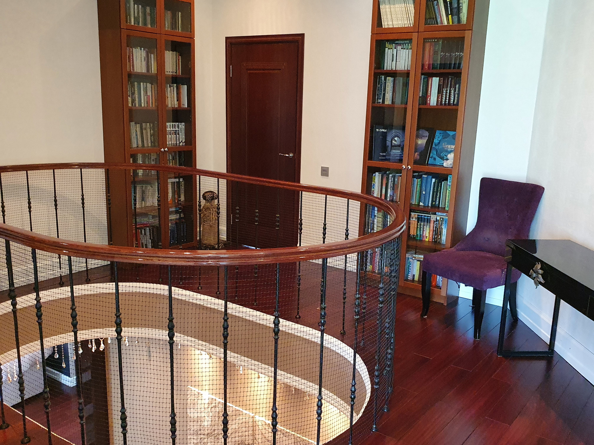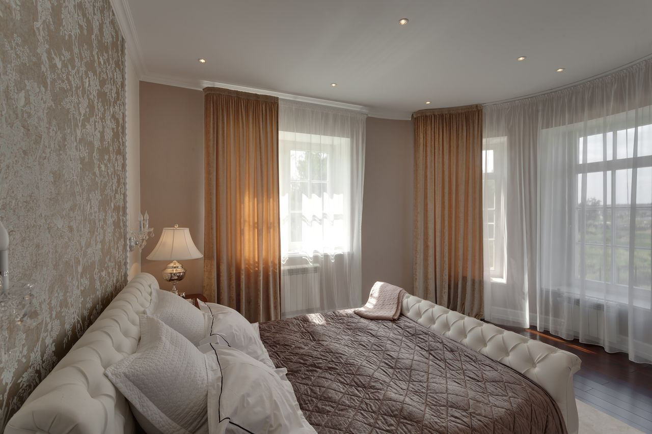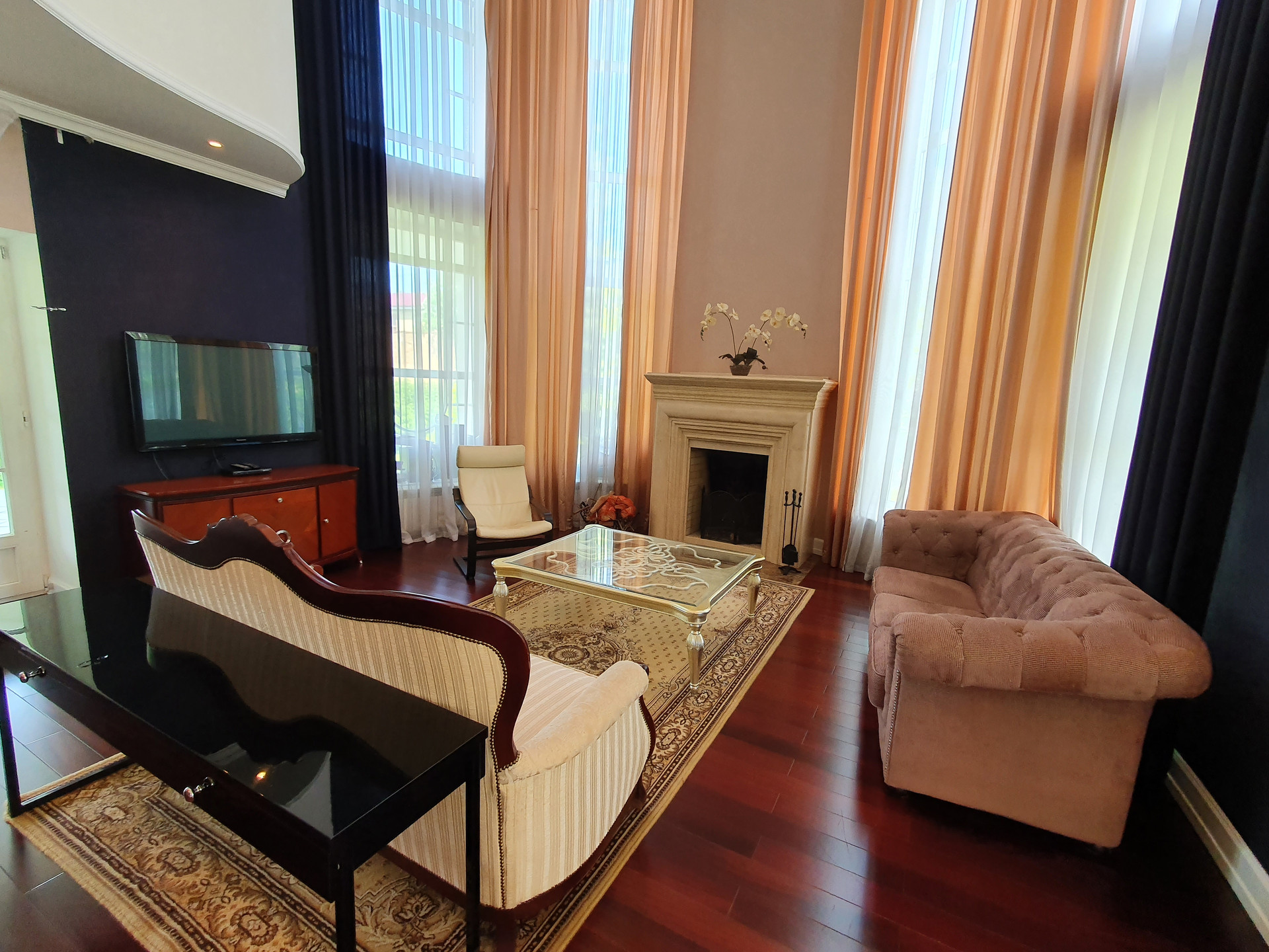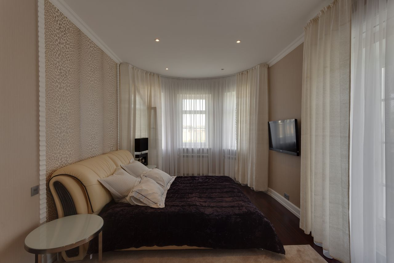 Дом с колоннами, с полукруглыми стенами и огромной площадью остекления. На первом этаже - "общая зона", холл со вторым светом, гостиная со вторым светом и огромным действующим камином, отделанным мрамором, столовая, кухня, сауна, кабинет, санузел, гардеробная, а также, внешняя терраса. Второй этаж - "частная" зона, разделена на три независимых спальных территории, каждая из которых имеет свою отдельную ванную, свою отдельную гардеробную и балкон.