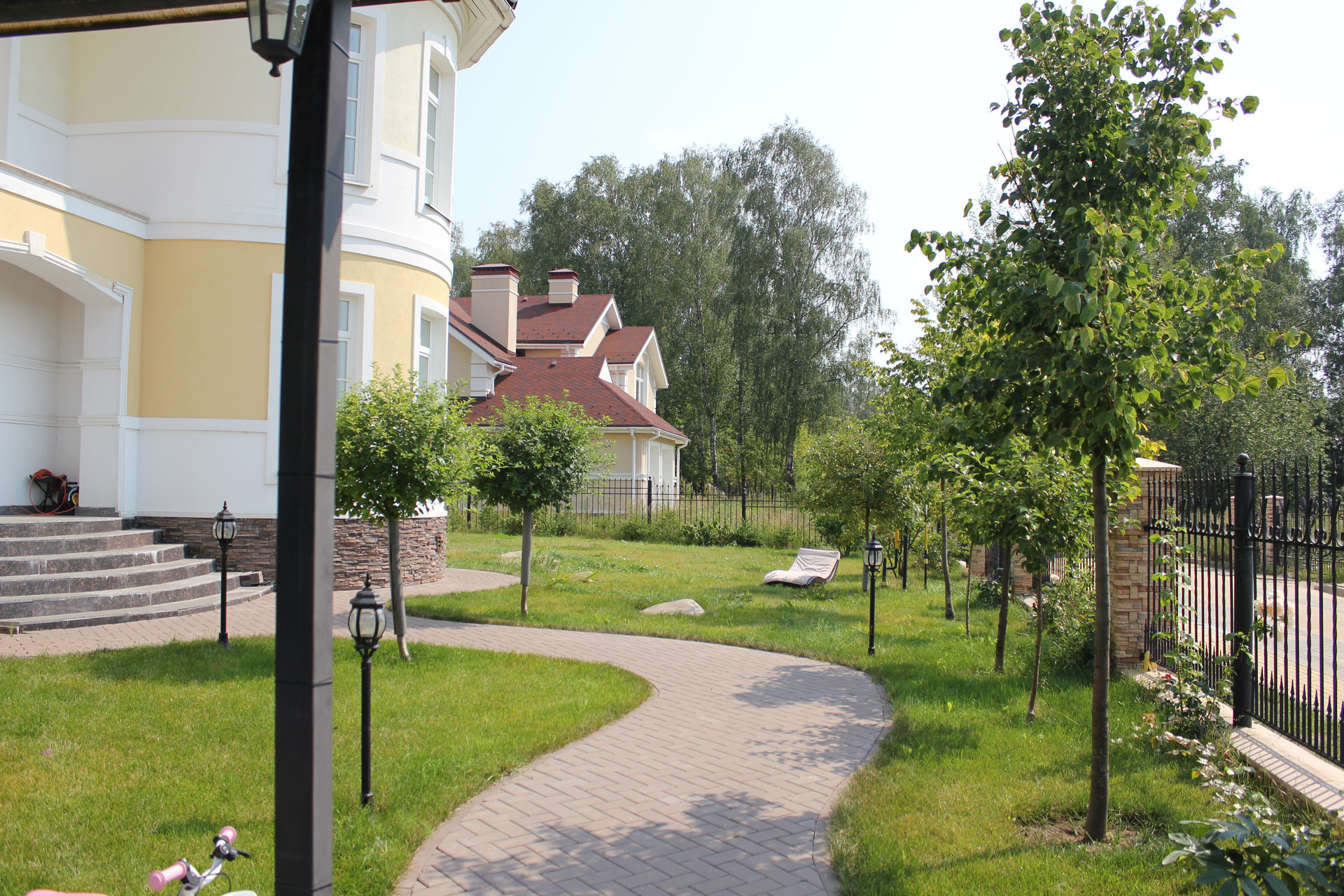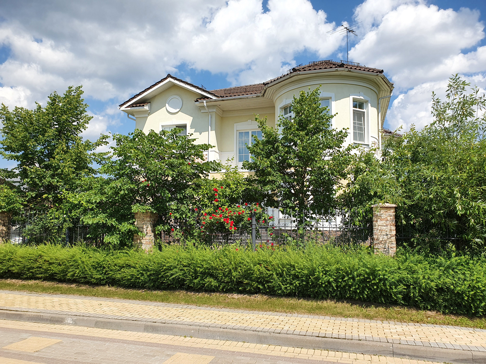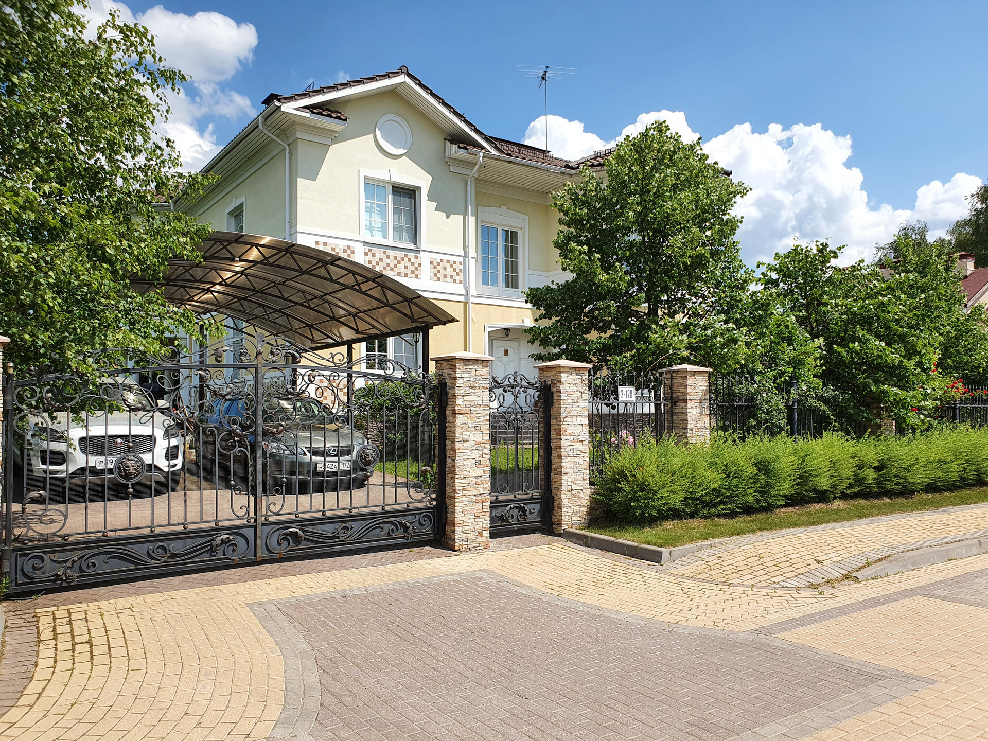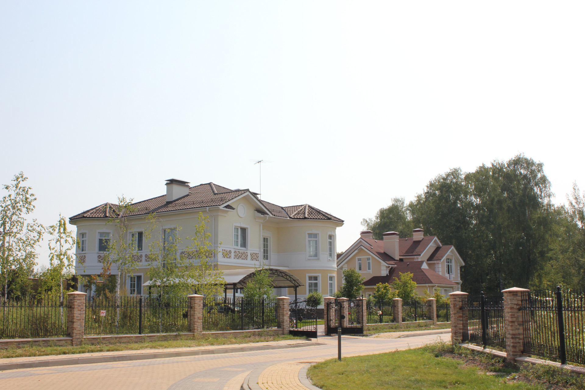Дом построен очень качественно (судите сами: кирпичные стены в толщину достигают метра; котельная рассчитана на газ и дизель, и котел установлен с большим запасом мощности; использованы только самые качественные натуральные материалы - массив дерева и мрамор на полу, качественные обои, мрамор и брендовые ткани на стенах, и т.п. В свое время, при постройке, в дом было вложено около 2.5 миллиона долларов США). Имеется уютная веранда. Крыша - массивная итальянская твердая глиняная черепица. Дом обнесен кованой оградой, как и принято в элитных коттеджных поселках.