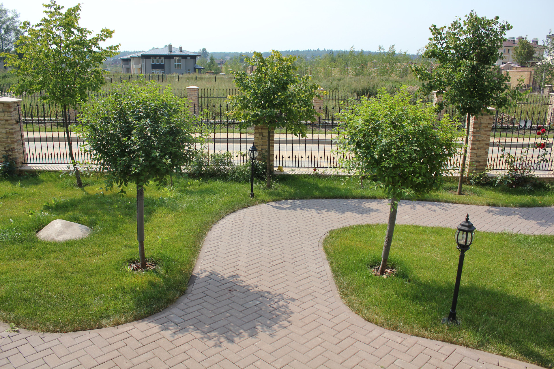 Коттедж расположен в тихой части поселка, где мимо тебя не ездят случайные машины - рай для интровертов или тех, кто не хочет быть у всех на виду :) Участок 13 соток правильной формы, на нем сделаны планировка и дренаж, рулонный газон, высажены деревья, разведены дорожки, имеется навес на 2 автомобиля.