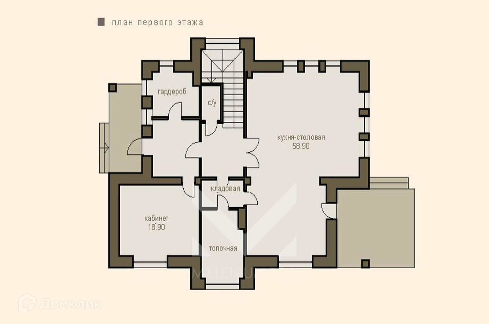 1 этаж - кухня-столовая-гостиная с камином и выходом на веранду, кабинет, с/у, гардероб, кладовая, котельная,