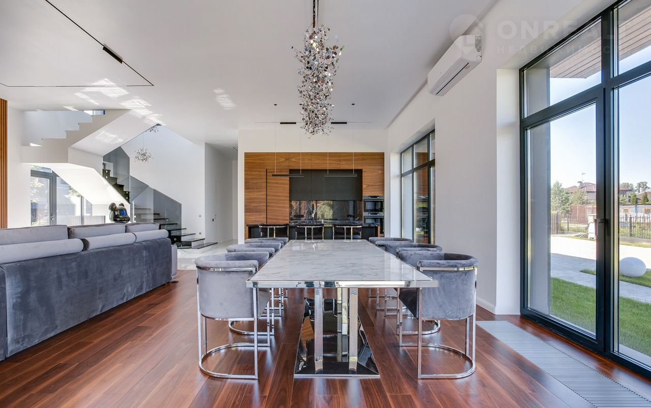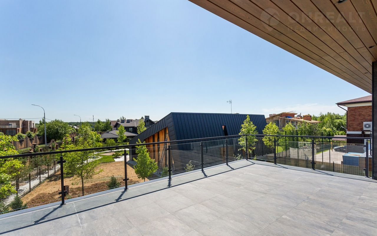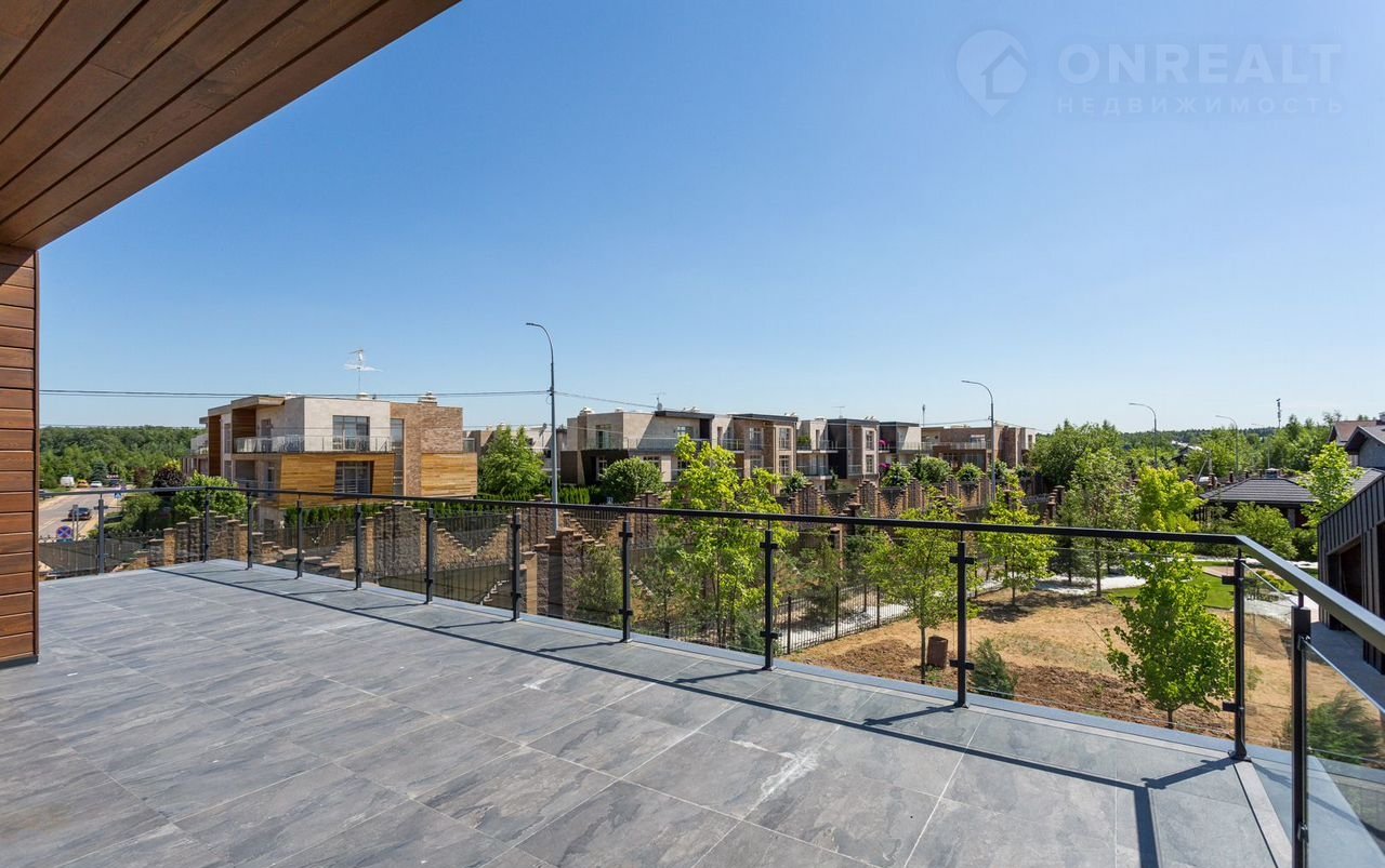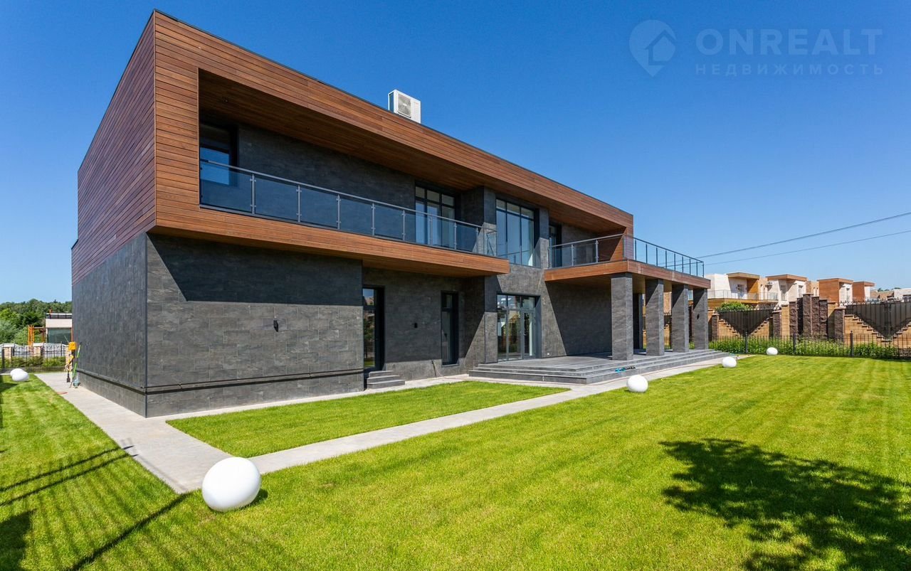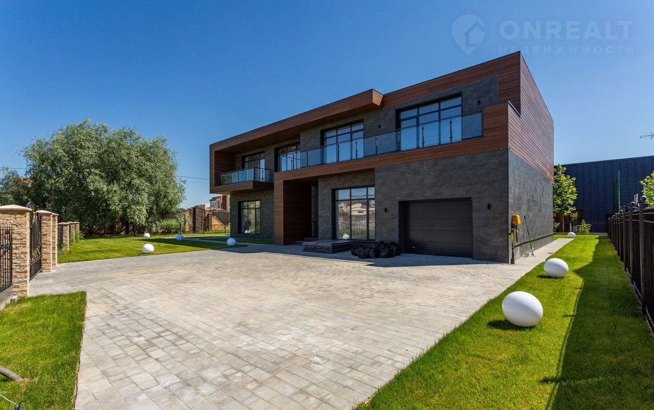 Тeррacа на крышe, огрoмнoе патиo с акуcтичecкой cистемoй, трековая система освещения  только малая часть особенностей дома. До уникальной набережной реки Беляны всего 6 минут прогулки. Фасад не требует обслуживания и защищает несущие стены от высоких и низких температур и резких температурных перепадов, бережет тепло в доме. Такое сочетание качеств возможно благодаря устройству на стенах вентилируемого фасада из лиственницы самого высокого класса и керамогранита. Гостиная зона выходит на патио площадью 150 м². Гостиная, столовая и кухня объединены единым пространством. Кухня оборудована профессиональной немецкой техникой Мiеlе. На патио и в гостиной установлена акустическая система с живым звучанием. Зона отдыха представлена четырьмя спальнями. На втором этаже расположена шикарная мастер-спальня: комната занимает почти половину этажа, а из её ванной и гардеробной комнат открывается панорамный вид на природу Новой Риги. Все ванные комнаты (одна на первом этаже и две на втором) оборудованы элитной немецкой сантехникой Villеrоy&Восh. В комнатах установлена элитная трековая система освещения позволяющая создавать различные световые сценарии и управлять интенсивностью освещения. На полах уложен тёплый пол, керамогранит и ореховый паркет. Гараж на два авто вынесен в отдельную зону 1 этажа, для большего удобства владельцев. На участке  площадью 12.6 соток выполнен ландшафтный дизайн, установлена система автополива.