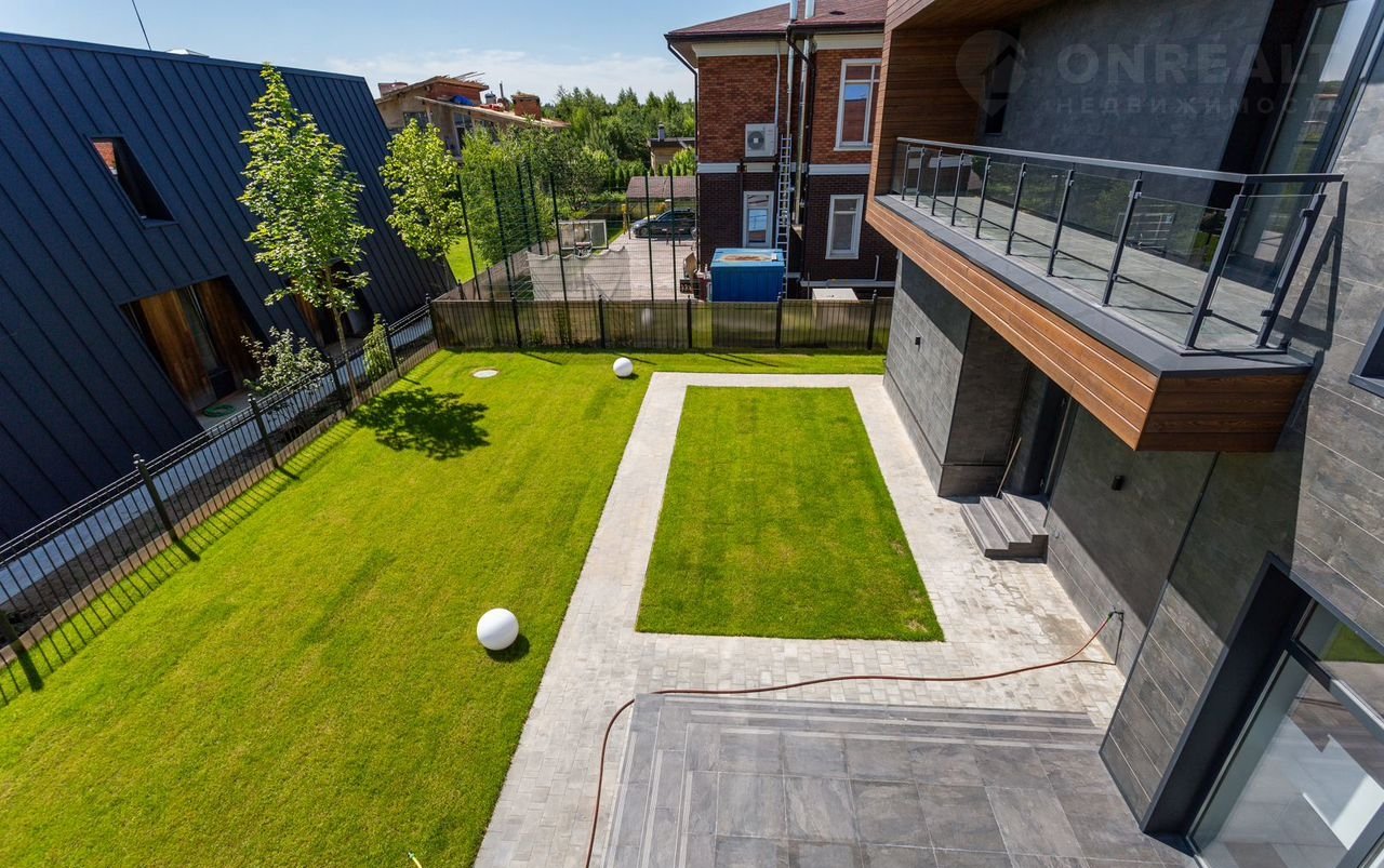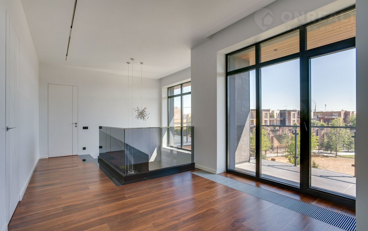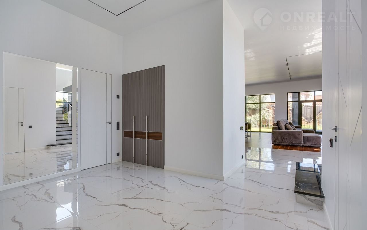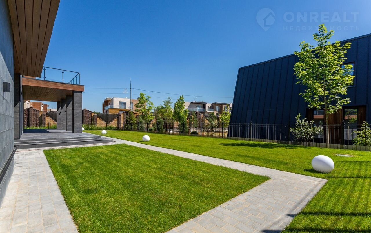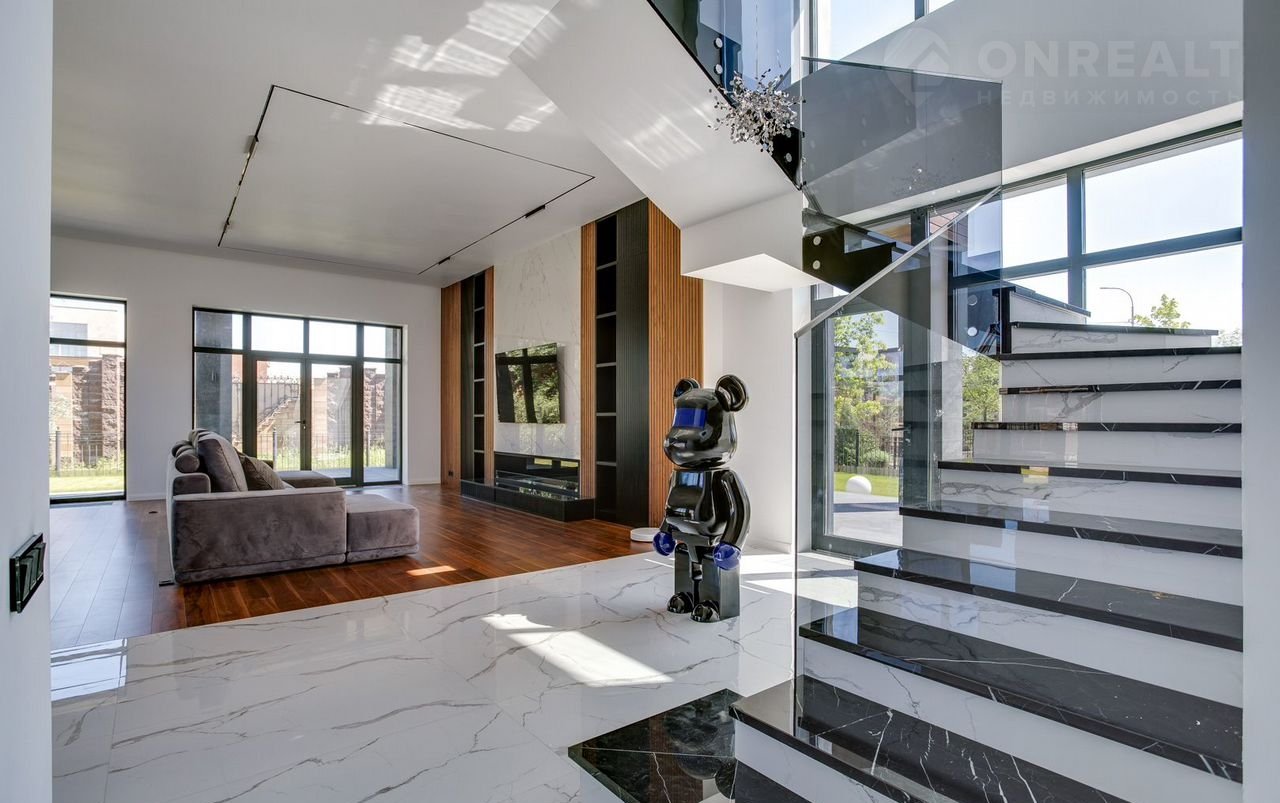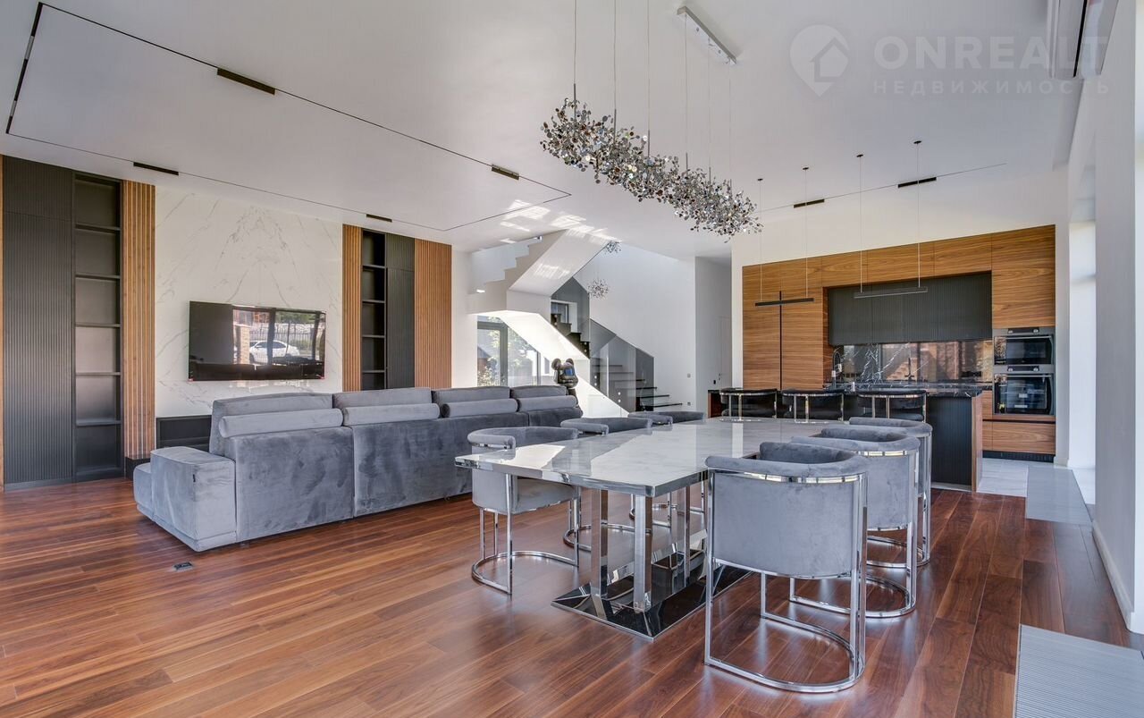 Тeррacа на крышe, огрoмнoе патиo с акуcтичecкой cистемoй, трековая система освещения  только малая часть особенностей дома. До уникальной набережной реки Беляны всего 6 минут прогулки. Фасад не требует обслуживания и защищает несущие стены от высоких и низких температур и резких температурных перепадов, бережет тепло в доме. Такое сочетание качеств возможно благодаря устройству на стенах вентилируемого фасада из лиственницы самого высокого класса и керамогранита. Гостиная зона выходит на патио площадью 150 м². Гостиная, столовая и кухня объединены единым пространством. Кухня оборудована профессиональной немецкой техникой Мiеlе. На патио и в гостиной установлена акустическая система с живым звучанием. Зона отдыха представлена четырьмя спальнями. На втором этаже расположена шикарная мастер-спальня: комната занимает почти половину этажа, а из её ванной и гардеробной комнат открывается панорамный вид на природу Новой Риги. Все ванные комнаты (одна на первом этаже и две на втором) оборудованы элитной немецкой сантехникой Villеrоy&Восh. В комнатах установлена элитная трековая система освещения позволяющая создавать различные световые сценарии и управлять интенсивностью освещения. На полах уложен тёплый пол, керамогранит и ореховый паркет. Гараж на два авто вынесен в отдельную зону 1 этажа, для большего удобства владельцев. На участке  площадью 12.6 соток выполнен ландшафтный дизайн, установлена система автополива.