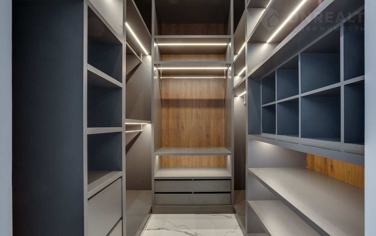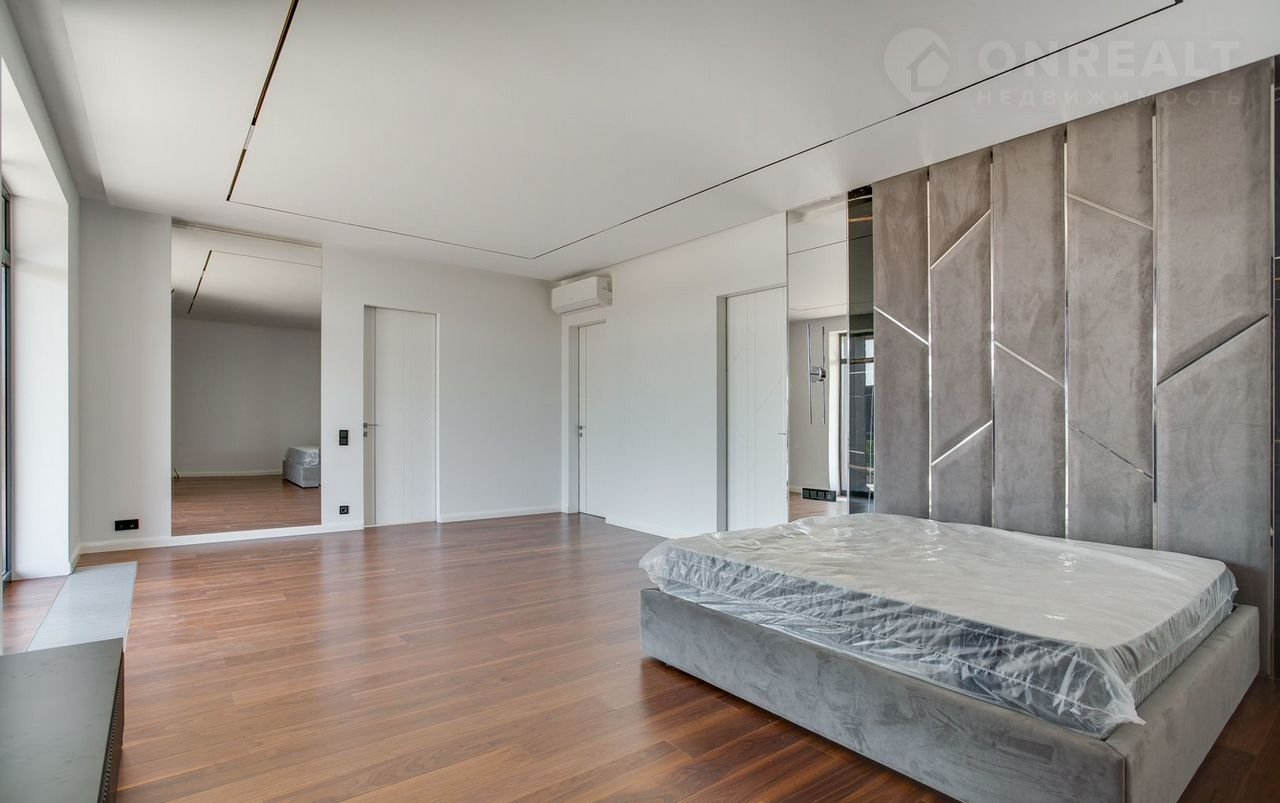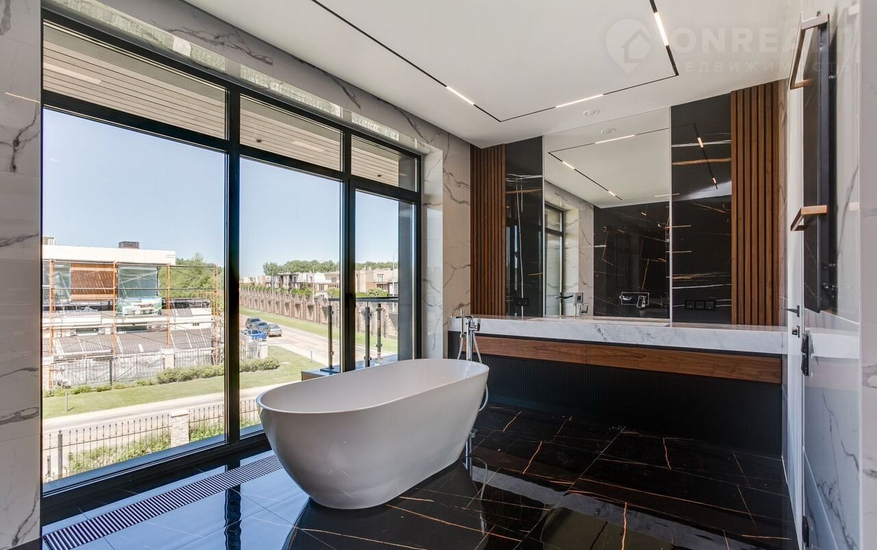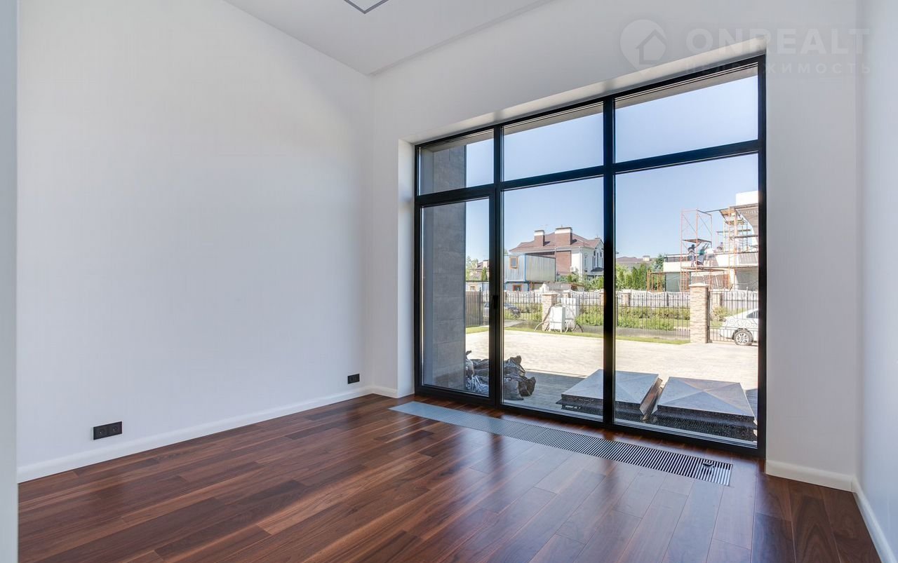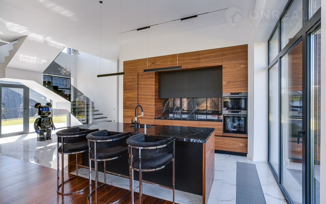 Тeррacа на крышe, огрoмнoе патиo с акуcтичecкой cистемoй, трековая система освещения  только малая часть особенностей дома. До уникальной набережной реки Беляны всего 6 минут прогулки. Фасад не требует обслуживания и защищает несущие стены от высоких и низких температур и резких температурных перепадов, бережет тепло в доме. Такое сочетание качеств возможно благодаря устройству на стенах вентилируемого фасада из лиственницы самого высокого класса и керамогранита. Гостиная зона выходит на патио площадью 150 м². Гостиная, столовая и кухня объединены единым пространством. Кухня оборудована профессиональной немецкой техникой Мiеlе. На патио и в гостиной установлена акустическая система с живым звучанием. Зона отдыха представлена четырьмя спальнями. На втором этаже расположена шикарная мастер-спальня: комната занимает почти половину этажа, а из её ванной и гардеробной комнат открывается панорамный вид на природу Новой Риги. Все ванные комнаты (одна на первом этаже и две на втором) оборудованы элитной немецкой сантехникой Villеrоy&Восh. В комнатах установлена элитная трековая система освещения позволяющая создавать различные световые сценарии и управлять интенсивностью освещения. На полах уложен тёплый пол, керамогранит и ореховый паркет. Гараж на два авто вынесен в отдельную зону 1 этажа, для большего удобства владельцев. На участке  площадью 12.6 соток выполнен ландшафтный дизайн, установлена система автополива.