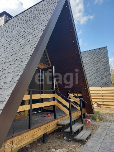 Современный, небольшой уютный дом в дизайнерском исполнении со скошенной крышей, на загороженном участке с баней.