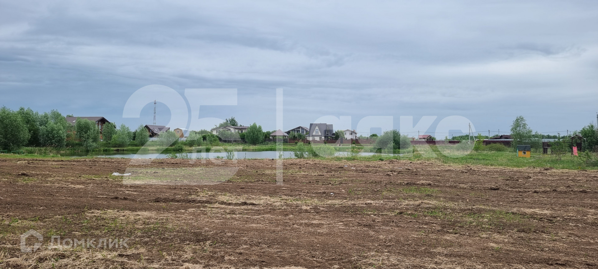 Участок ровной формы, выровнен, заканчивается искусственным озером.