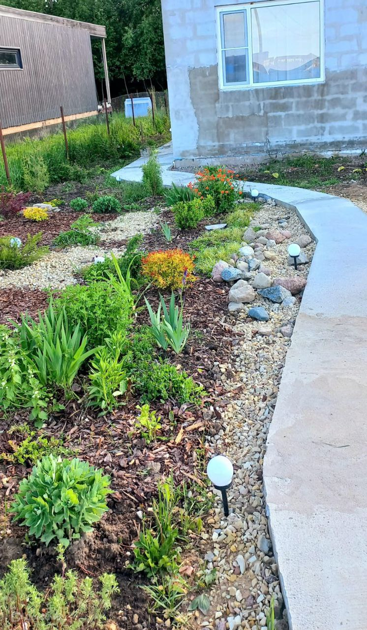 Участок сухой, с небольшим ровным уклоном к задней части. Огорожен временным забором из сетки Рабица и профлистом с фасада. Земля обрабатывается хозяйкой, заложен небольшой сад, есть декоративные насаждения и миксбордеры с многолетними растениями в передней части двора. На заднем дворе с учетом сторон света расположен огород с приподнятыми грядками, где растёт клубника и ежегодные овощные культуры. Построена теплица для выращивания теплолюбивых овощей. Имеются кусты с ягодами малины, крыжовника и смородины. Есть сарай и вольер для собаки.