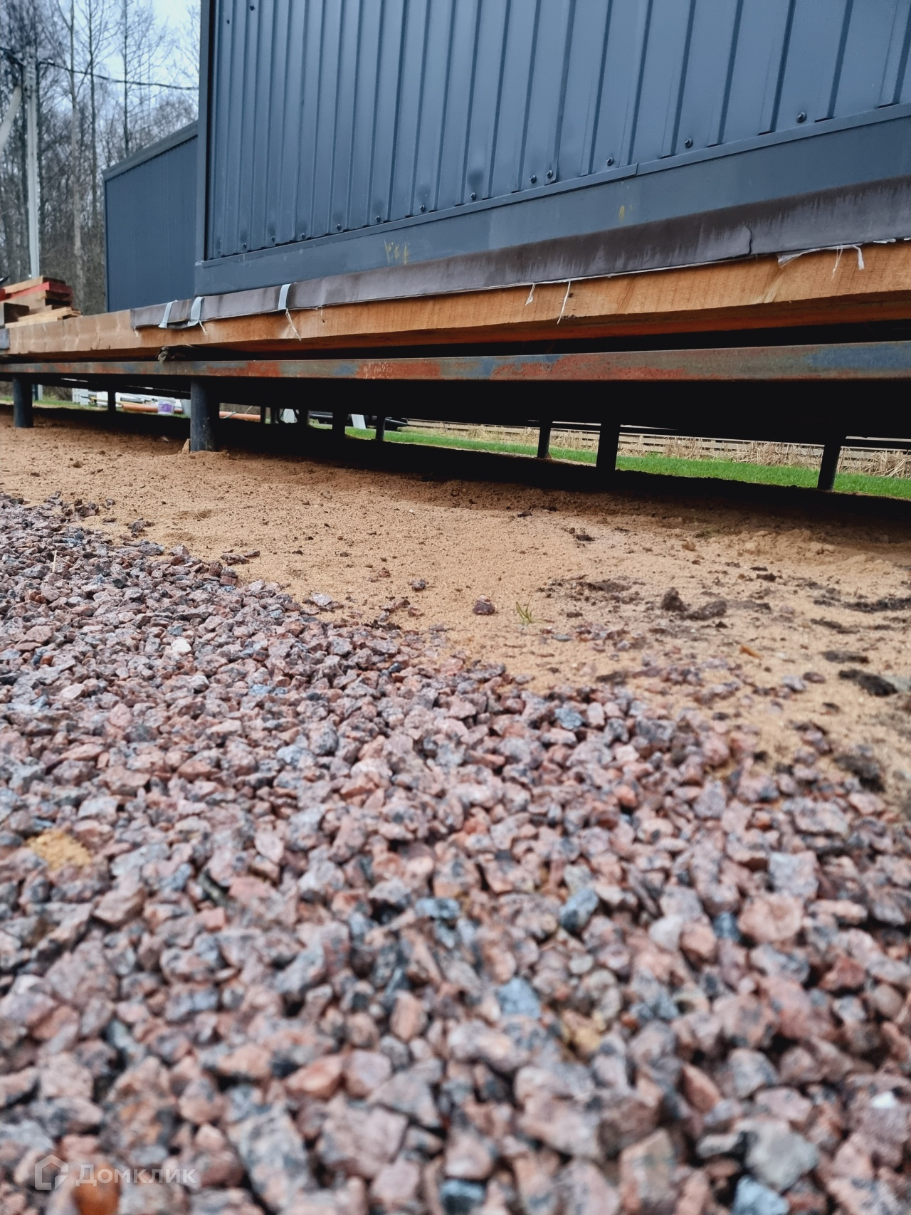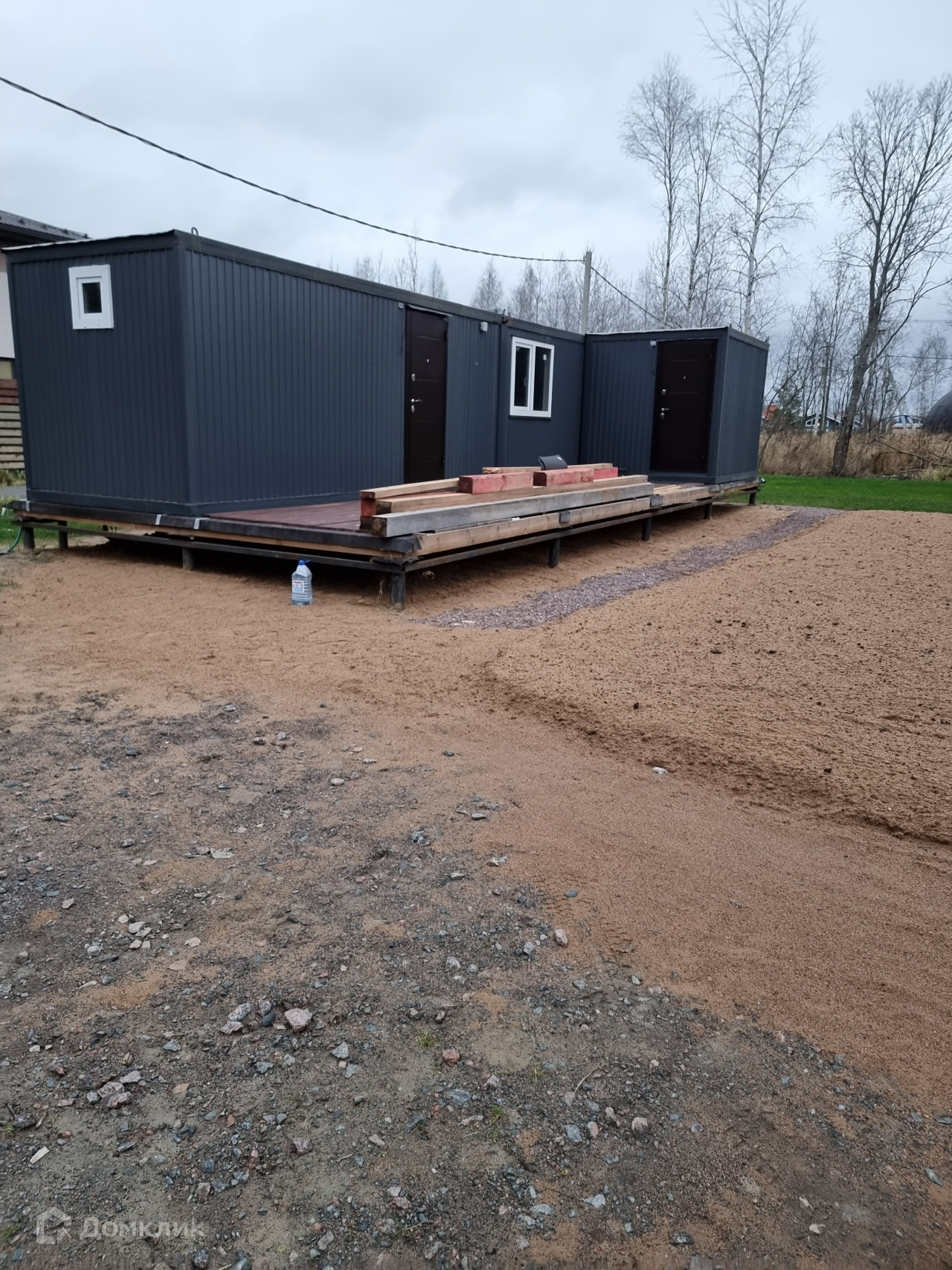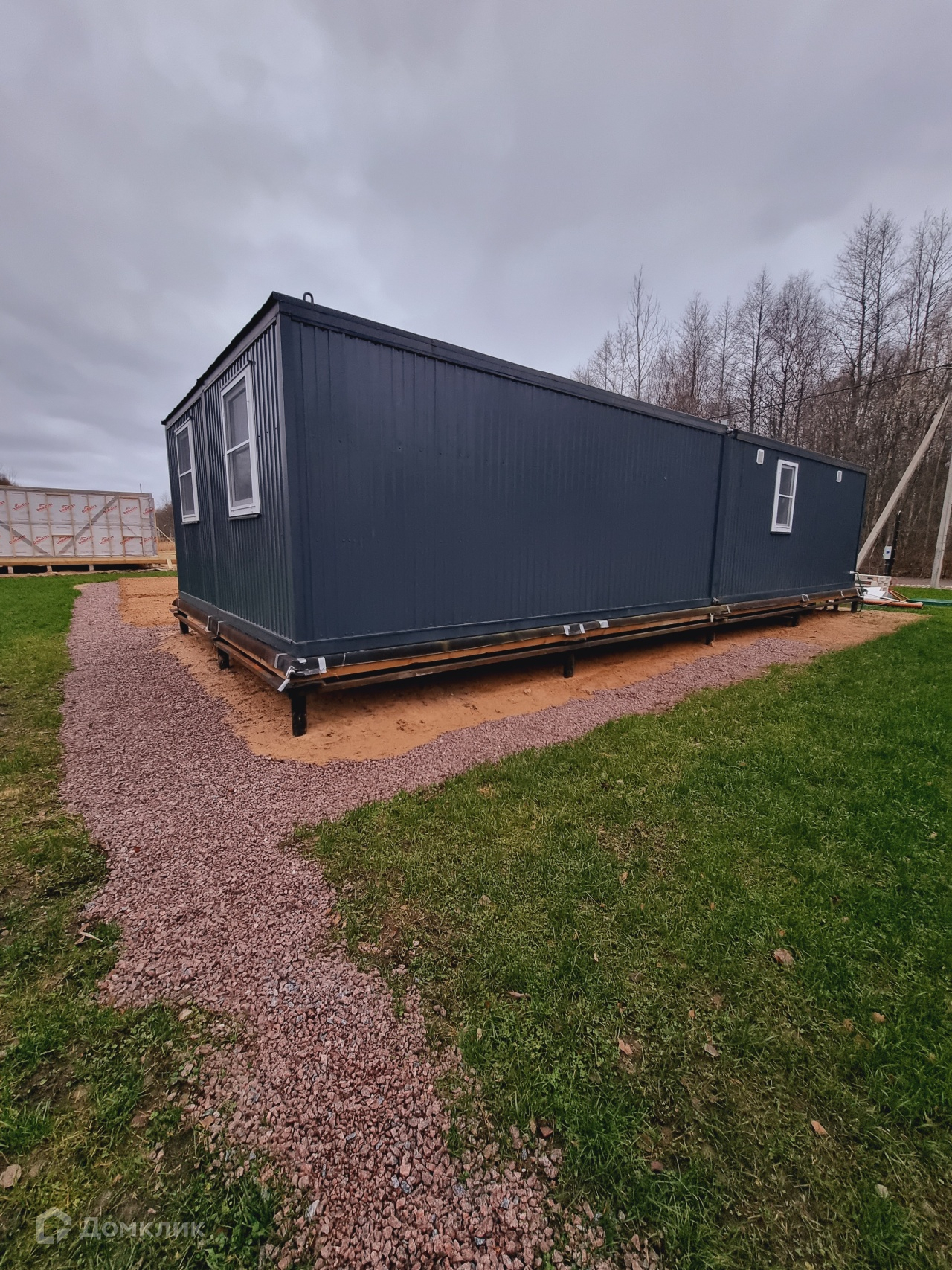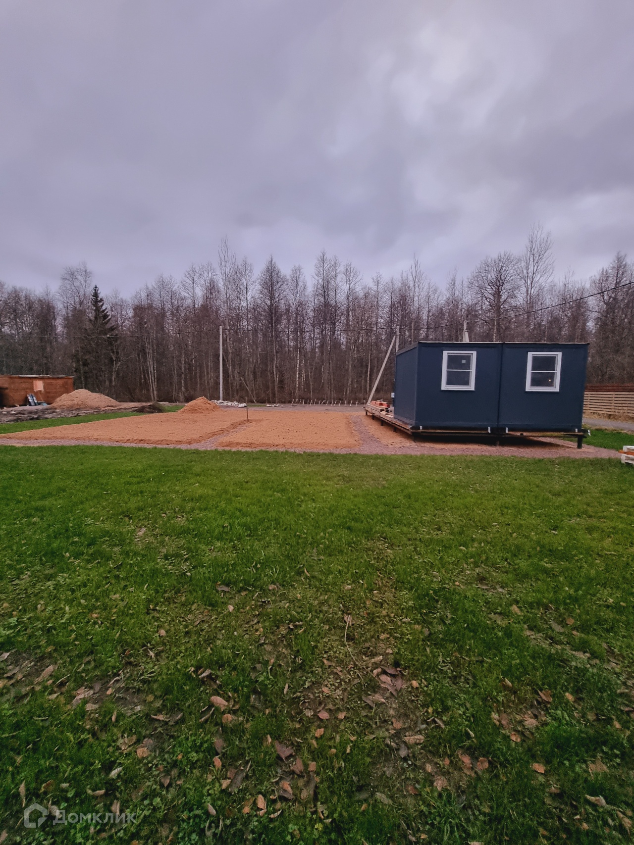 На участке построен временный дом. В доме сан/узел, душ, кухня и спальная зона. Дом теплый, подходит для круглогодичного проживания.
