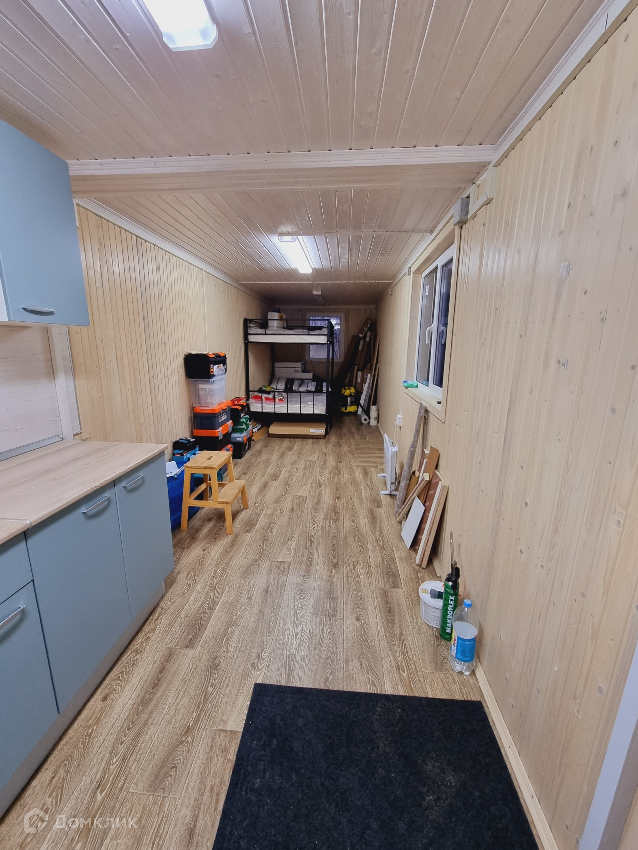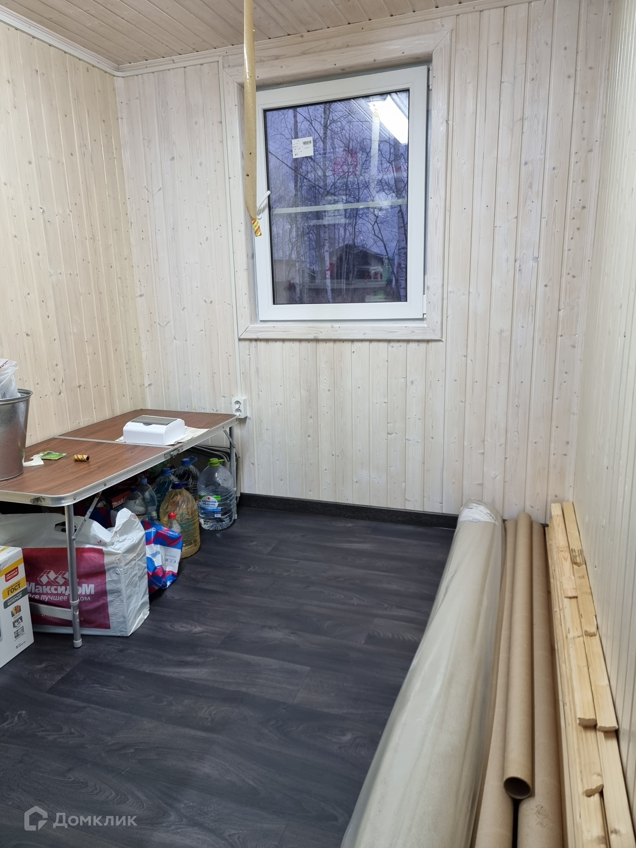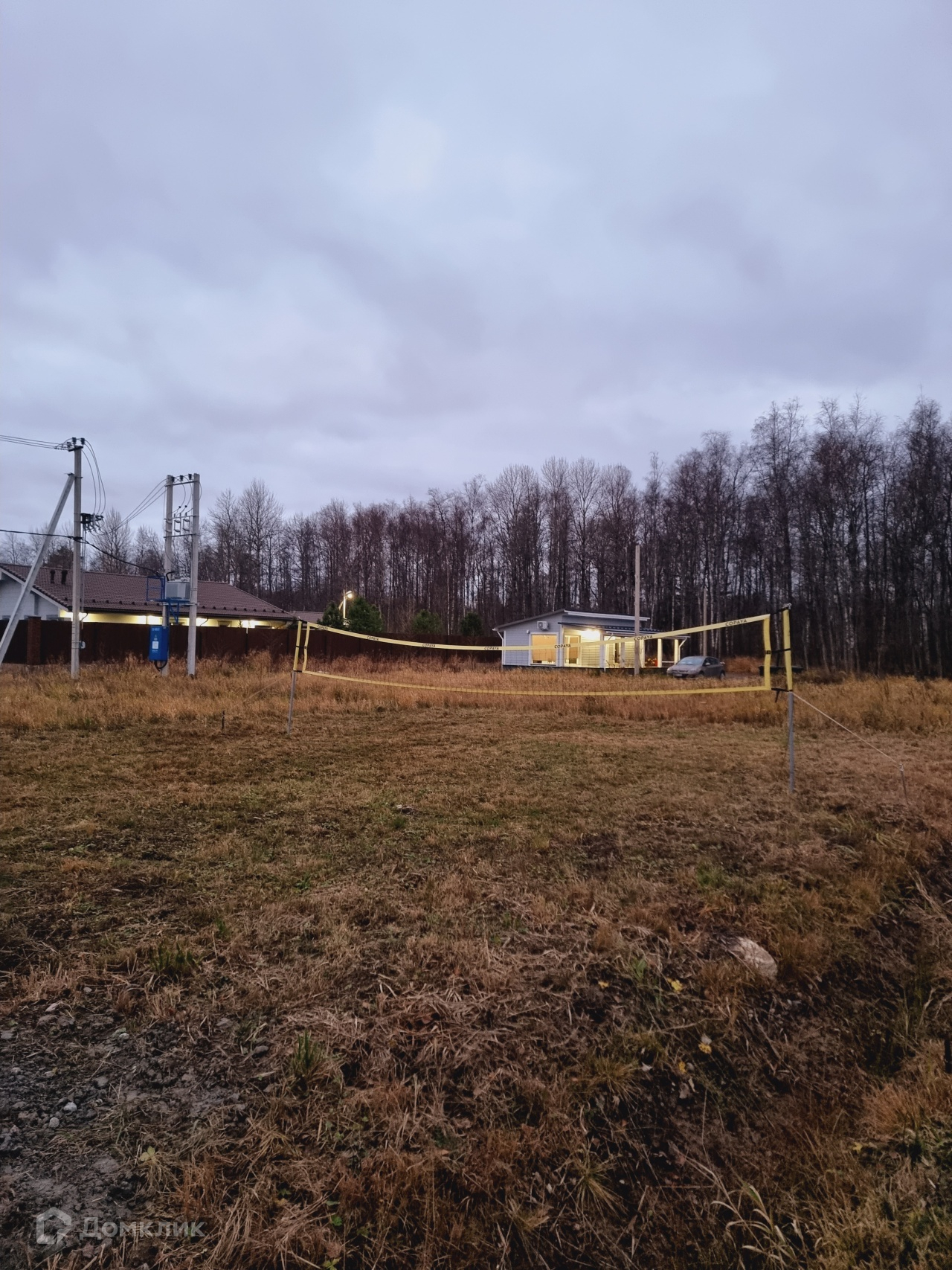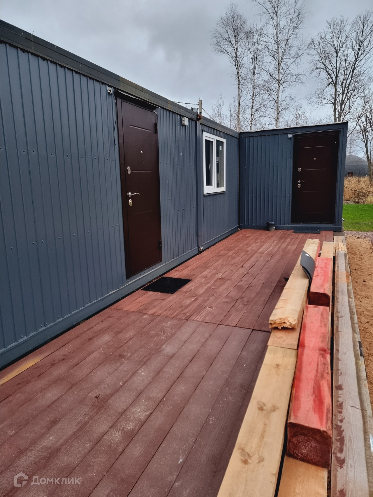 На участке построен временный дом. В доме сан/узел, душ, кухня и спальная зона. Дом теплый, подходит для круглогодичного проживания.