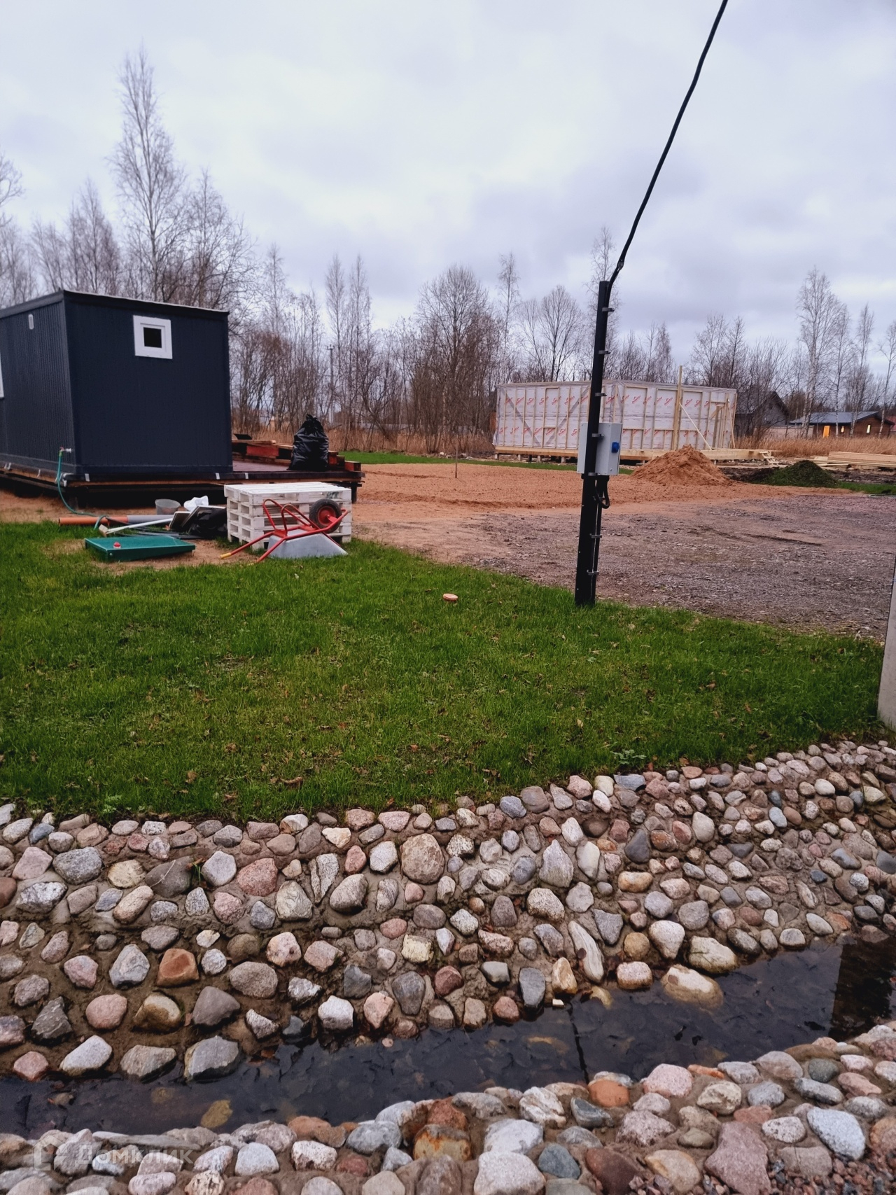 Участок выровнен, сделан дренаж, сток ( оформлен камнем), отсыпан песком.