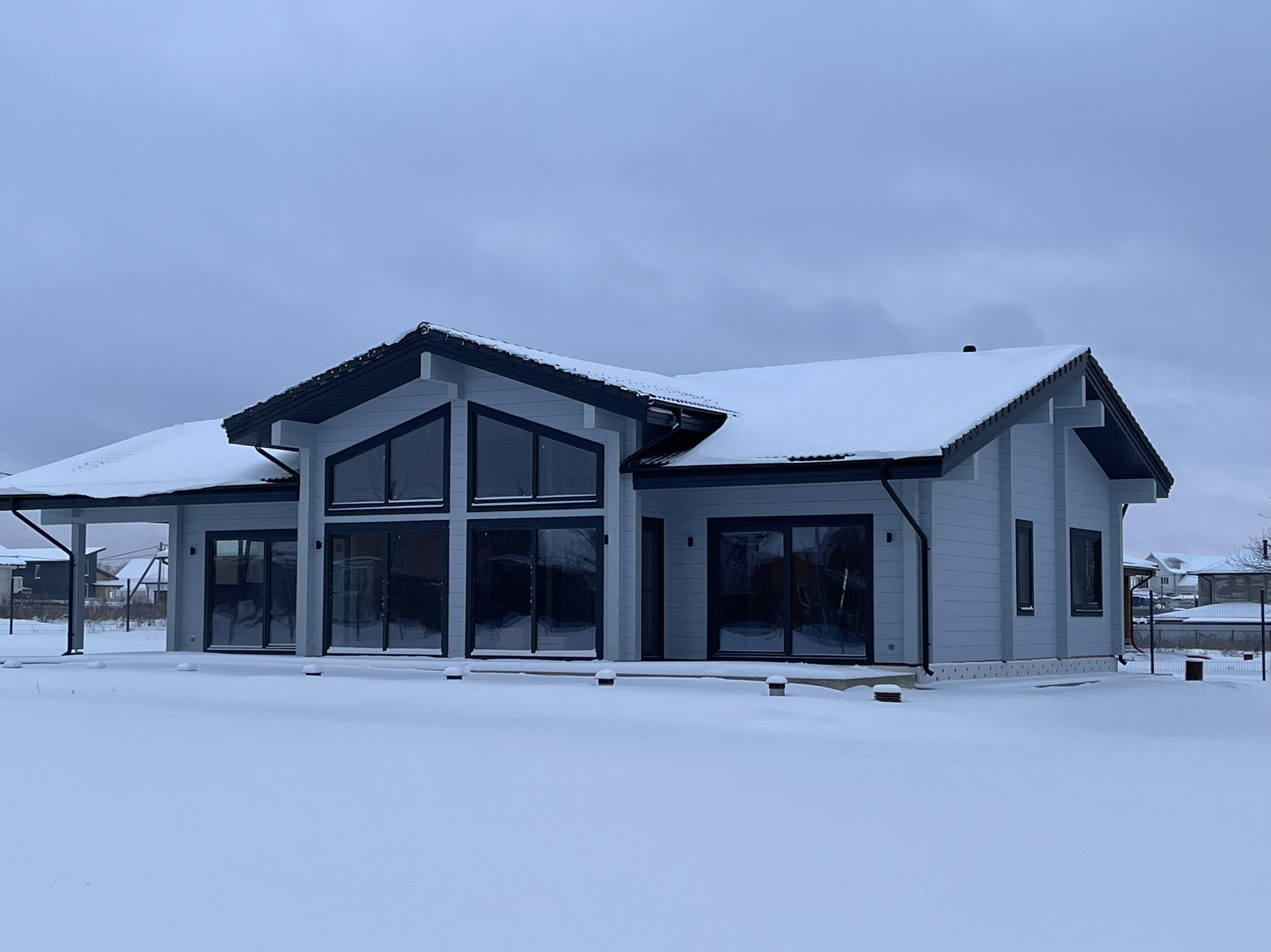В доме расположены просторная кухня-гостиная, одна мастер-спальня и две стандартные спальни, кабинет, прачечная, три санузла, две гардеробные, кладовая и котельная.