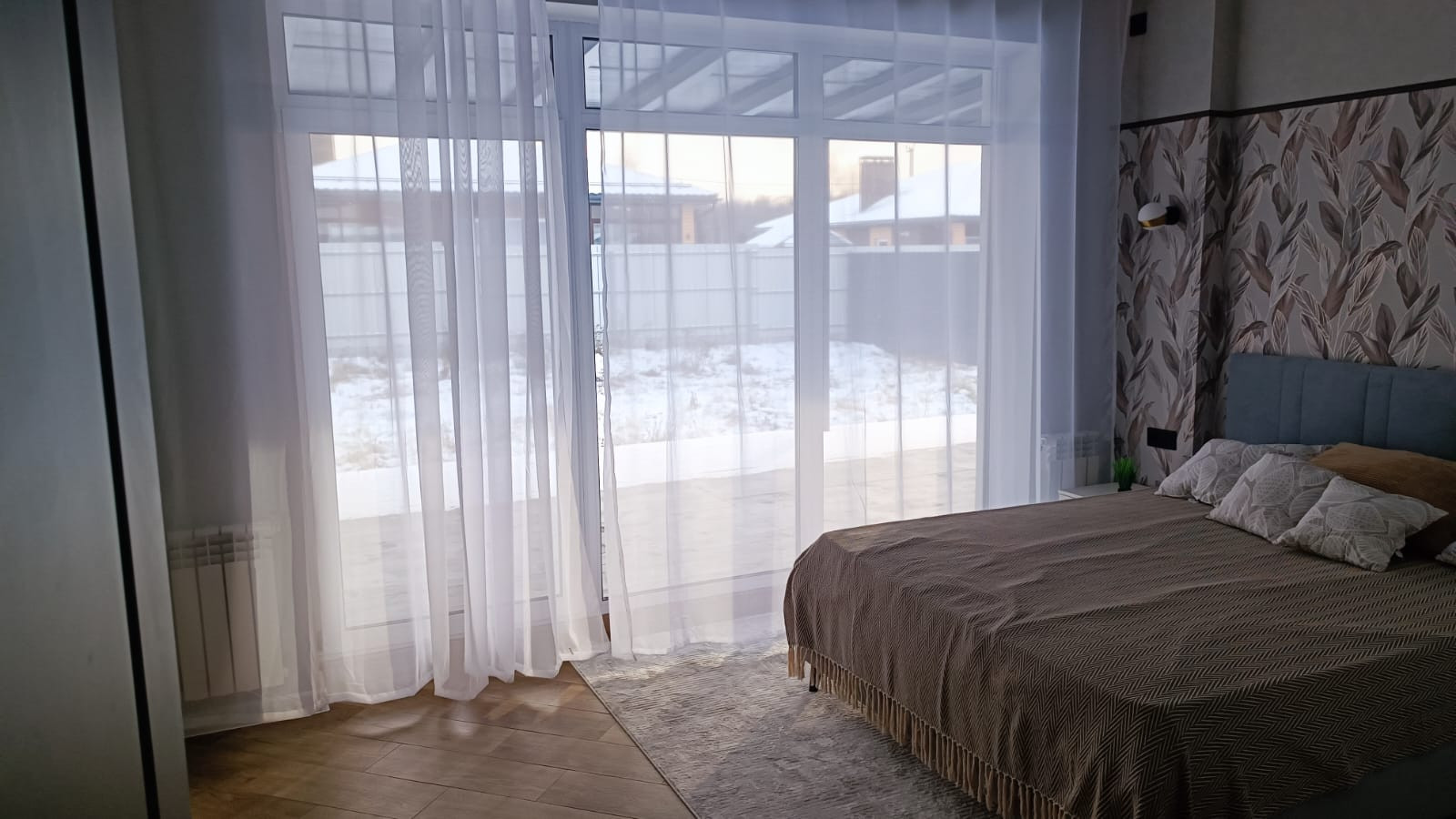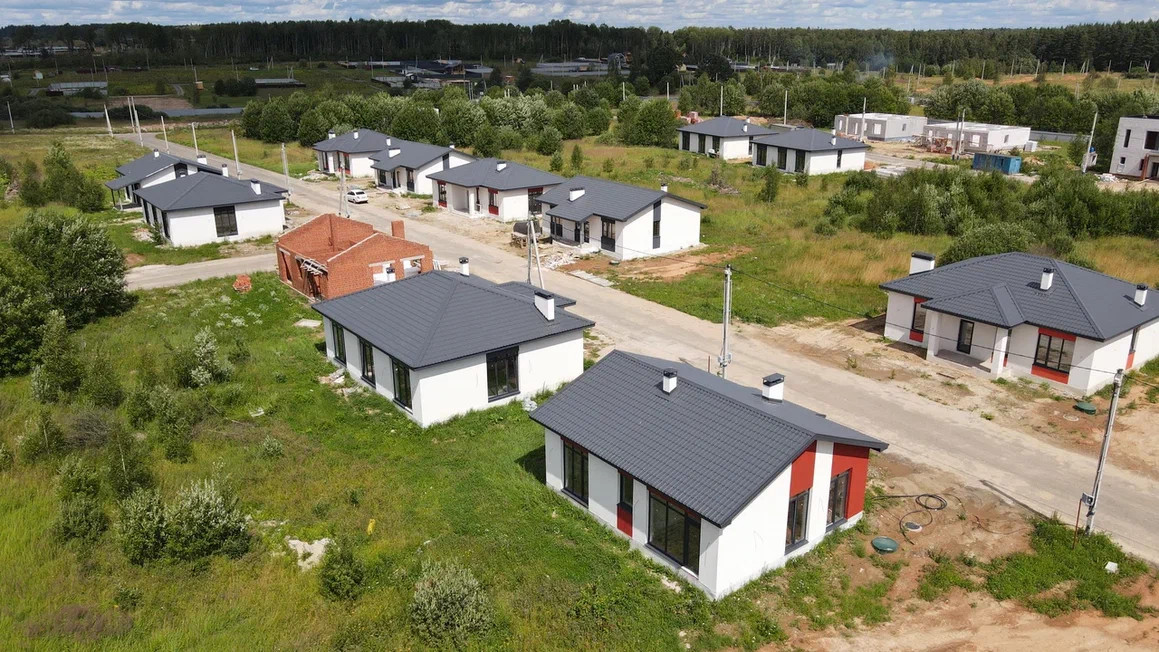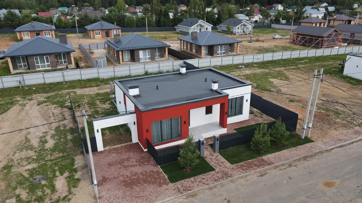 Дом подключен к газовому отоплению. (газ заводится в поселок).На каждый дом в посёлке приходится индивидуальная водопроводная скважина и электричество мощностью 15 кВт. Каждый дом с фасадным забором в едином стиле. Перед каждым домом имеется парковка на 2 авто. Данный вариант подходит для постоянного и сезонного проживания. Территория посёлка закрыта, по периметру ведётся видеонаблюдение, что гарантирует безопасность жителей.