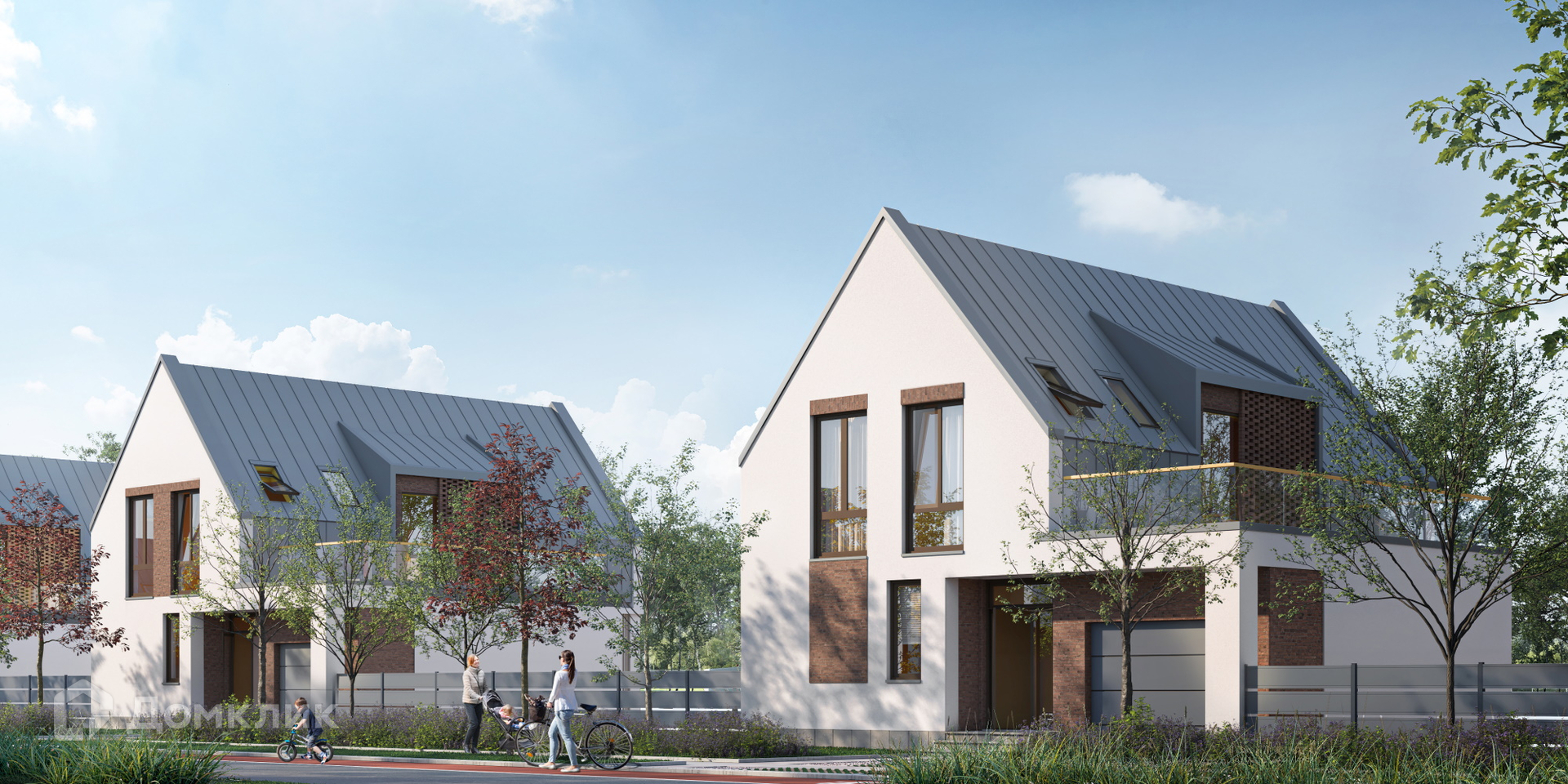 Дом отделан фасадной штукатуркой с инкрустацией клинкерной плиткой. Благодаря вариативным лицевым фасадам каждое домовладение этого типа обладает своей индивидуальностью. Лаконичные фронтоны заострённой формы, формирующие фронт улицы, призваны напоминать об уютных городах Северной Европы. Широкие окна кухни-гостиной выходят на террасу, а обилие света на втором этаже обеспечивают мансардные окна и шахматная кладка кирпича.