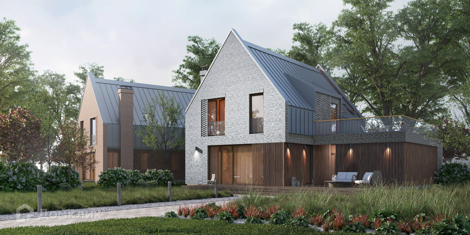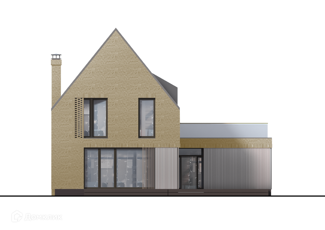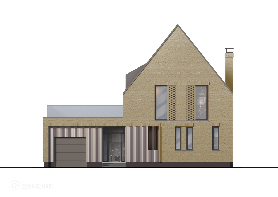 Фасады дома решены в клинкерном кирпиче трёх оттенков, декорированы деревянными ламелями и свесами фальцевой кровли. На обоих этажах вы найдете светопроницаемые холлы, обращённые на террасы. Лаконичные фронтоны заострённой формы, формирующие фронт улицы, призваны напоминать об уютных городах Северной Европы. Широкие окна кухни-гостиной выходят на террасу, а обилие света на втором этаже обеспечивают мансардные окна и шахматная кладка кирпича.