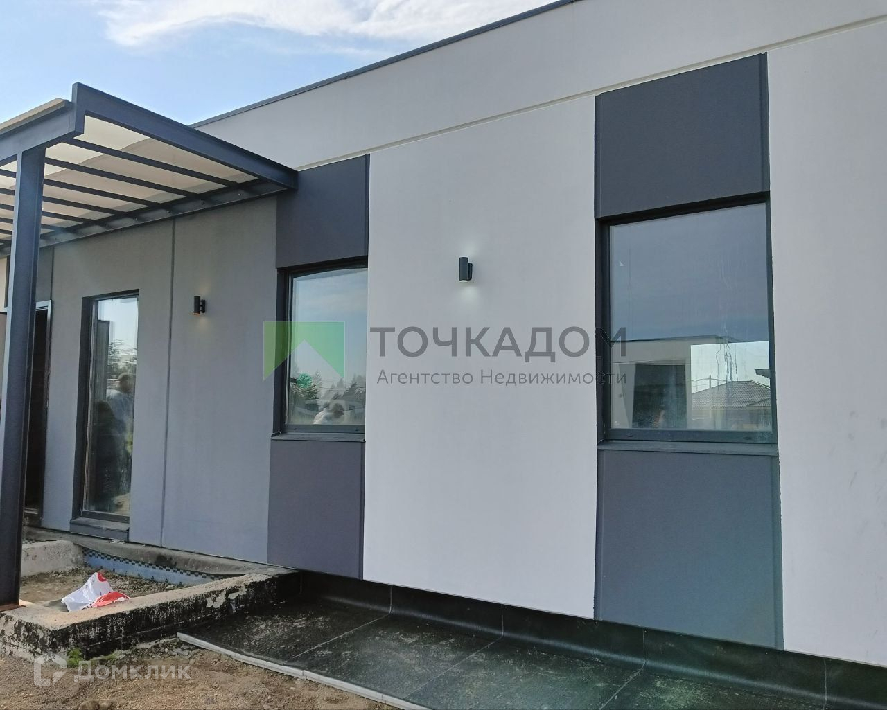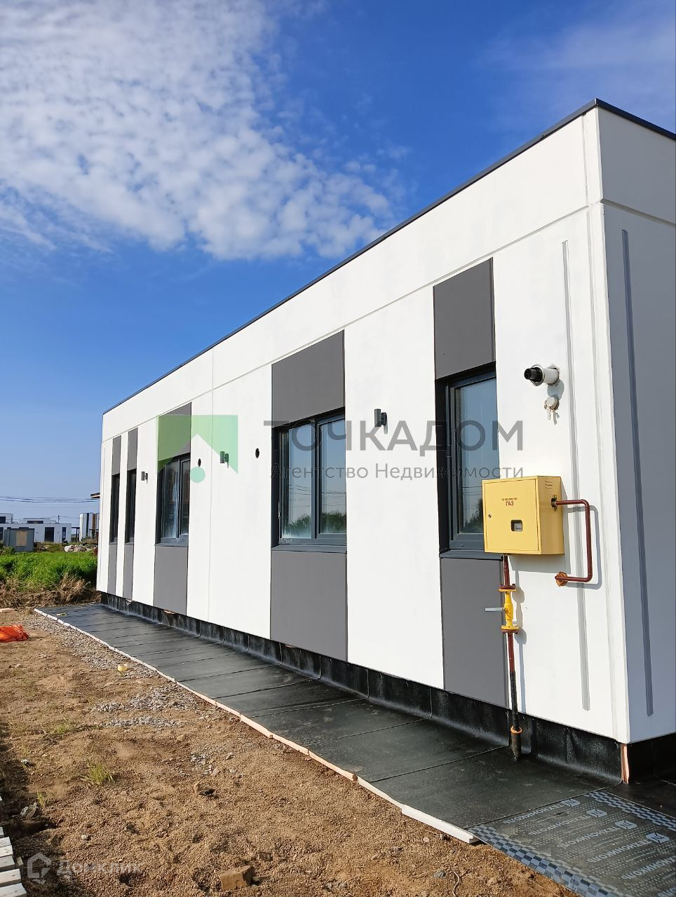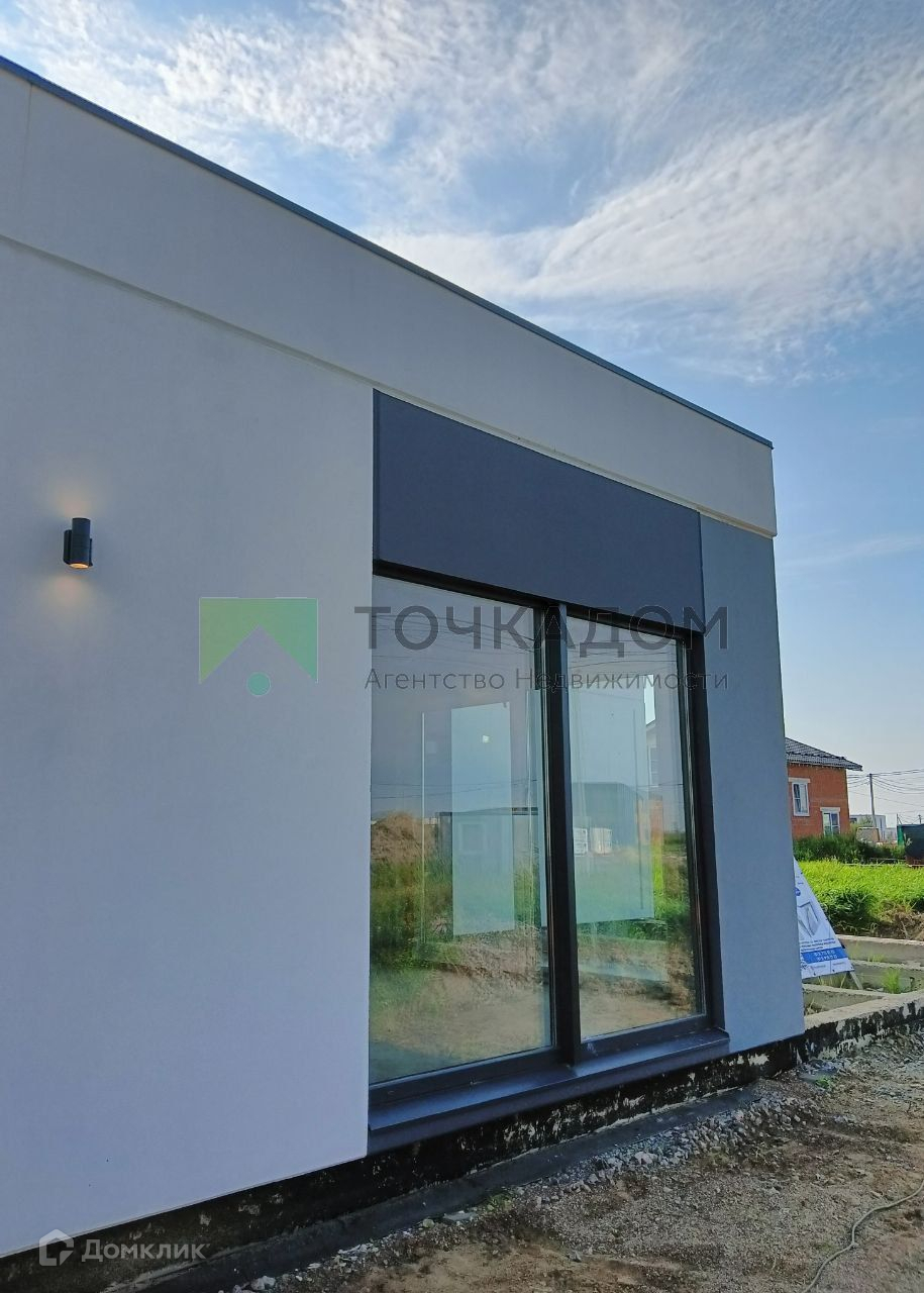 В планировку включена большая кухня-гостиная, санузел, котельная и 2 спальные комнаты. По периметру дома установлены окна в пол. Здесь также есть небольшая терраса, которая идеально подходит для отдыха на свежем воздухе, и крыльцо. На фасаде дома расположены светильники. Имеется гараж на одну машину. В доме выполнена черновая отделка с инженерными сетями - электричество 15кВт и вода подключаются к дому, центральный газопровод и интернет подключаются отдельно. Все сети проведены под землей.