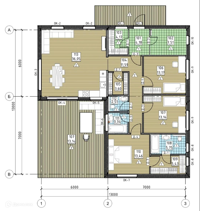 Просторная 36,3 м2 кухня-гостиная квадратной формы, с выходом на террасу и панорамными в пол окнами (VEKA), имеет свою кладовую. Три спальни по 13,5 м2, одна из них мастер-спальня со своим санузлом 5,75м2 и гардеробной 5,5м2. В холле гардеробная 4,17м2 с окном и вход в "сердце дома" - котловую 7,51м2 в которой можно организовать постирочную и/или дополнительные места для хранения. В коридоре раздельный санузел, который можно переформатировать в совмещенный с проходом в сауну.