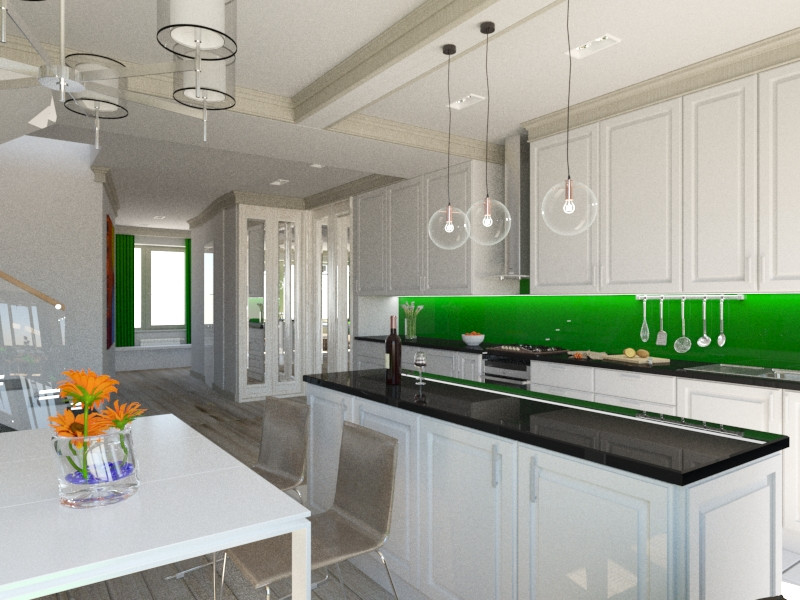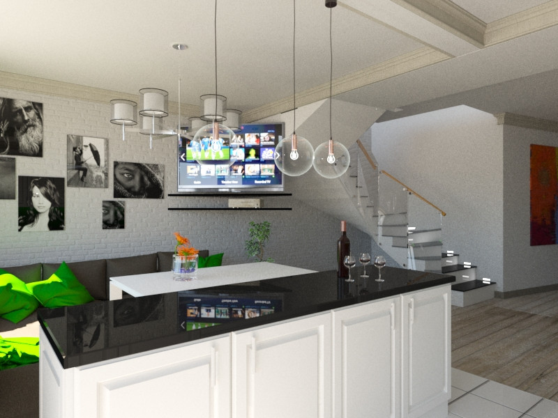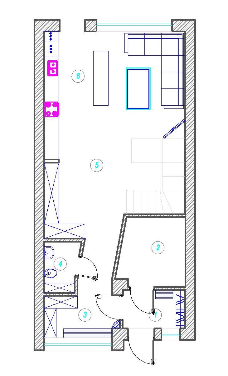 Первый этаж: тамбур, подсобное помещение, прихожая, санузел (совмещенный с бойлерной), большая кухня-гостиная с выходом на задний двор.