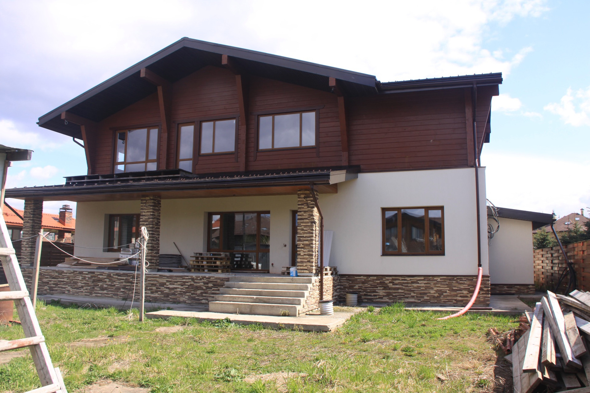 Фундамент монолитная плита. Перекрытия ж/б плиты. Материал стен: 1-й этаж кирпич, 2-й этаж клееный брус (GoodWood). Кровля мягкая черепица. Лестница монолитная. Энерго-эффективные бронированные окна. Фасад штукатурка, натуральный камень и лиственница.