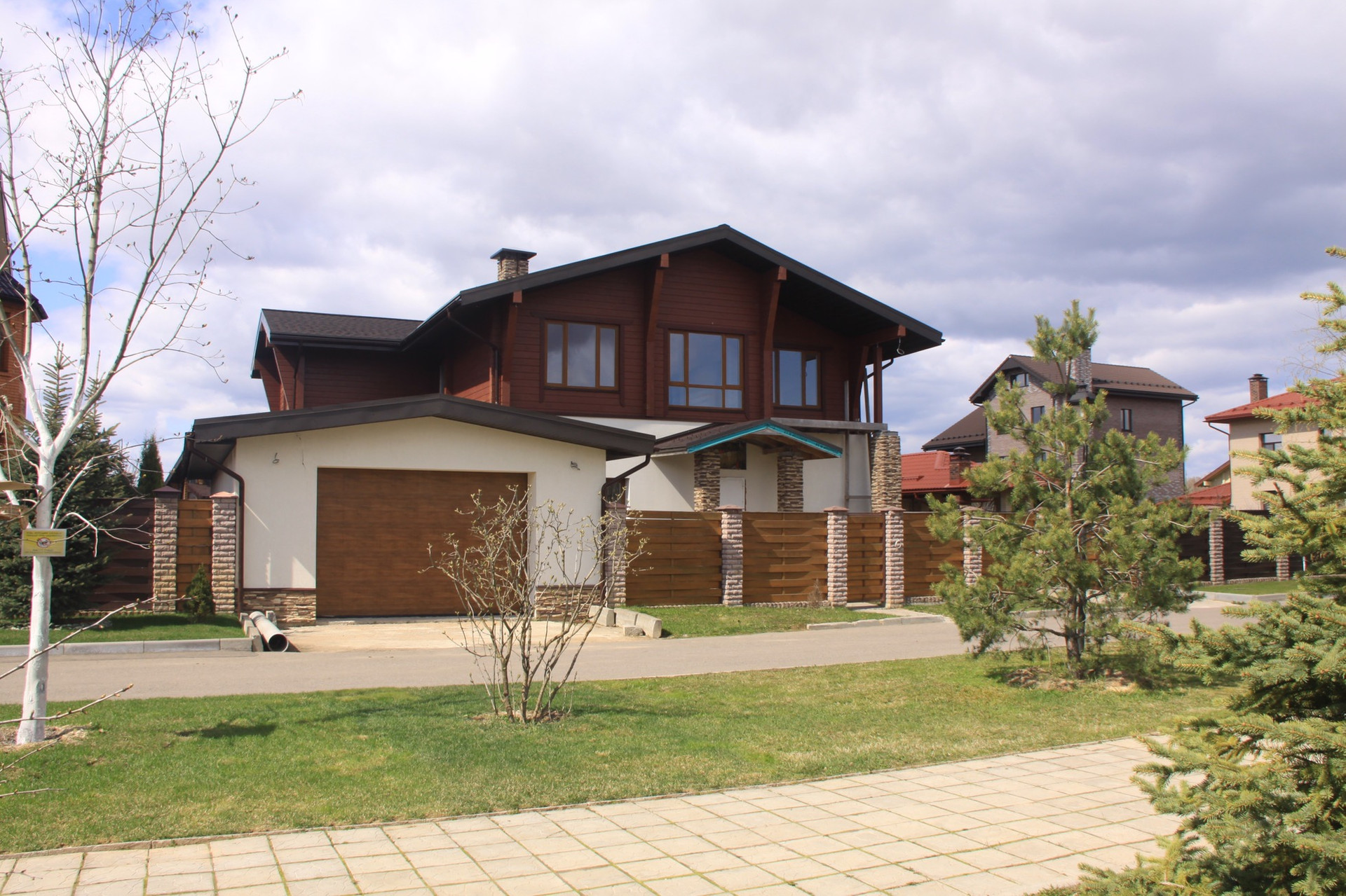 Особенности объекта: имеется 3 уровня (Цокольный монолитный этаж, первый этаж кирпич 70 см, второй клееный брус GoodWood 200 мм), большая гостиная со вторым светом, камин, панорамные окна, высококачественные материалы, просторная терраса, гараж на 5 машин.