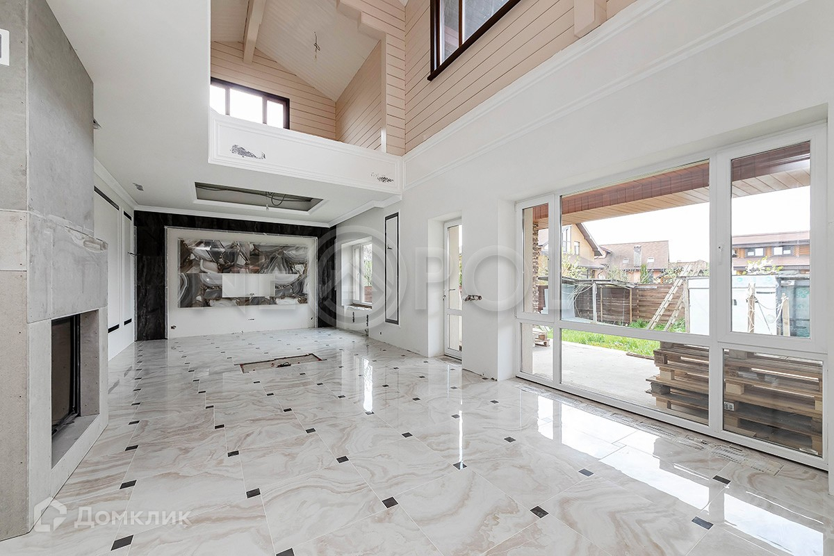 Функциональная просторная кухня-гостиная со вторым светом где высота потолков достигает 6 м, есть выход на крытую террасу.