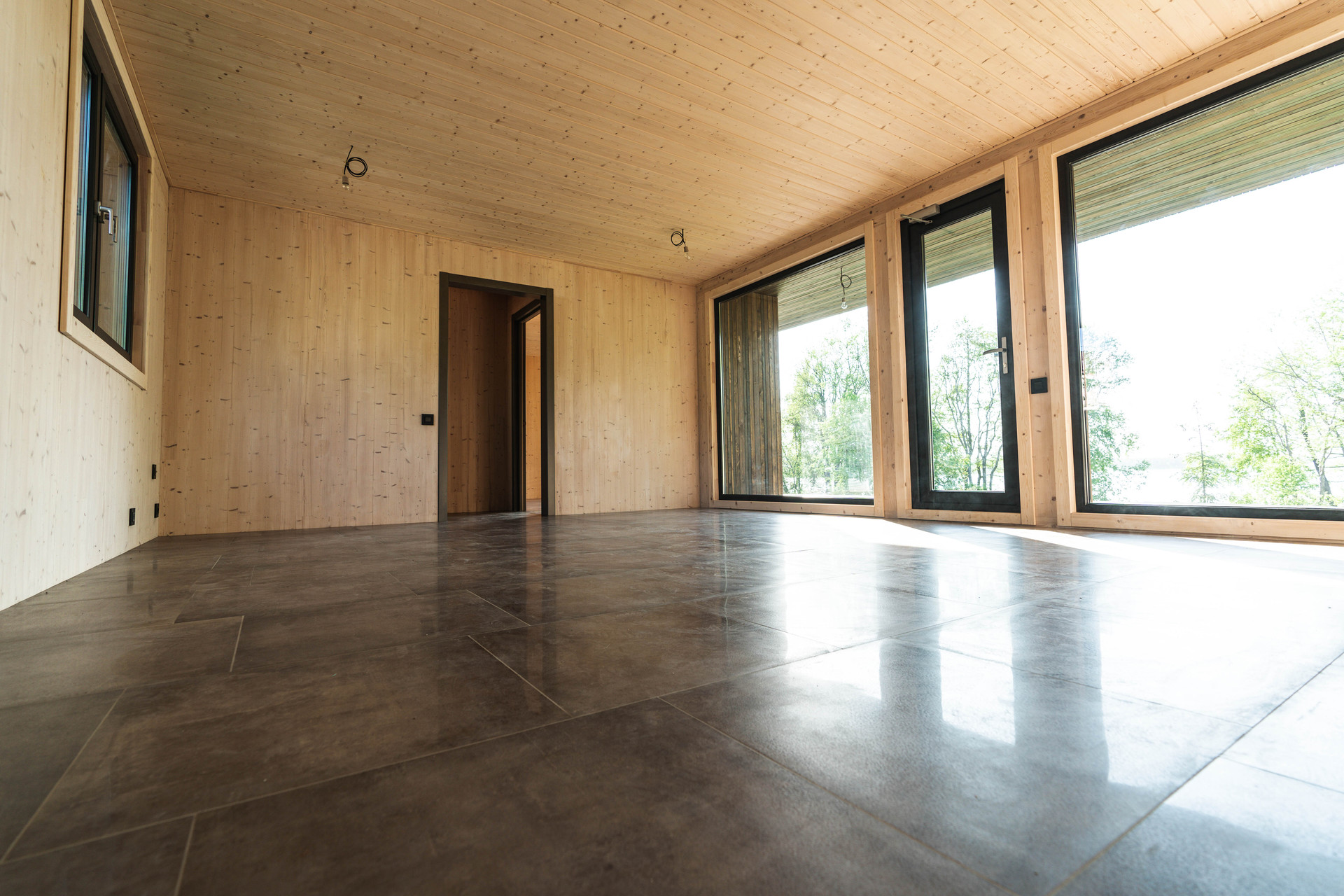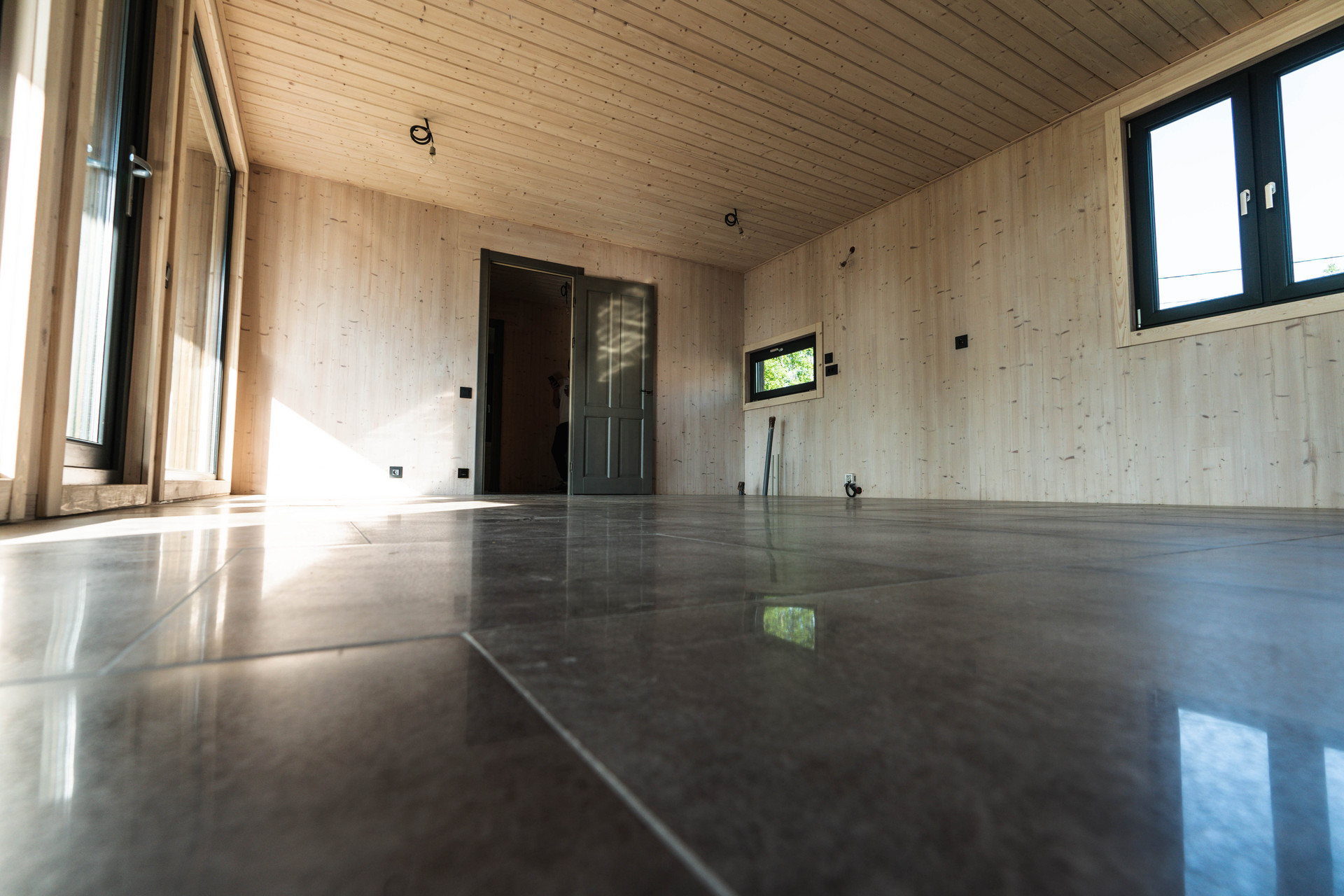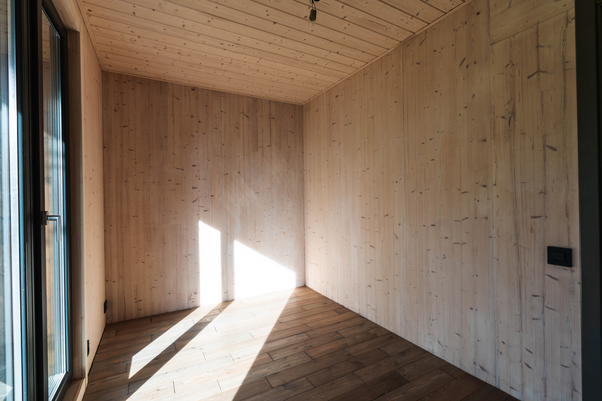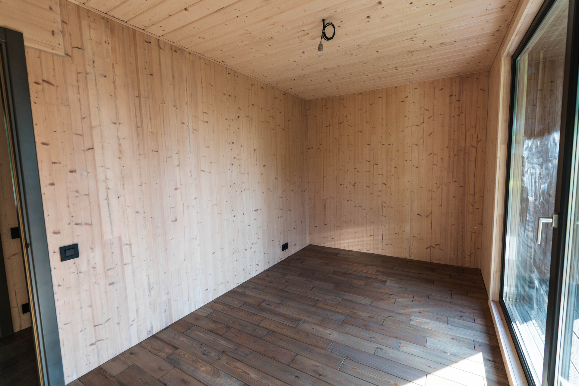 Внутренняя отделка - шлифованная CLT панель, покрытая Vallticolor (финского производства). Качественный керамогранит в прихожей, кухне-гостинной, санузлах. Паркет из лиственницы с покрытием маслом в спальных комнатах. Двери из массива древесины.