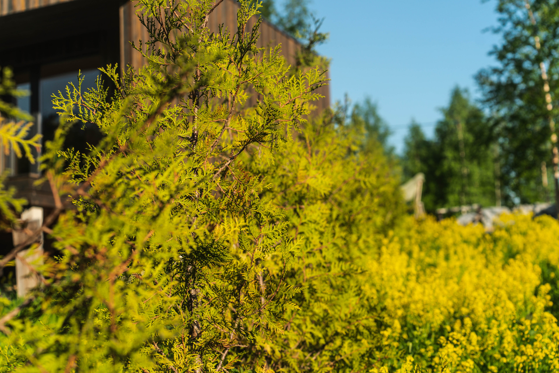 С фасадной стороны огорожен экологичным деревянным забором, перед которым высажены ели. С двух боковых сторон огорожен красивой живой изгородью из туй Брабант. Сооружено парковочное место перед входом в дом. По периметру дома уложена отмостка из отсева.