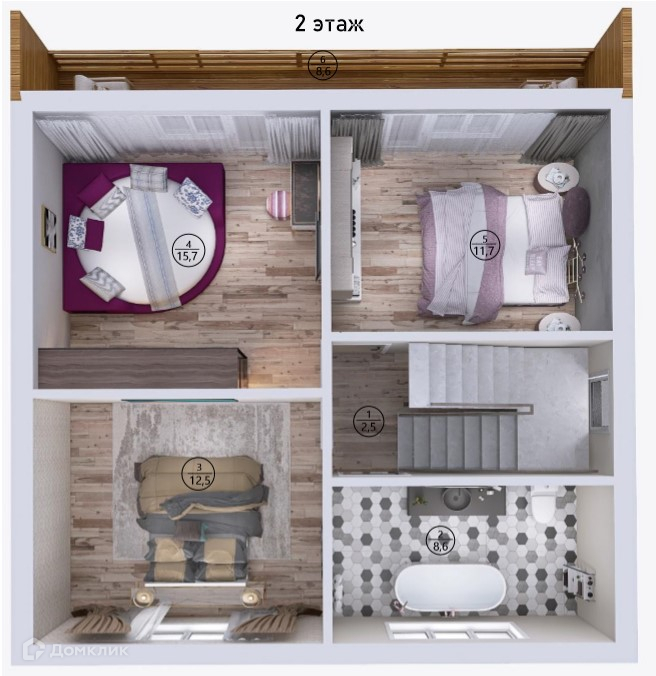 Второй этаж: коридор, 3 спальные комнаты, санузел, балкон.