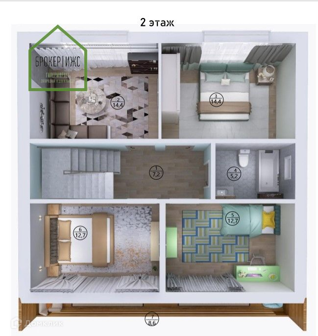 Второй этаж, это коридор 6,6м2, слева и справа от коридора располагаются спальни по 14,9 м2 и 12,4 м2. Прямо - санузел второго этажа.