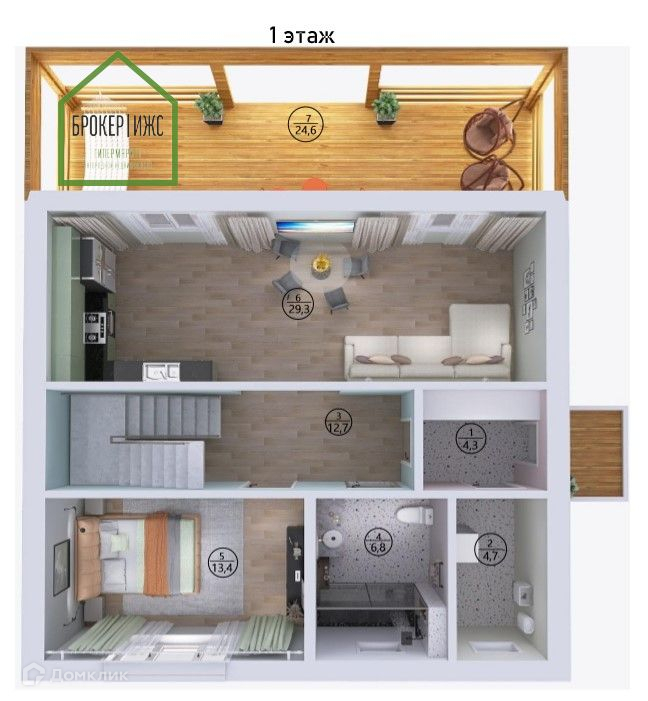 С прихожей мы с вами попадаем в коридор 12,3 м2, слева санузел, в котором уже установлены: раковина, ванная, унитаз. Далее идет гостевая комната общей площадью 13 м2. Справа от нас расположилась большая кухня-гостиная, в которой найдёт место любая компания. Кухня - гостиная открывает нам выход на просторную террасу в 23,5 м2.