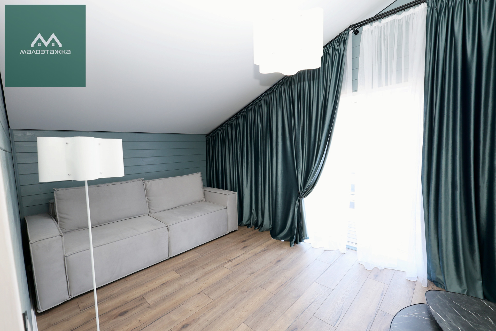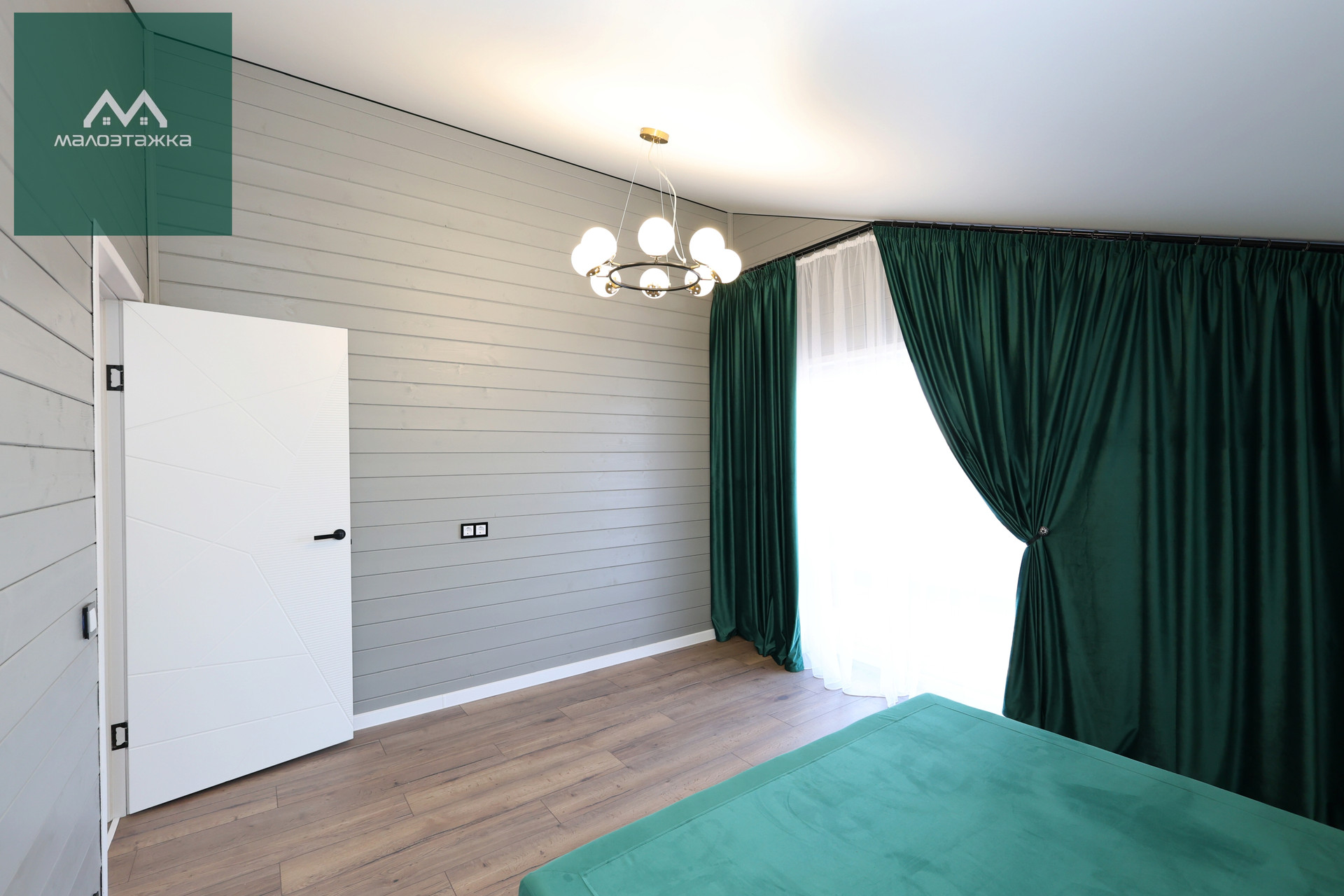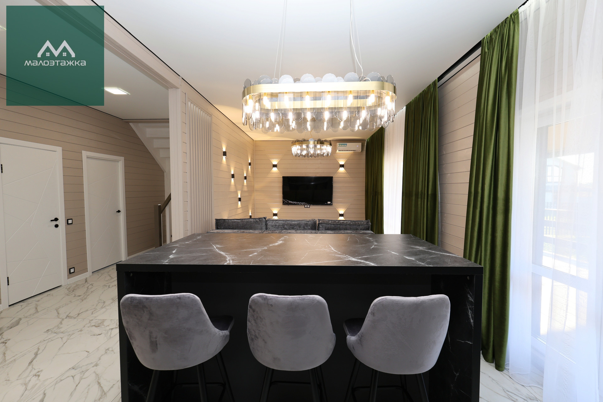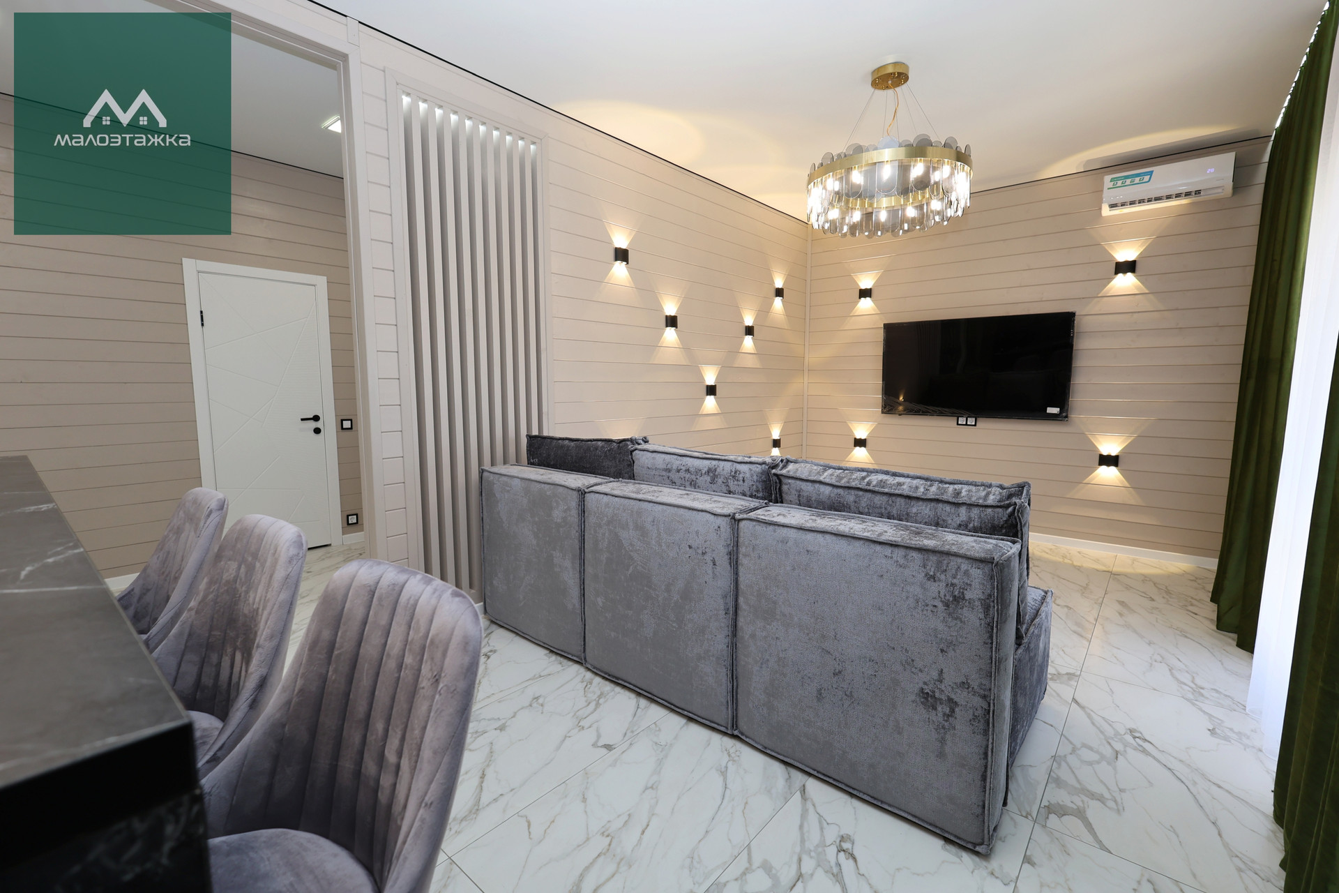 - ТВ, диван, подсветка, дизайнерские blackout шторы, панорамные окна с выходом на террасу;