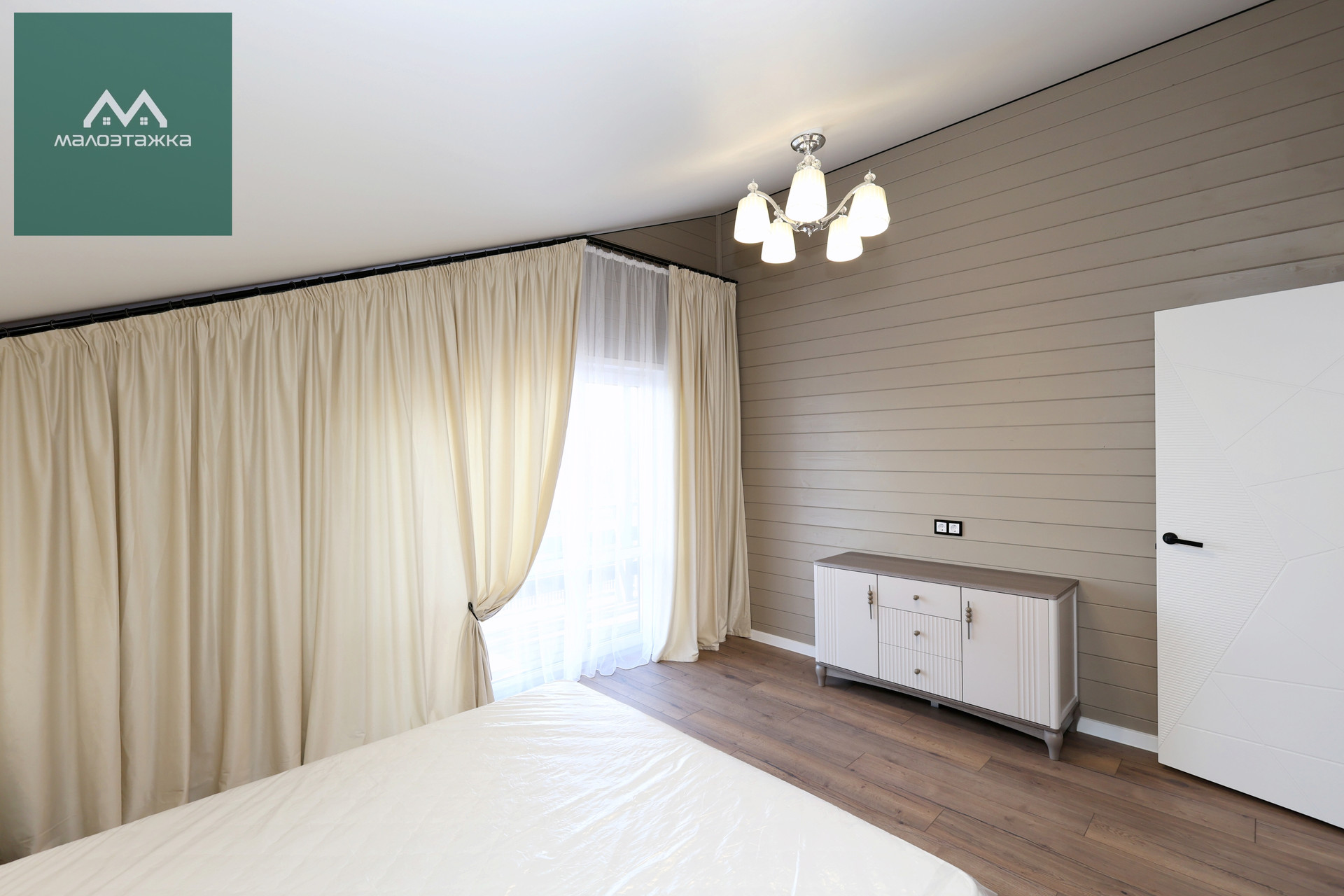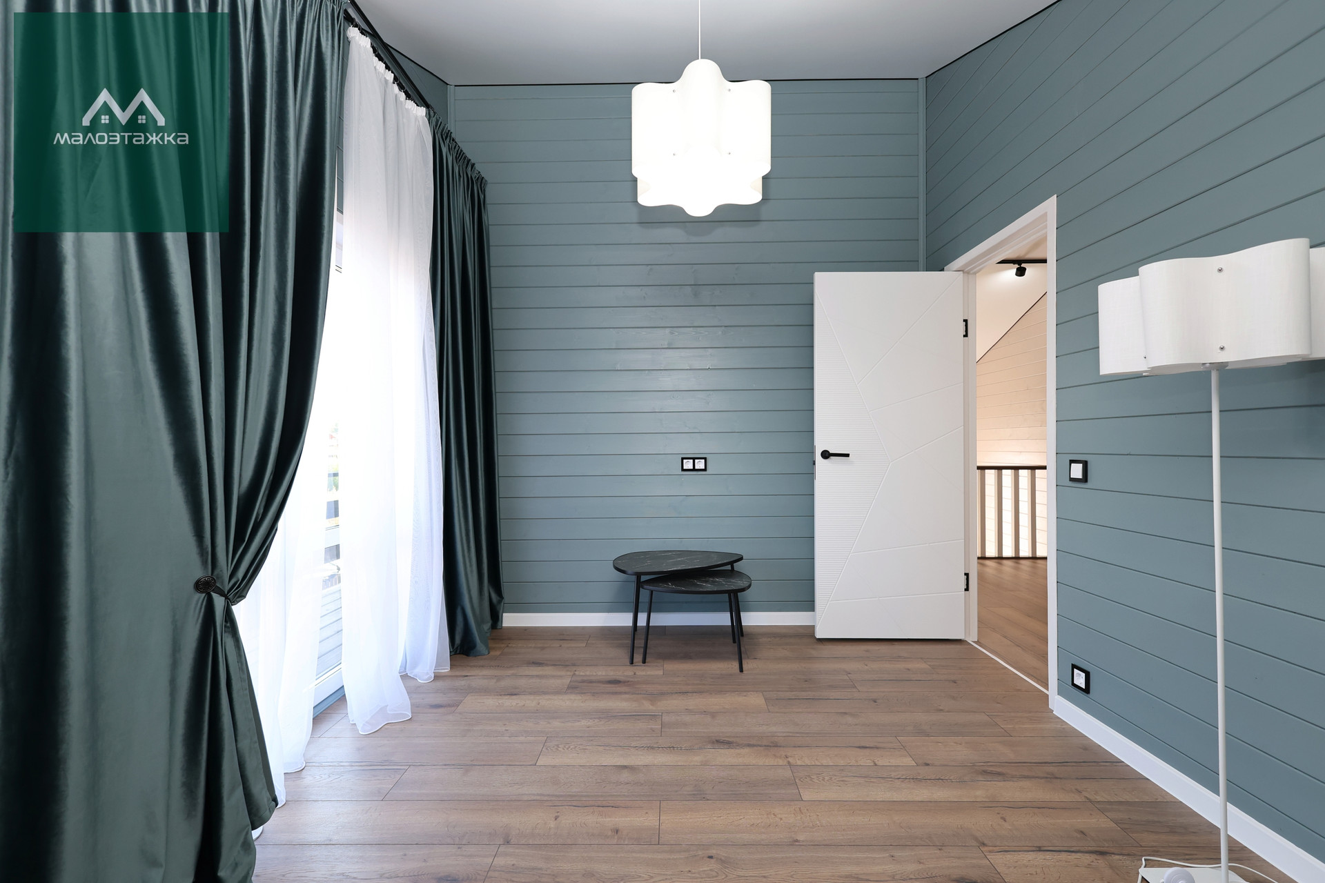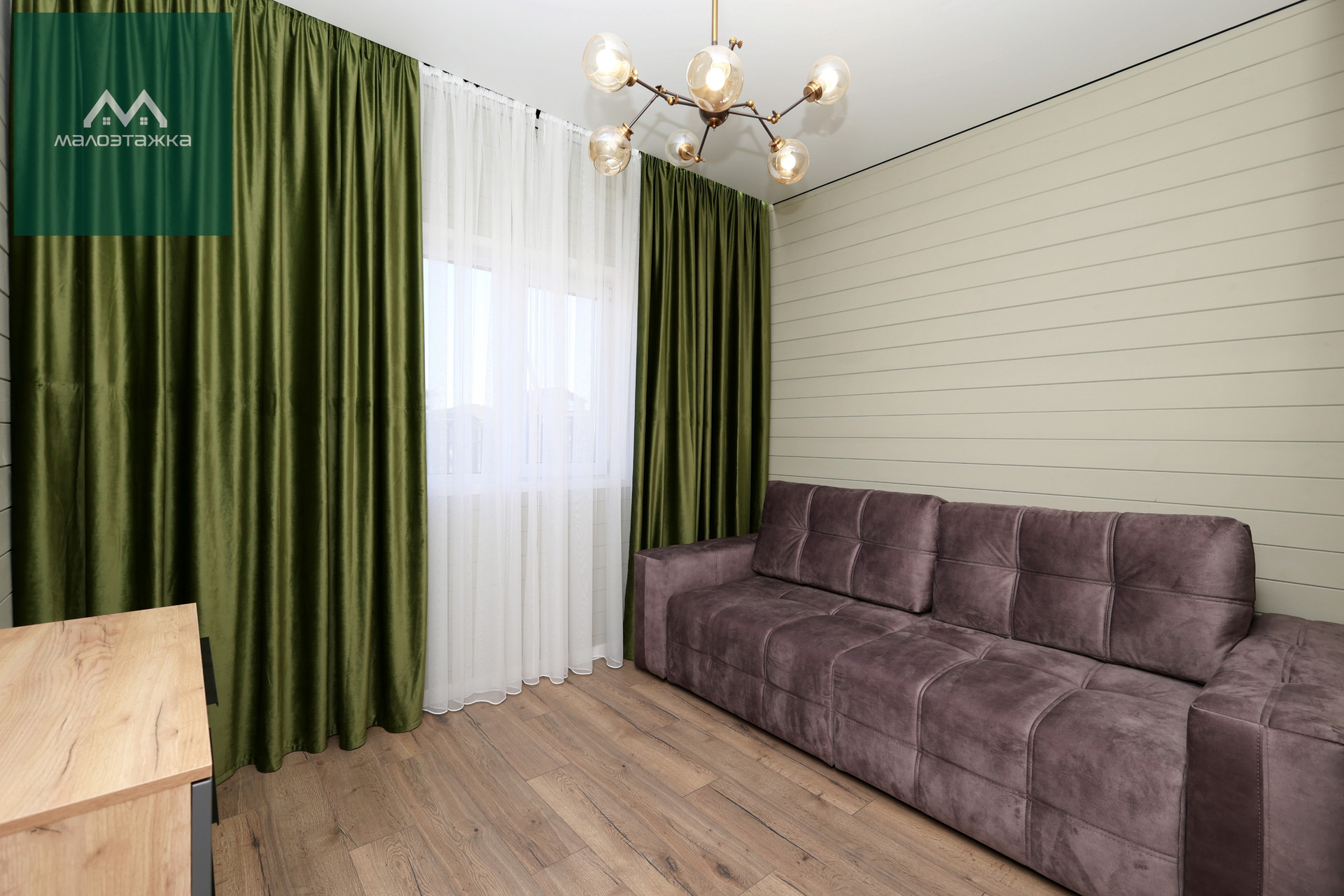 - ТВ, диван, подсветка, дизайнерские blackout шторы, панорамные окна с выходом на террасу;