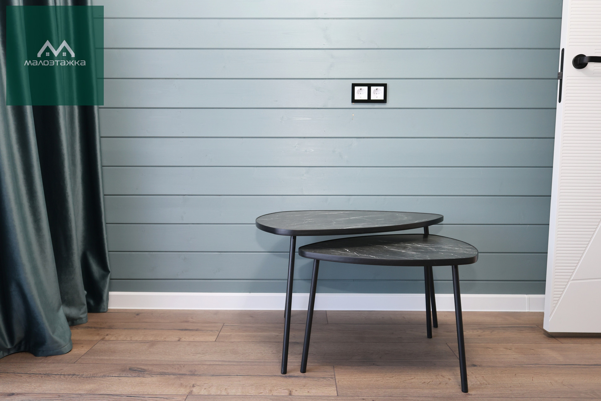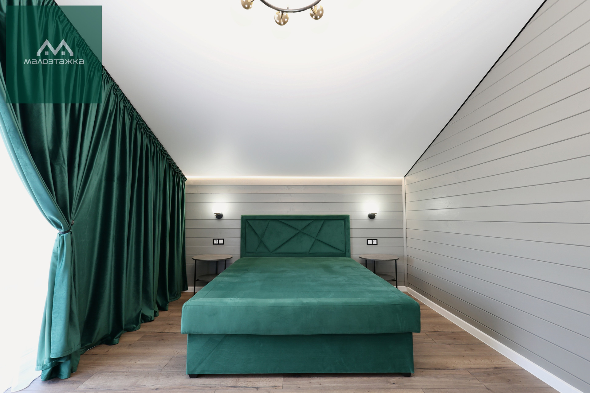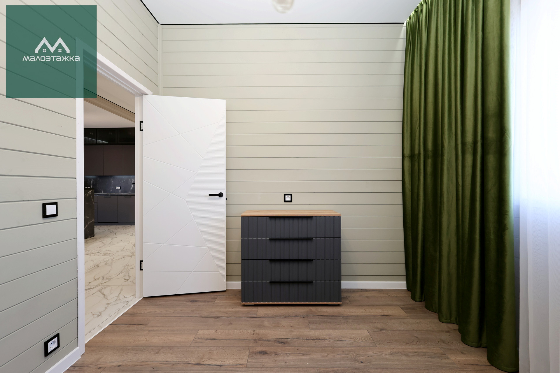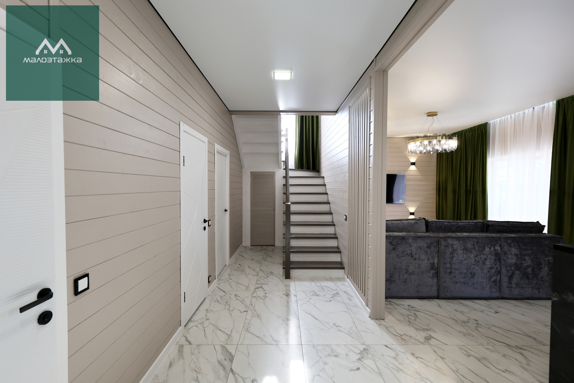 - ТВ, диван, подсветка, дизайнерские blackout шторы, панорамные окна с выходом на террасу;
