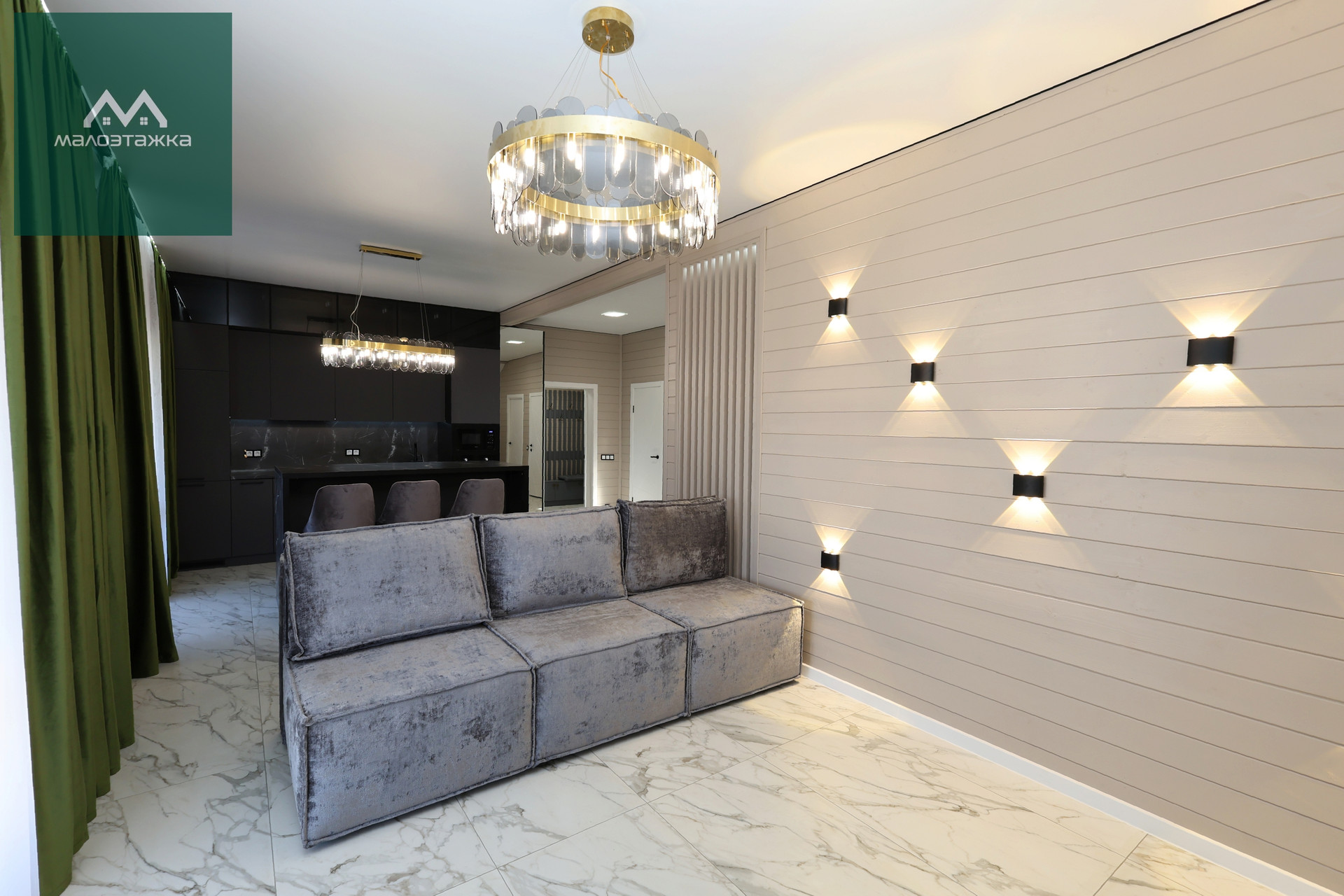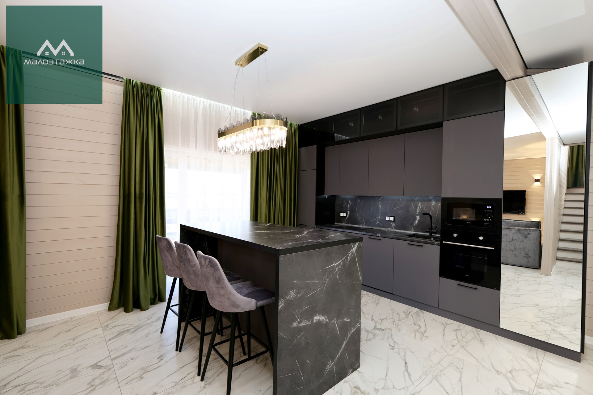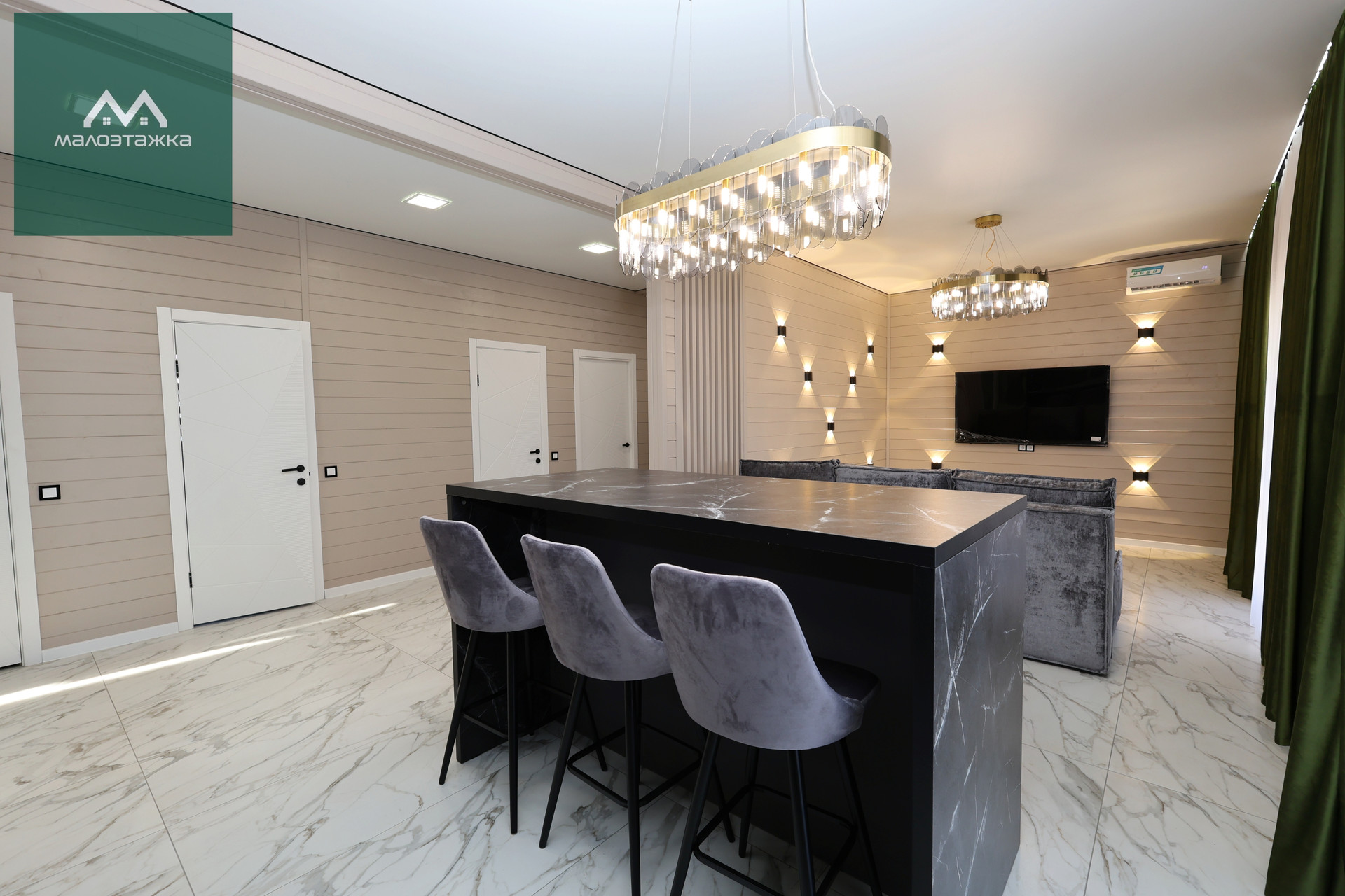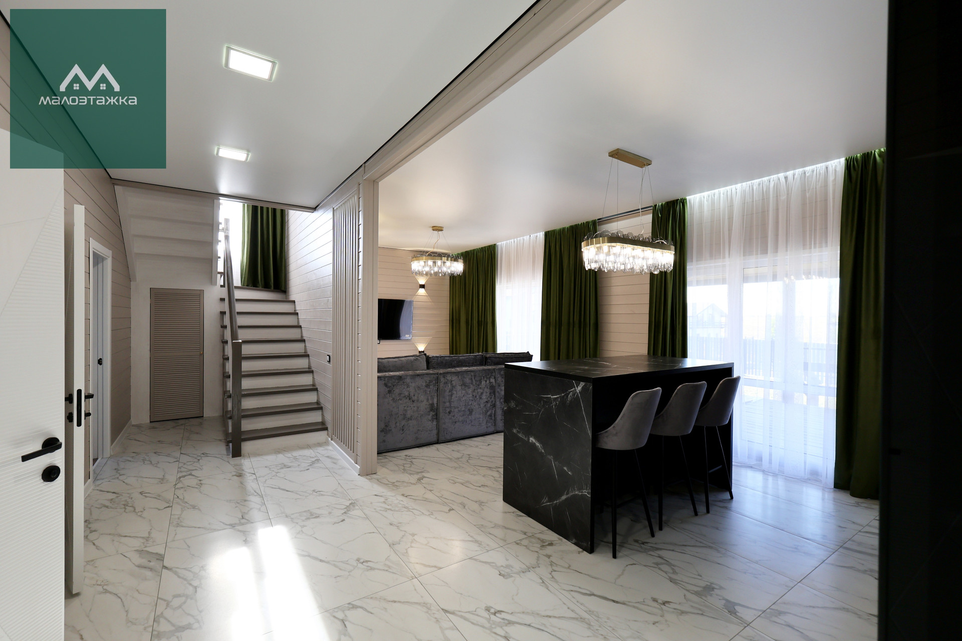 - Просторная кухня-гостиная с грамотным зонированием;