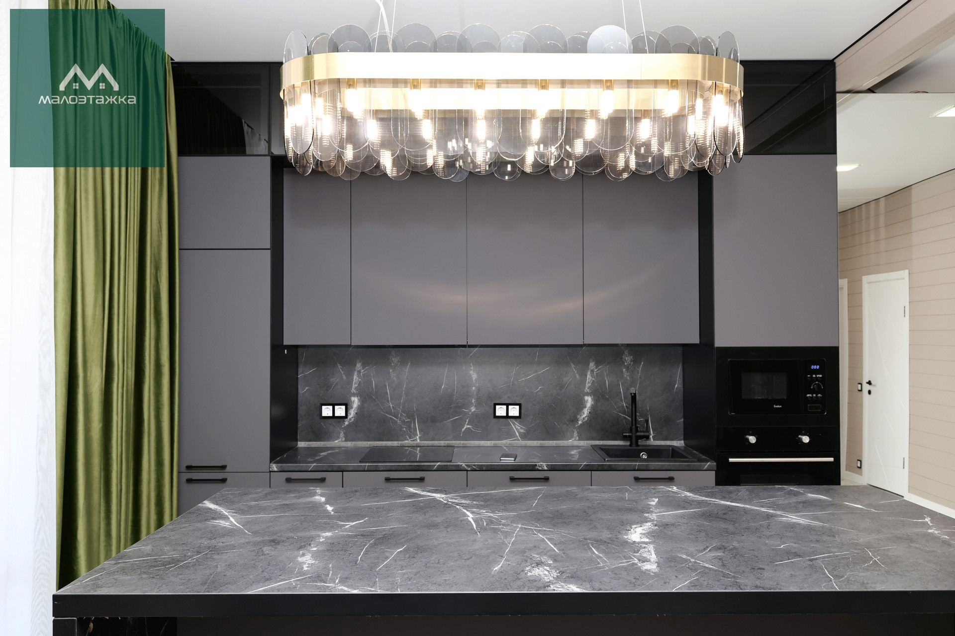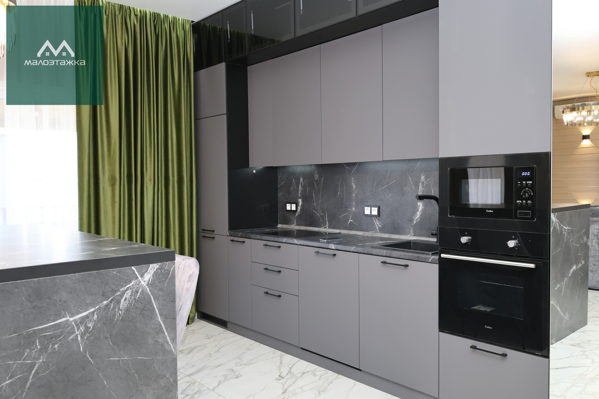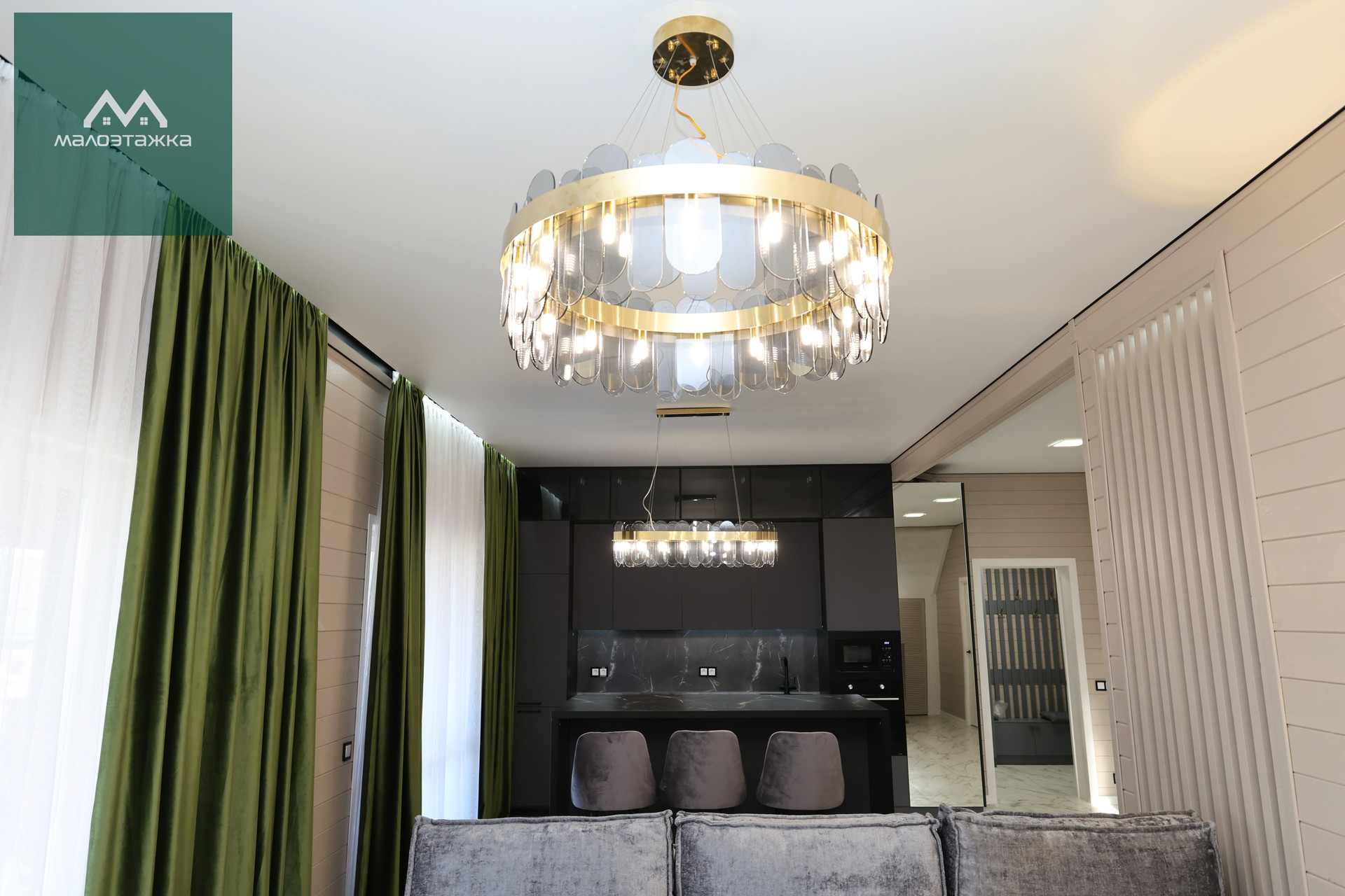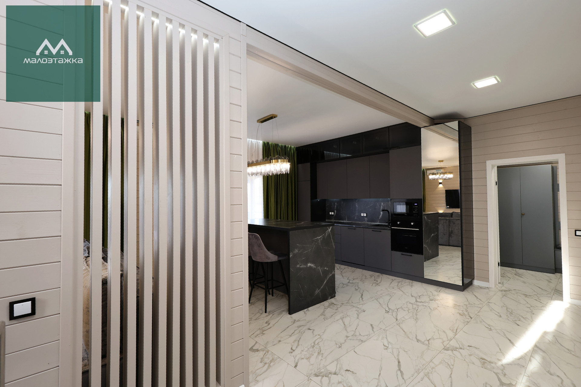 - Просторная кухня-гостиная с грамотным зонированием;