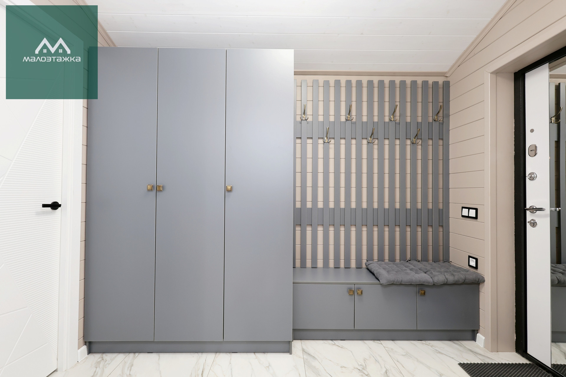 - Просторная прихожая со шкафом для верхней одежды и обувница;