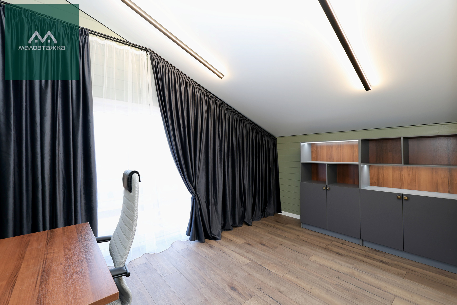 - Кабинет с системой хранения для документов и книг, рабочее место: компьютерный стол и кресло;