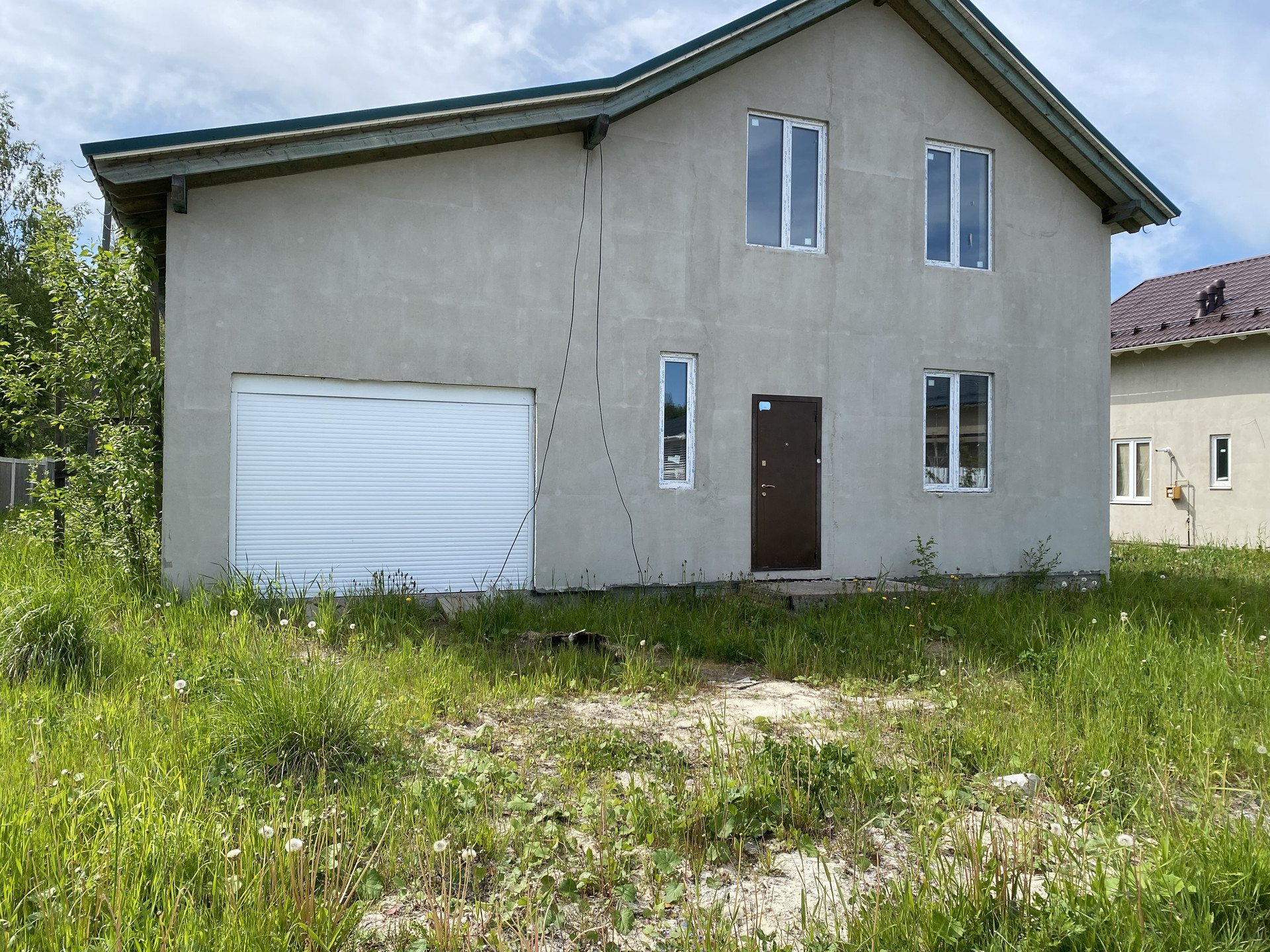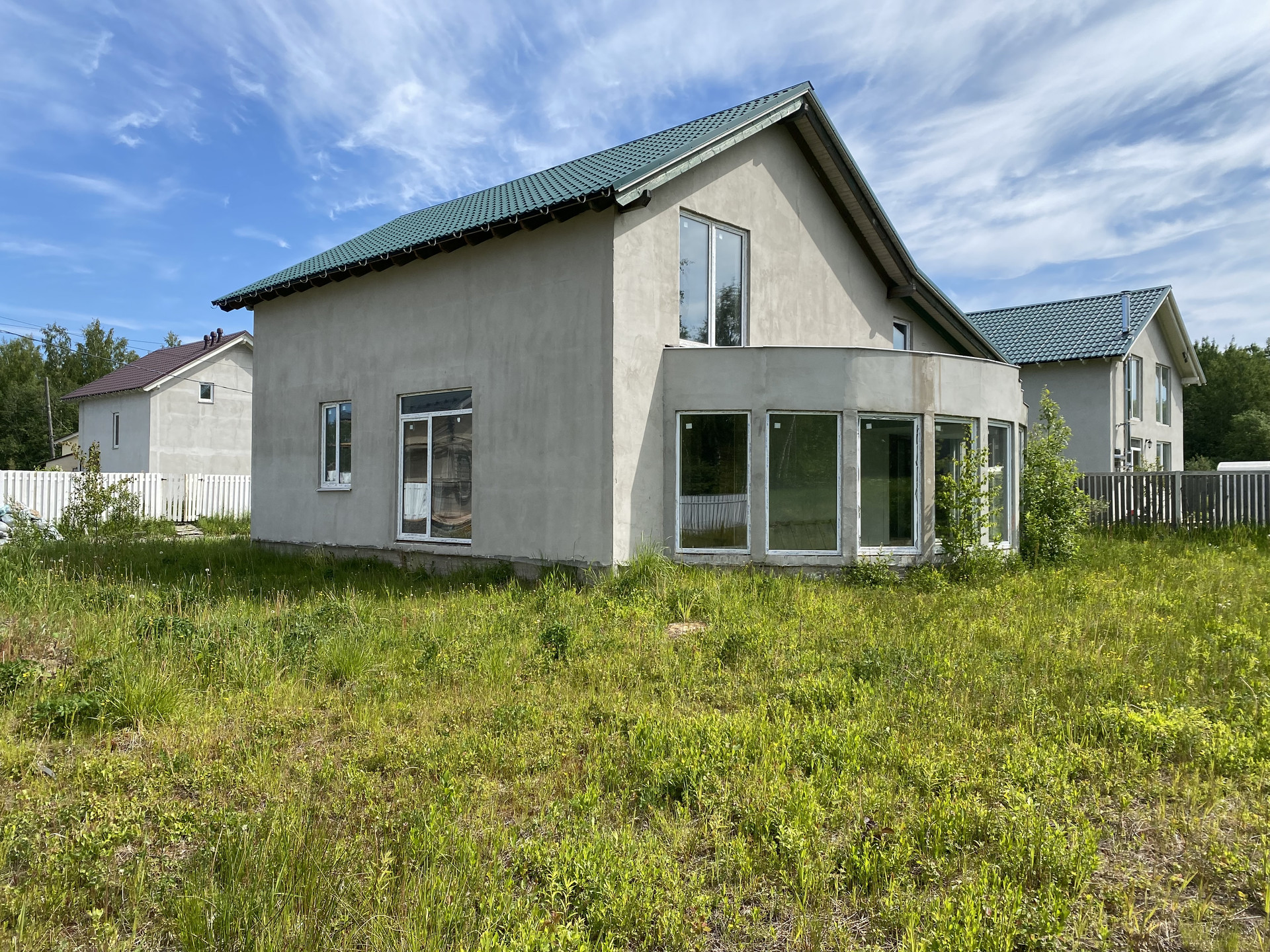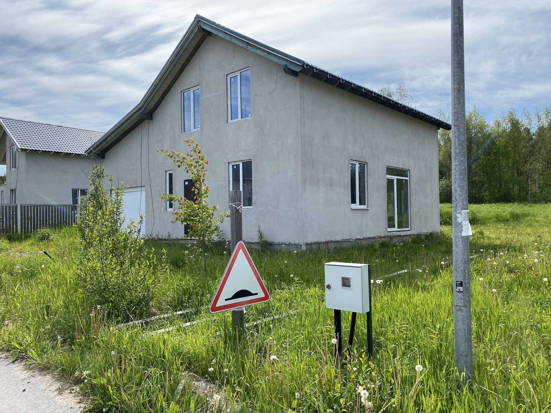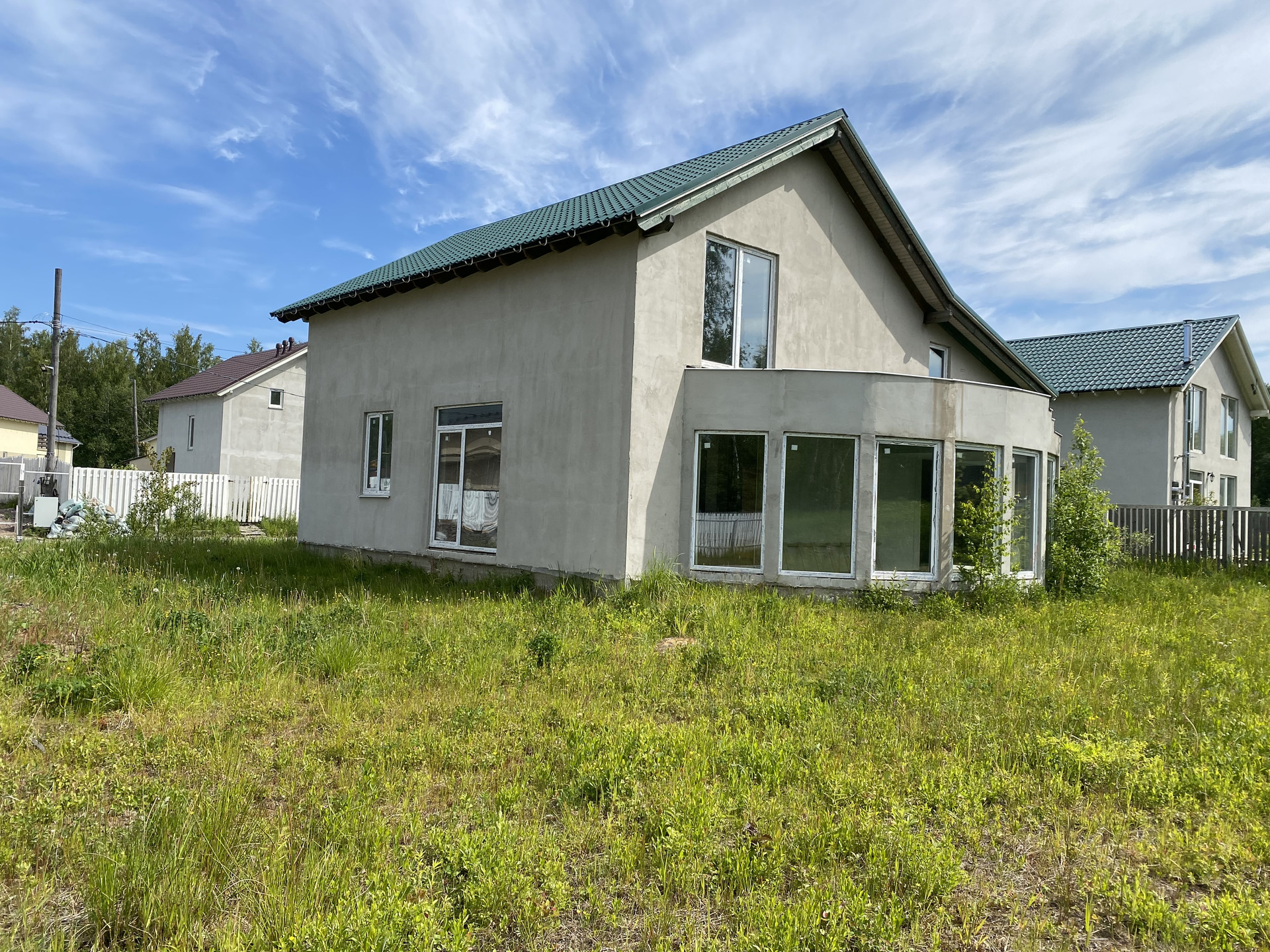 Фундамент дома цельная бетонная подушка, кровля металочерепица. Технология изготовления дома GeenEx ecohause, полистиролбетон, конструкция по шведской технологии. Внутри каркас из толстых бревен квадратного сечения. На участок проведено центральное водоснабжение и газ. Установлен электрический счетчик, планируемая подача электроэнергии 15 кв. Локальная канализация, септик Топаз. Центральная ливнево-дренажная система. Дом без внутренней отделки.