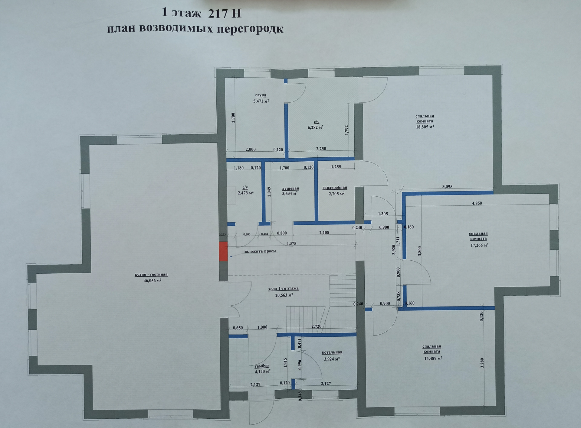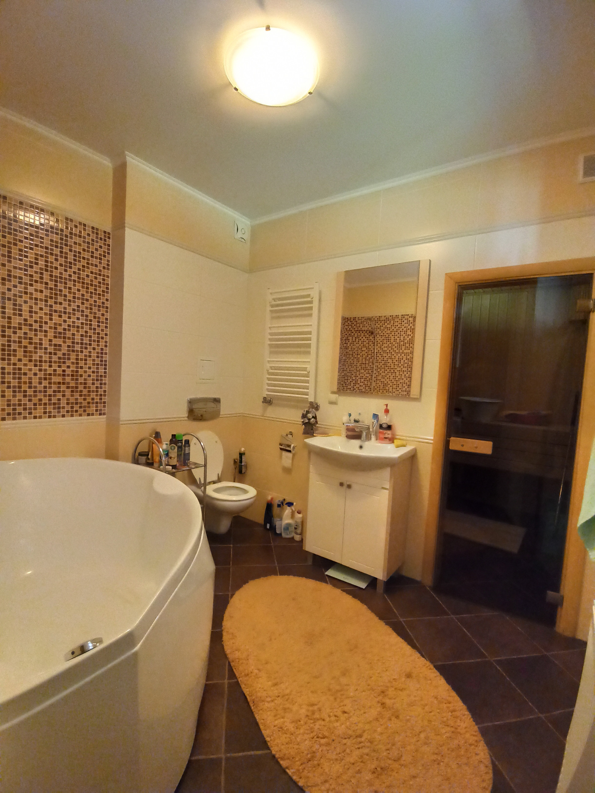 1й этаж: кухня- гостиная 46 кв. м, 3 спальных комнаты (15-17-19) кв.м, гардеробная, 2 с/у, душевая, финская сауна, выход на террасу.