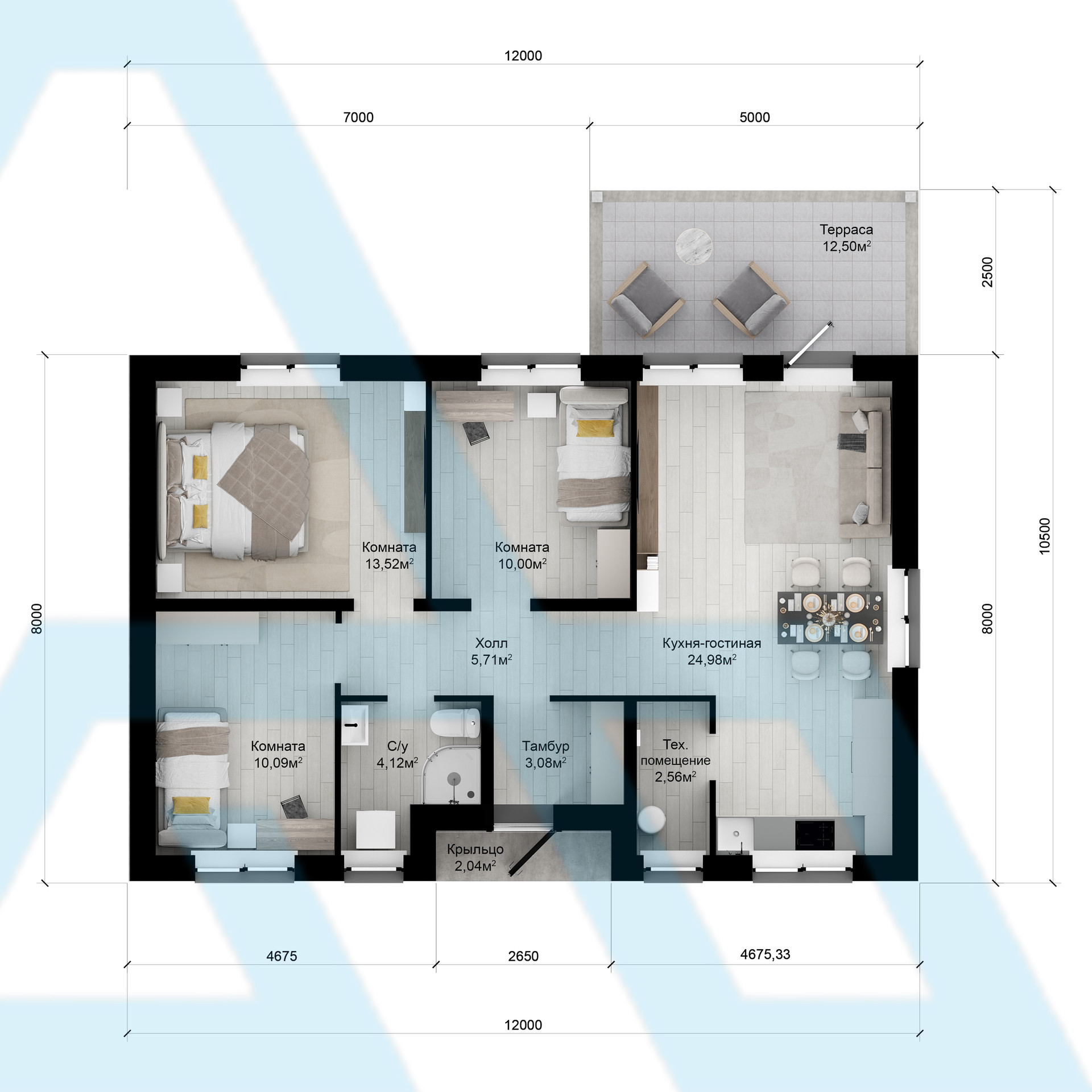 В доме кухня-гостиная 25 кв. м с выходом на террасу 12,5 кв. м, три комнаты 13,5 кв. м, 10 кв. м, 10 кв. м, а также санузел, техническое помещение, холл и тамбур.